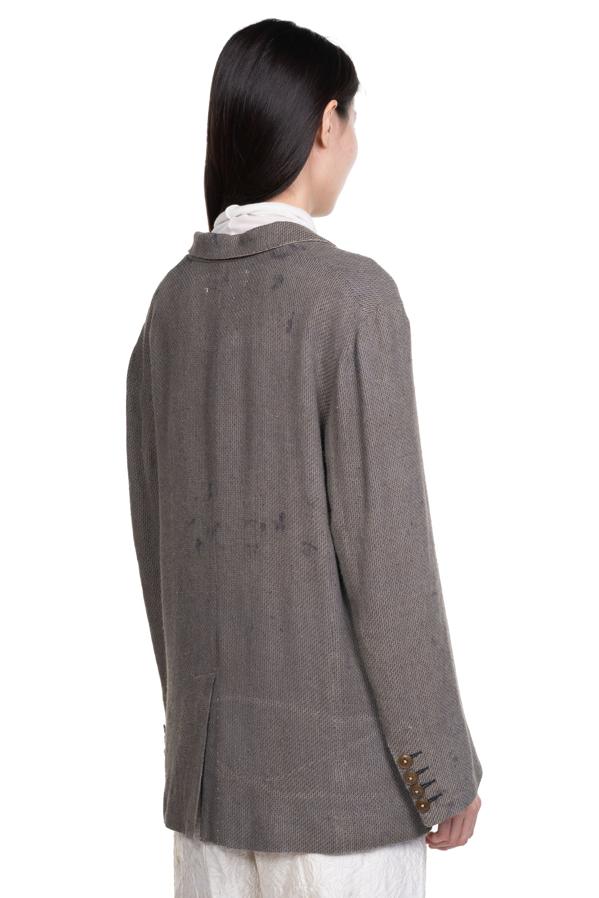 Grey jacket in Silk from Mute Dance. Long sleeves. Button closure at front. Metallic buttons. Signature dye throughout. Two front pockets. Lined.