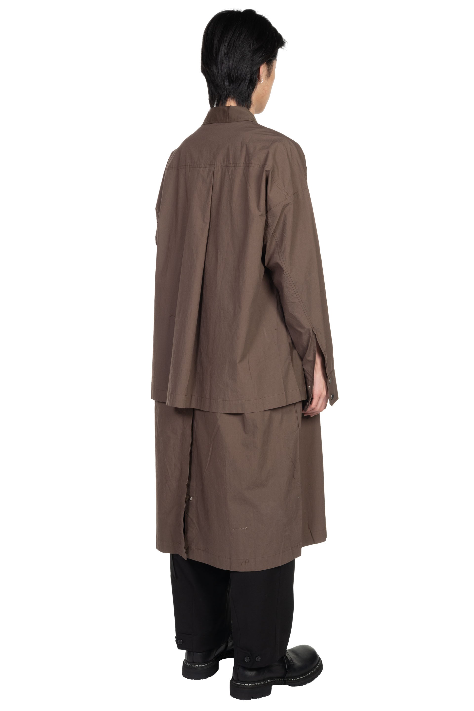 Oversized layered outer with a concealed snap button closure. Shirt collar and two sets of stack pockets at the chest. The pocket bag of the upper pocket doubles as the pocket flap of the one below it. Tonal elasticised drawstrings with matte silver fastenings at side seams. Box pleat and a single vent at the back bodice with two concealed snap button fastenings.