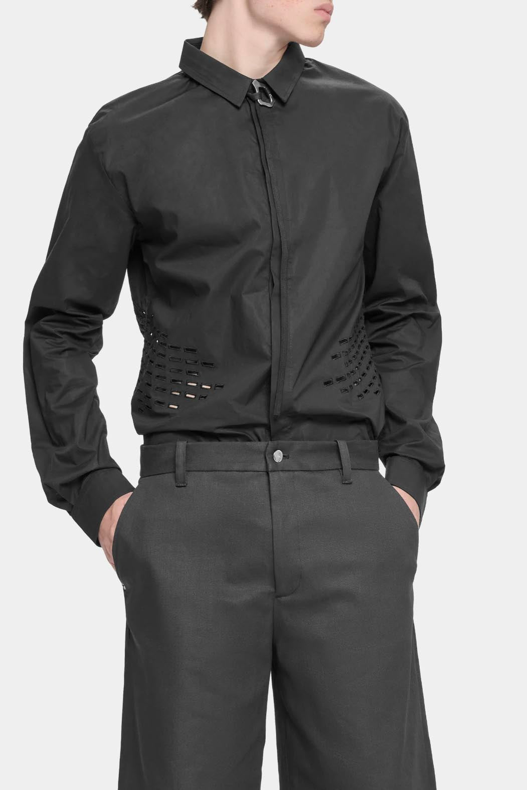 HE classic shirt with a stand collar made out of a soft poplin fabric. It features embroidered laser-cut designs on both the front and back for a unique, textured detail. The shirt has a straight fit and straight hem, finished with one-button cuffs.