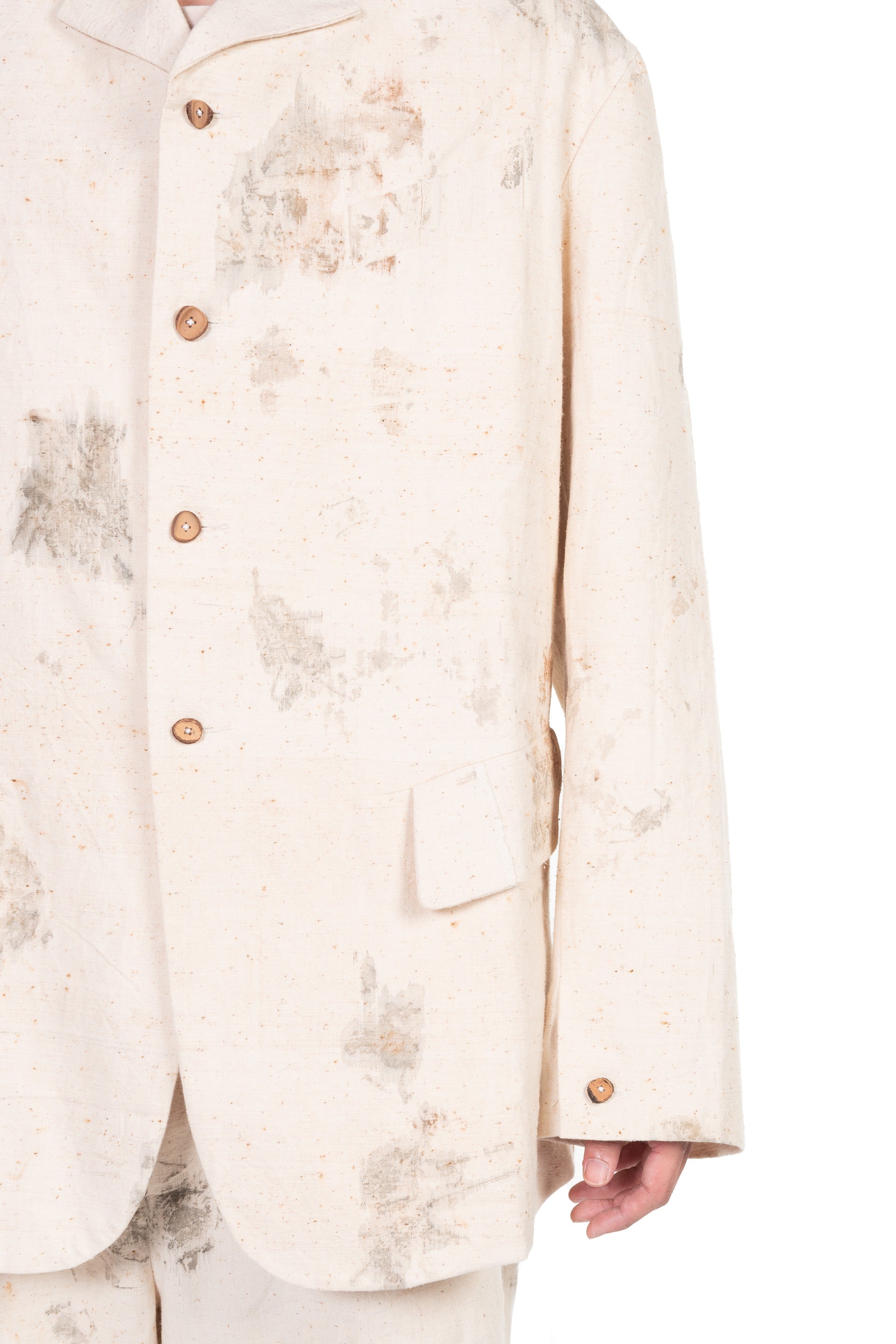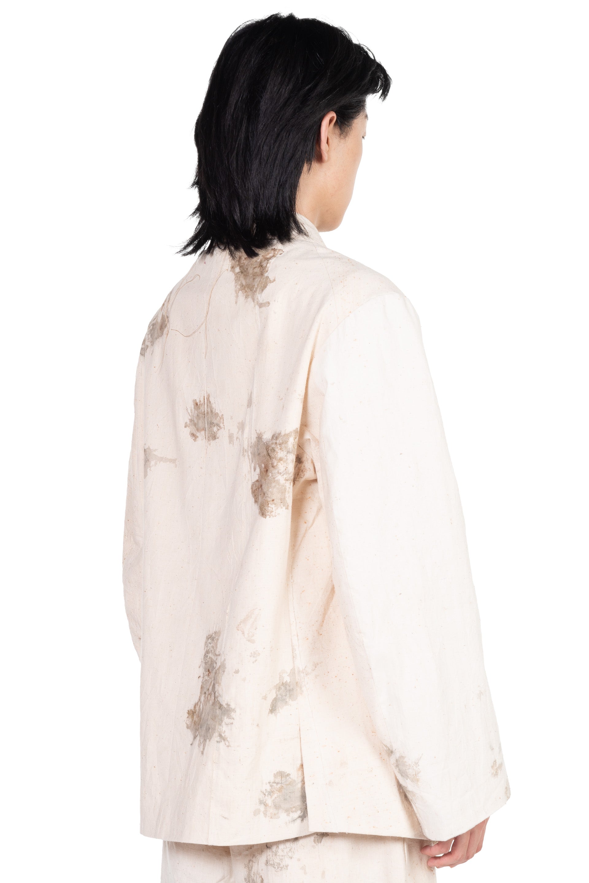 Peng Tai creates modern silhouette with traditional chinese philosophy. Inspired by how Chinese herbal medicine regulates the body from the inside out, Peng Tai aims to research and develop a way to boil Chinese herbal medicine with fabrics, to create clothes that feel like a second skin as seen with the Hand Dyed Handwoven Cotton Panelled Blazer.