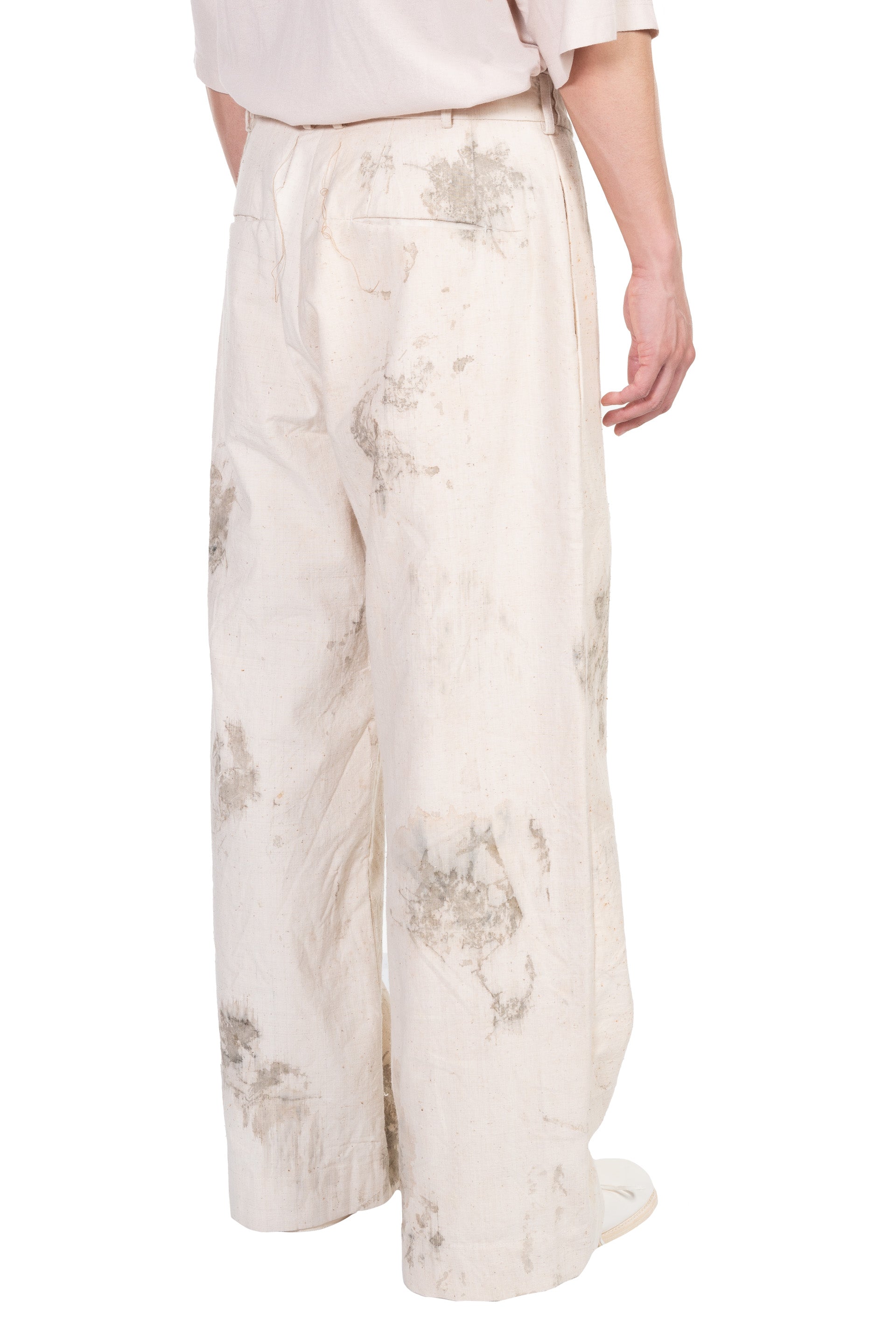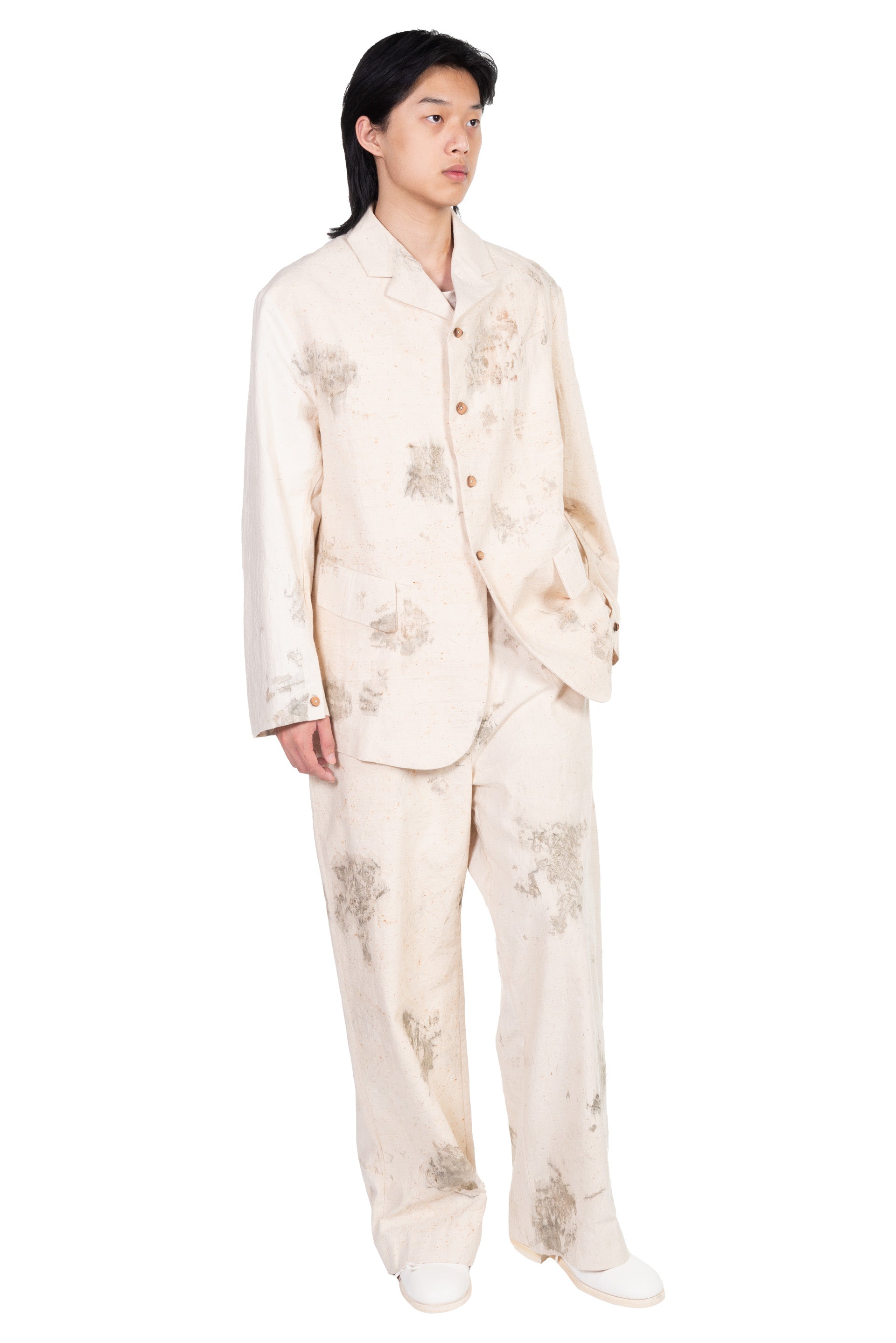Peng Tai creates modern silhouette with traditional chinese philosophy. Inspired by how Chinese herbal medicine regulates the body from the inside out, Peng Tai aims to research and develop a way to boil Chinese herbal medicine with fabrics, to create clothes that feel like a second skin as seen with the Hand Dyed Handwoven Cotton Panelled Pants.