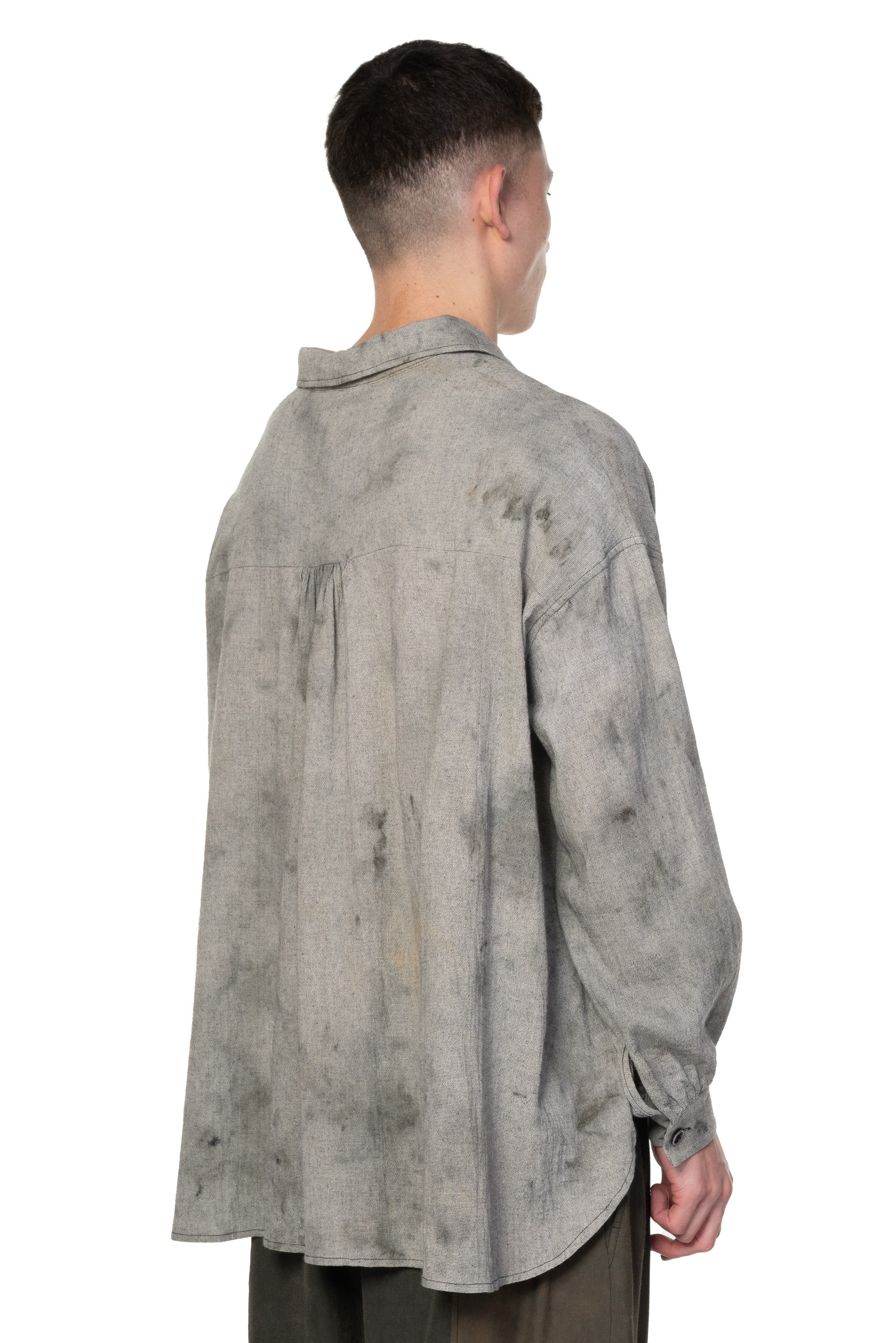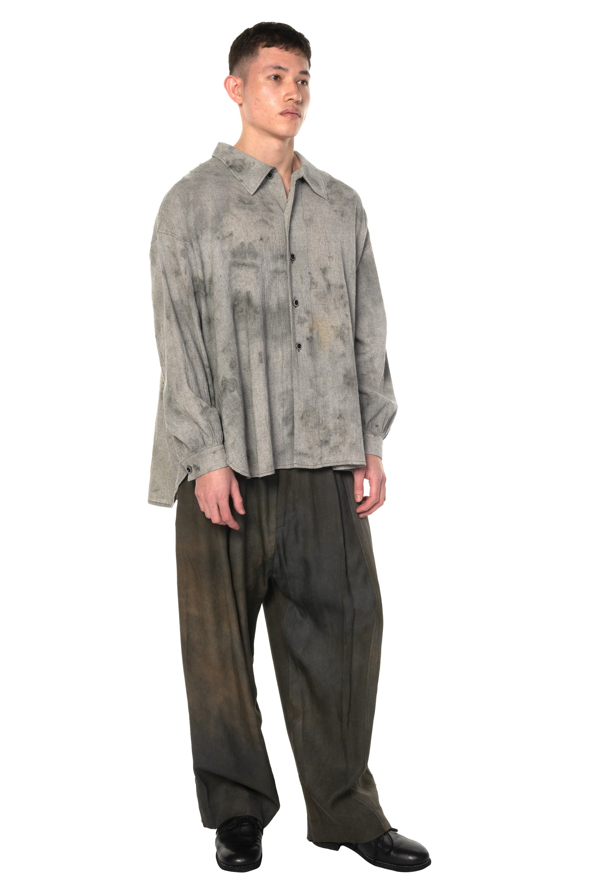 Peng Tai creates modern silhouette with traditional chinese philosophy. Inspired by how Chinese herbal medicine regulates the body from the inside out, Peng Tai aims to research and develop a way to boil Chinese herbal medicine with fabrics, to create clothes that feel like a second skin as seen with the Hand Dyed LS Shirt Grey Dye.