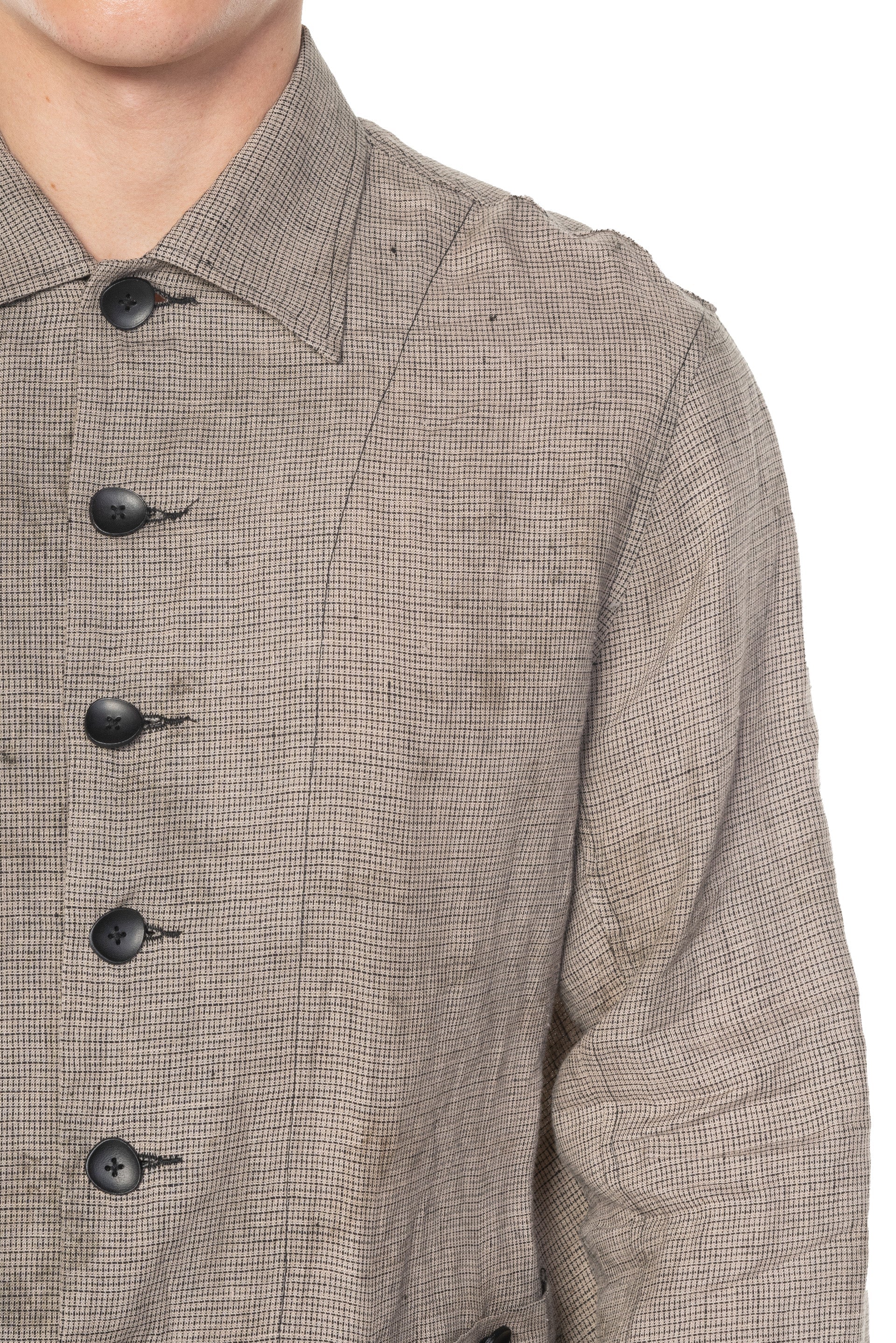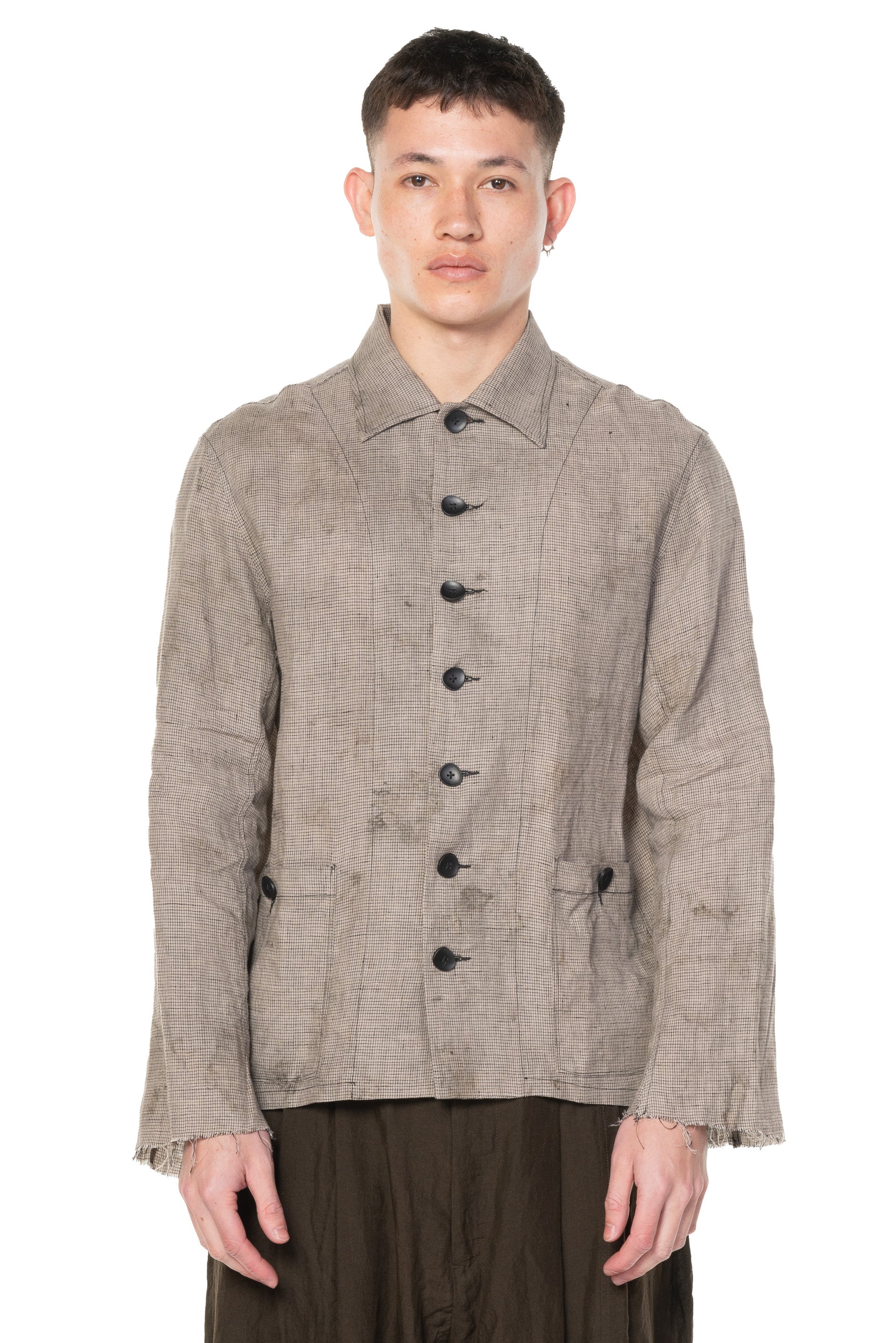 Regular fit jacket shirt. Button closure at front. Leather buttons. Long sleeves. Two front pockets at bottom with button closure. Light linen hand dyed fabric.