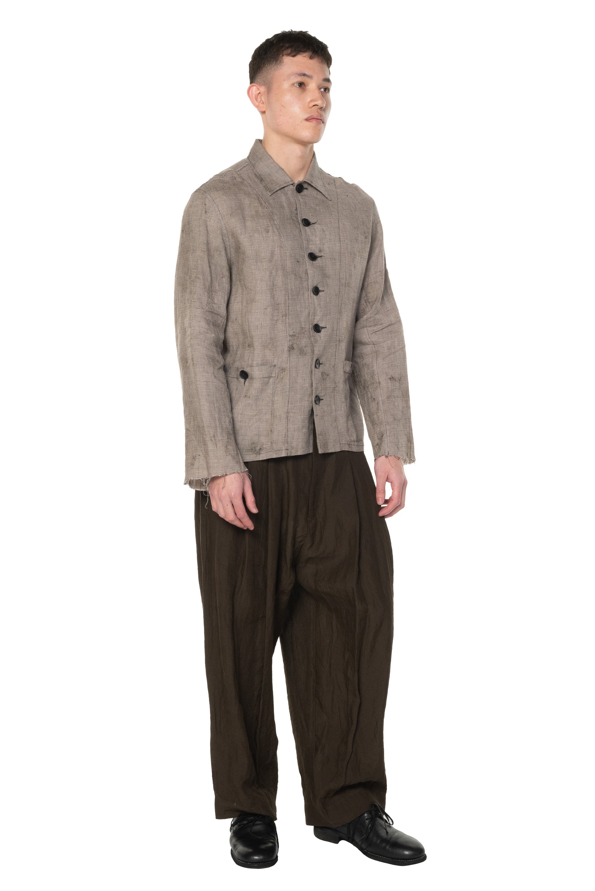 Peng Tai creates modern silhouette with traditional chinese philosophy. Inspired by how Chinese herbal medicine regulates the body from the inside out, Peng Tai aims to research and develop a way to boil Chinese herbal medicine with fabrics, to create clothes that feel like a second skin as seen with the Hand Dyed LS Shirt Woodworm.