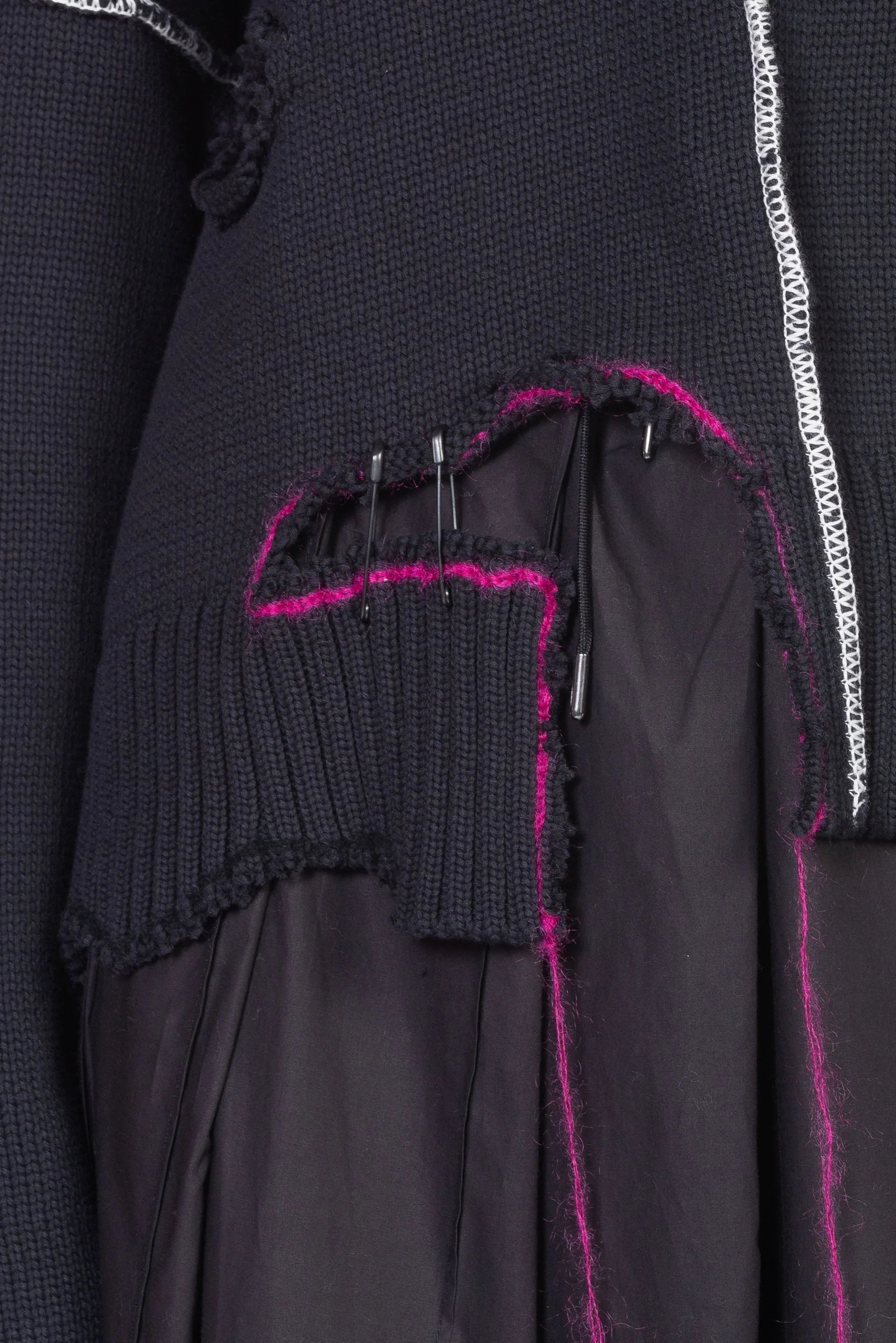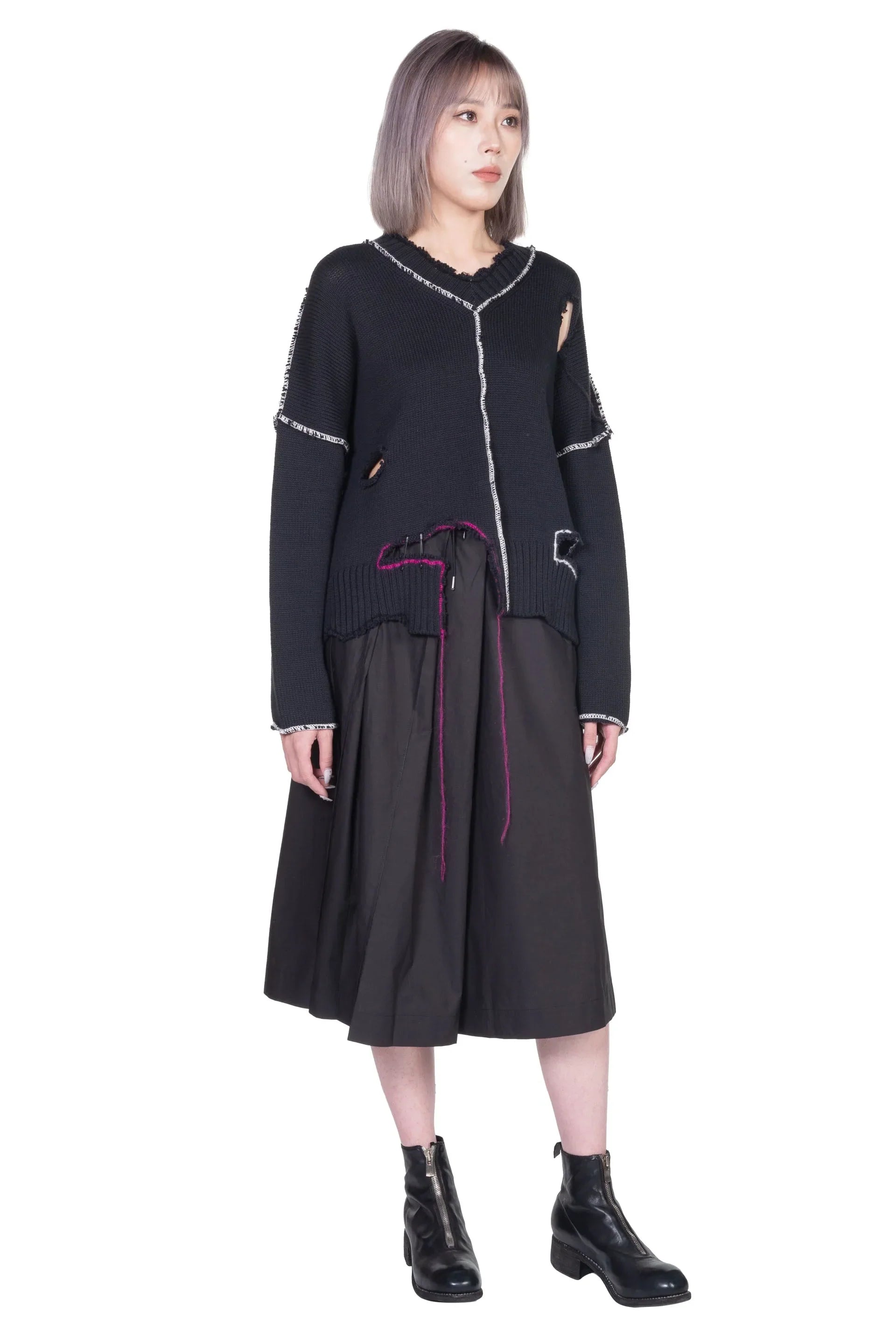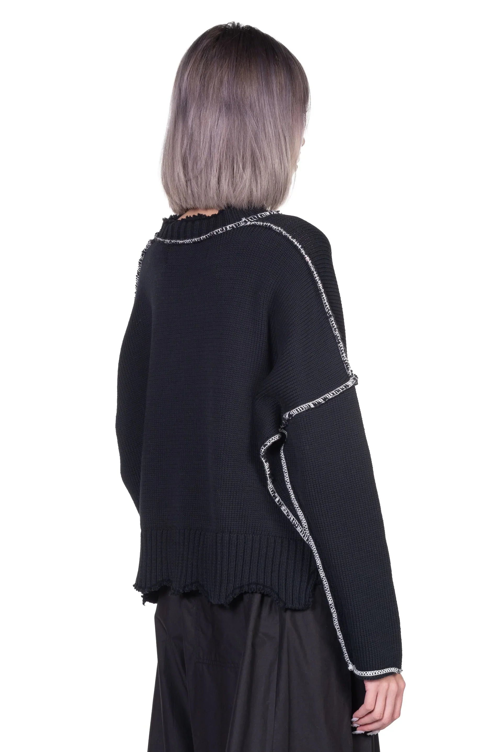 V-neck cotton jumper with ripped and cut out hand made details. External coloured seams and floating threads. Regular fit.