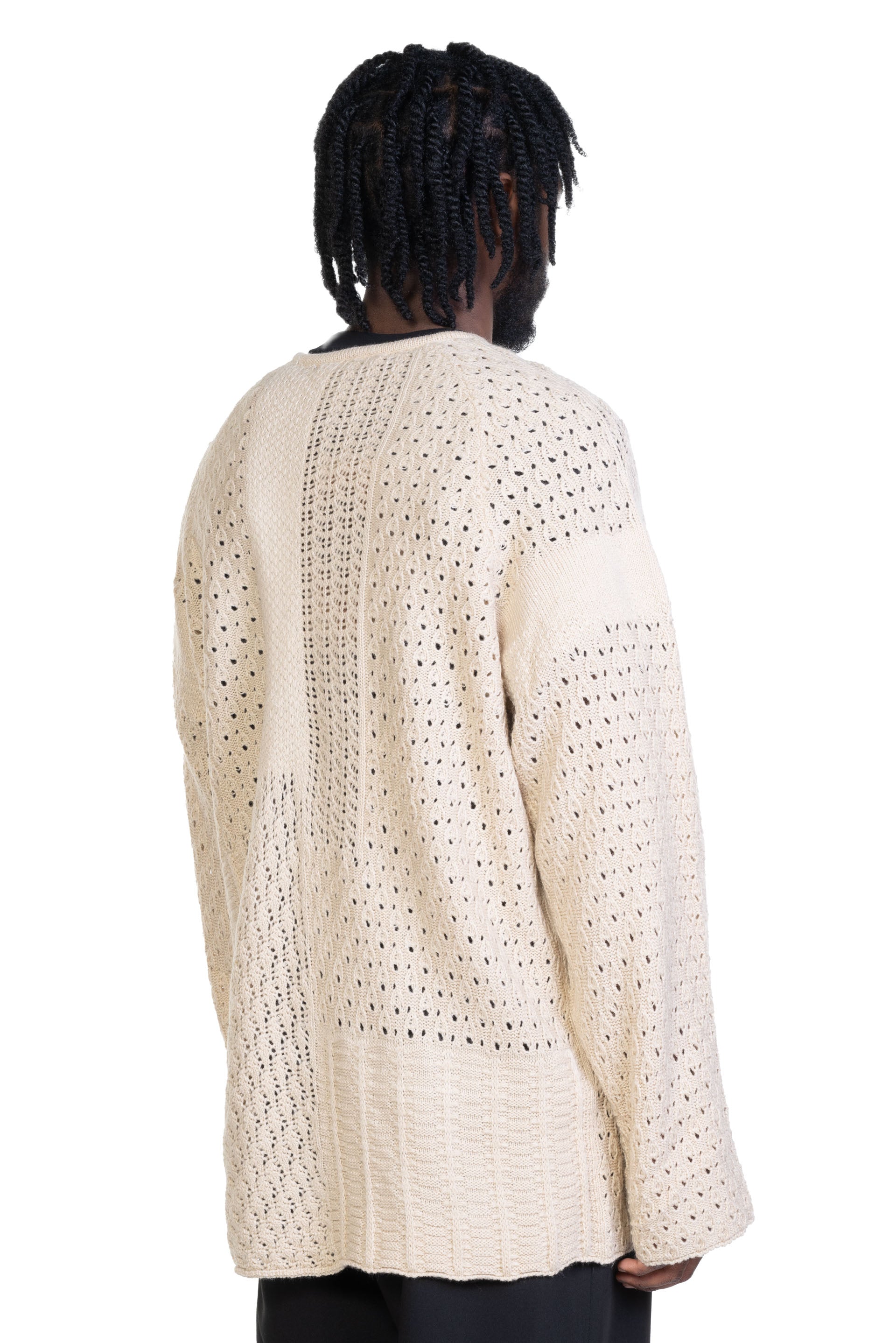 "Cultural Historical Sustainability" with a foundation of Japanese aestheticism, Wabi-Sabi and Mono-No-Aware, Chiahung Su's garments are inspired by the beauty of impermanence and imperfection. The fabrics and dyes used in his creations are almost entirely natural, with Japanese vintage fabrics and traditional handwoven textiles from Taiwan's indigenous tribes honouring traditional artisanal techniques passed down through generations as seen with the Hand Made Patchwork Knitted Jacket Beige.
