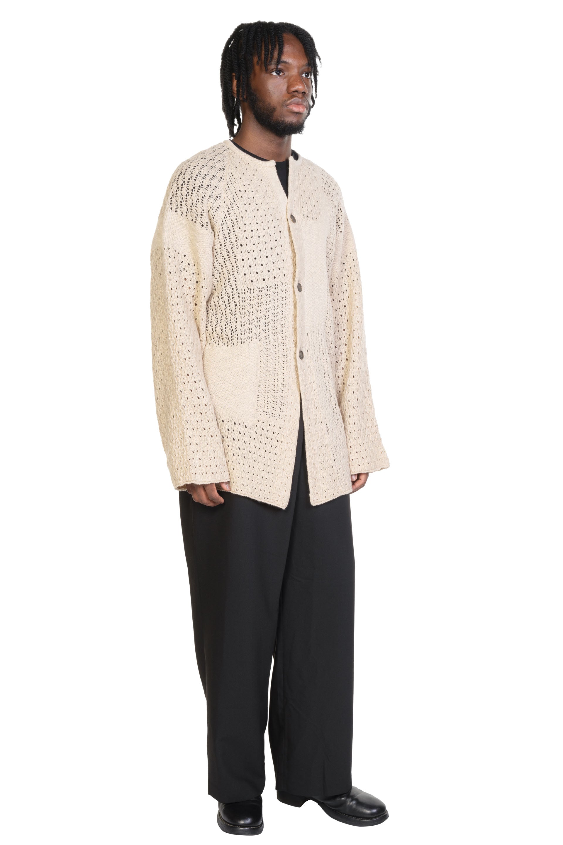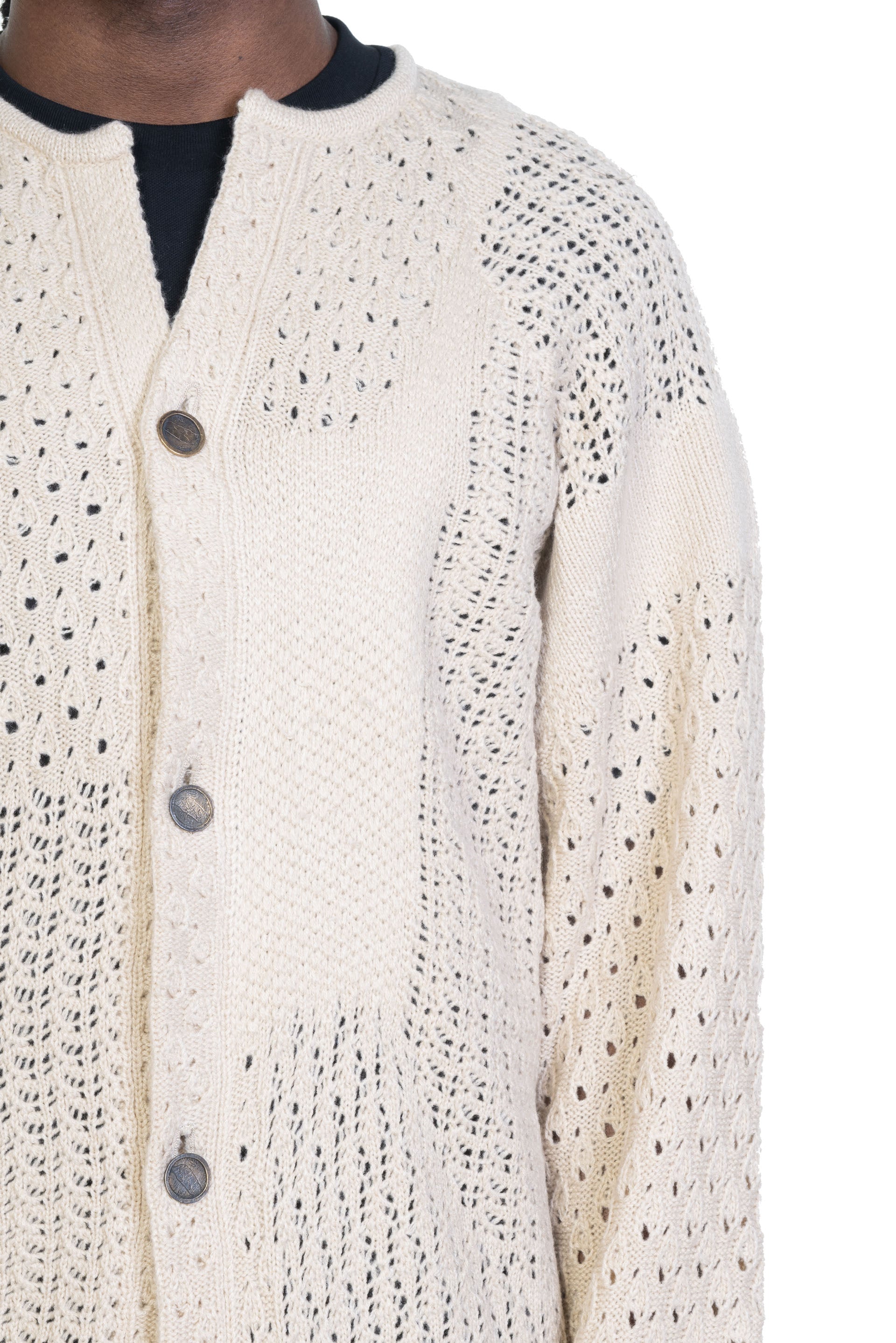 Chiahung su knitted Jacket in beige. Long sleeves. Button closure at front. Antique metal button. Patchwork knit throughout. Relaxed fit.