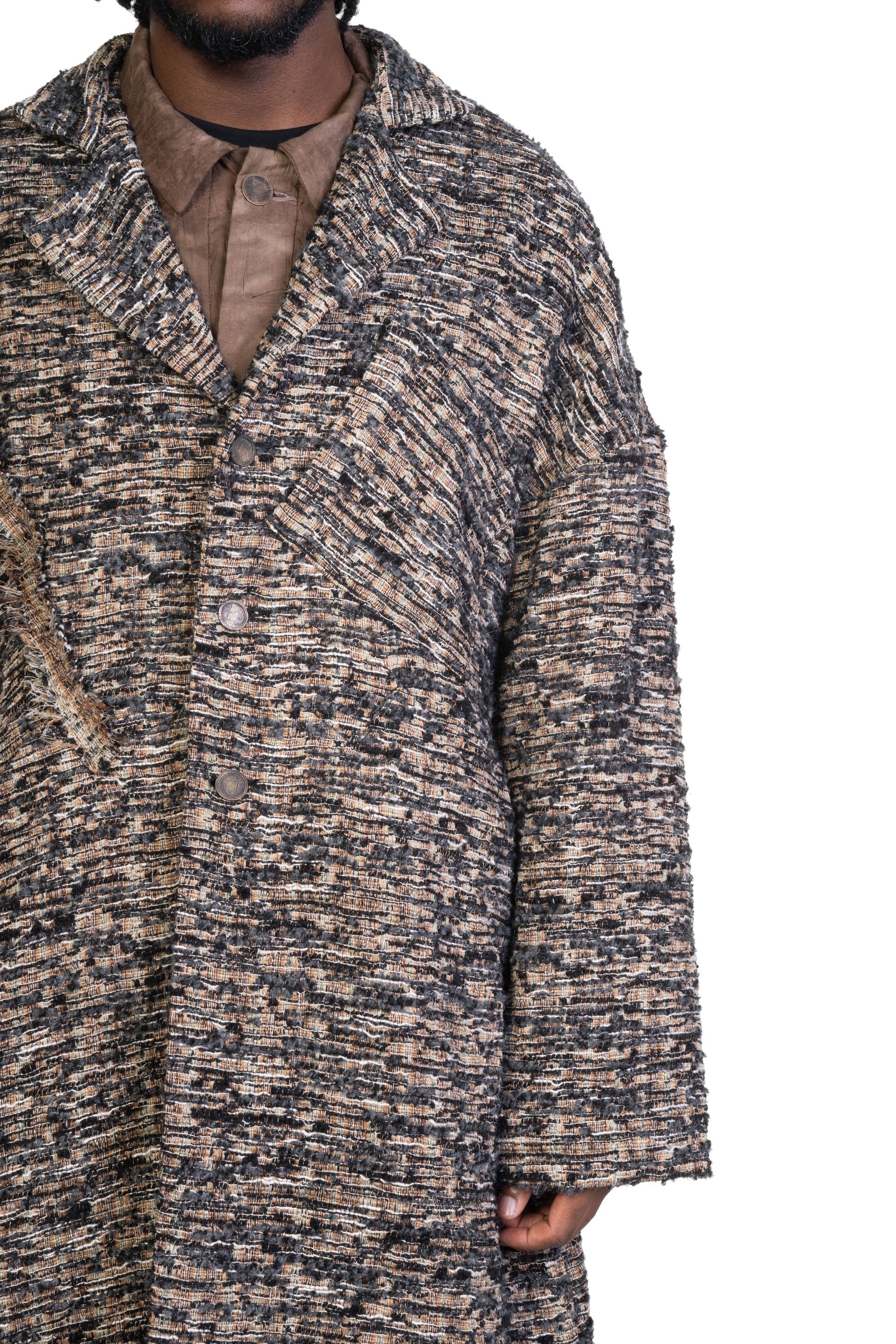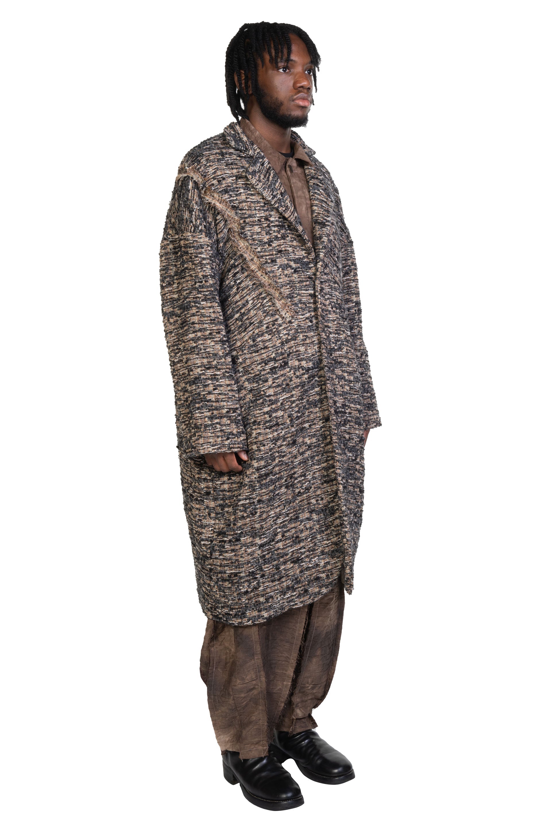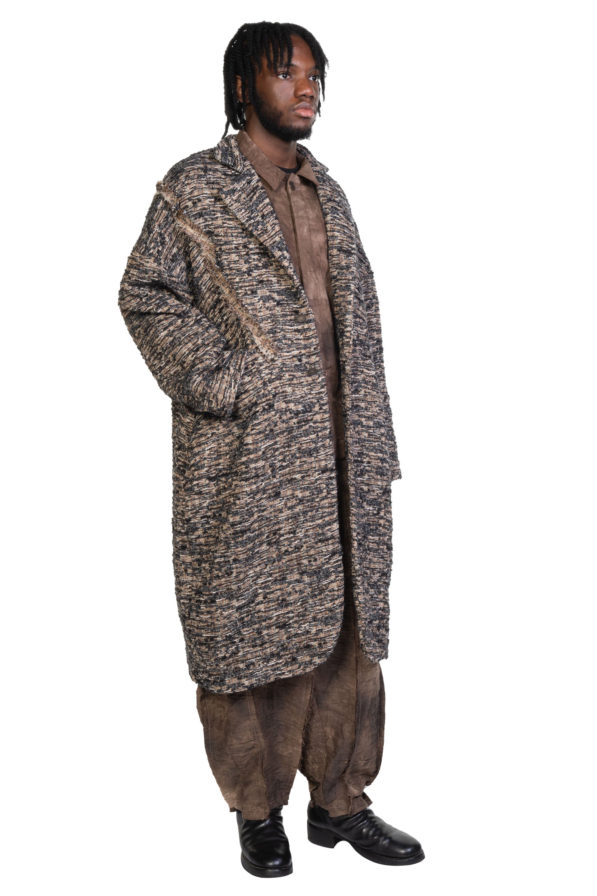 "Cultural Historical Sustainability" with a foundation of Japanese aestheticism, Wabi-Sabi and Mono-No-Aware, Chiahung Su's garments are inspired by the beauty of impermanence and imperfection. The fabrics and dyes used in his creations are almost entirely natural, with Japanese vintage fabrics and traditional handwoven textiles from Taiwan's indigenous tribes honouring traditional artisanal techniques passed down through generations as seen with the Hand Woven Rawing Single-Breasted Coat.