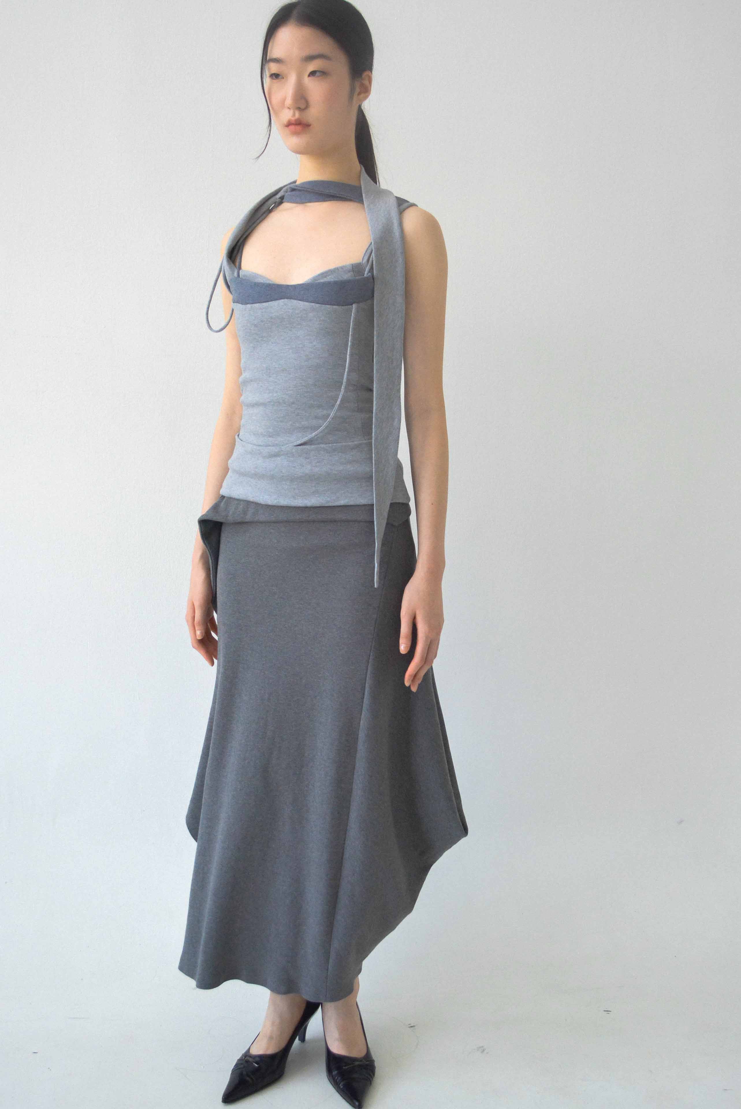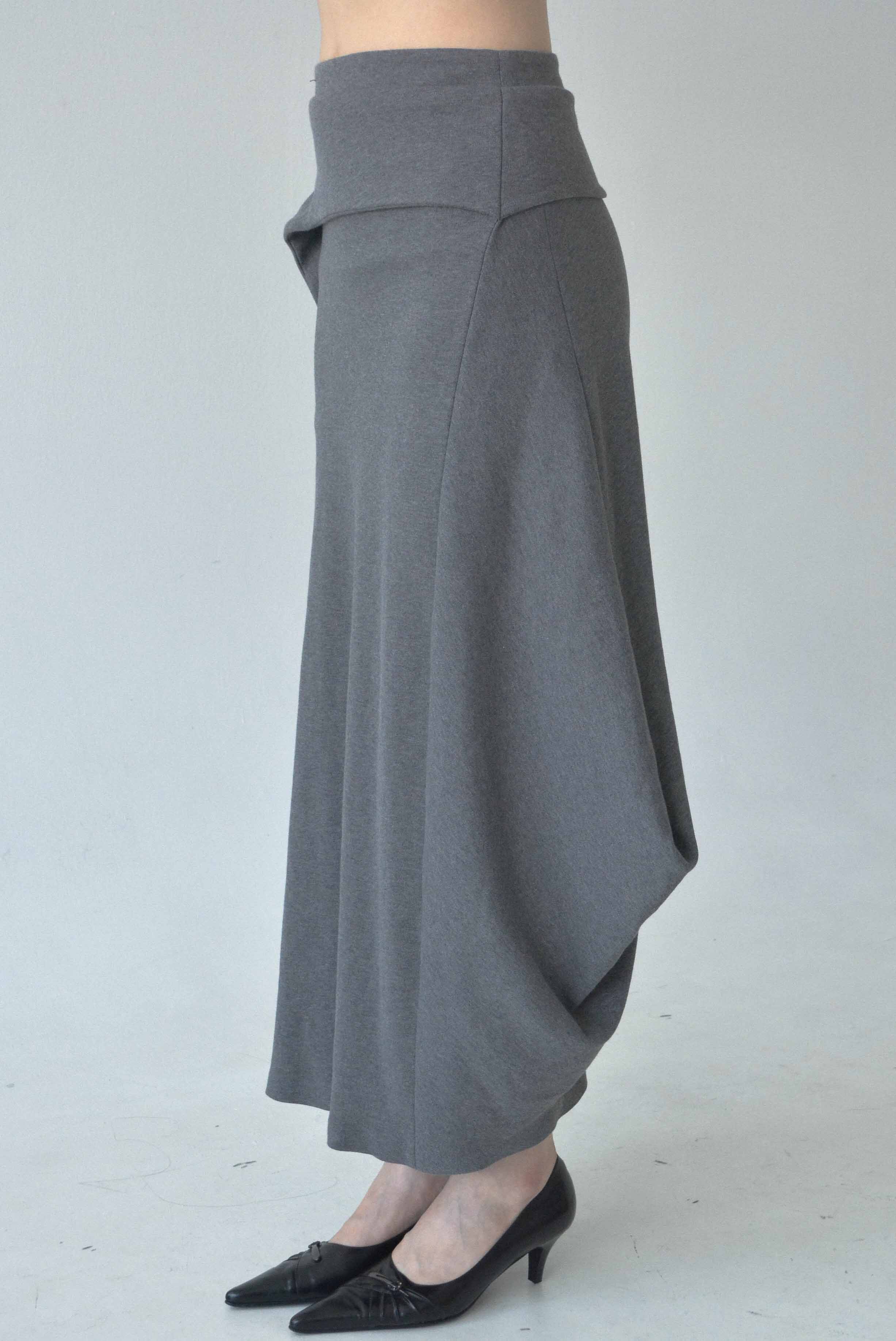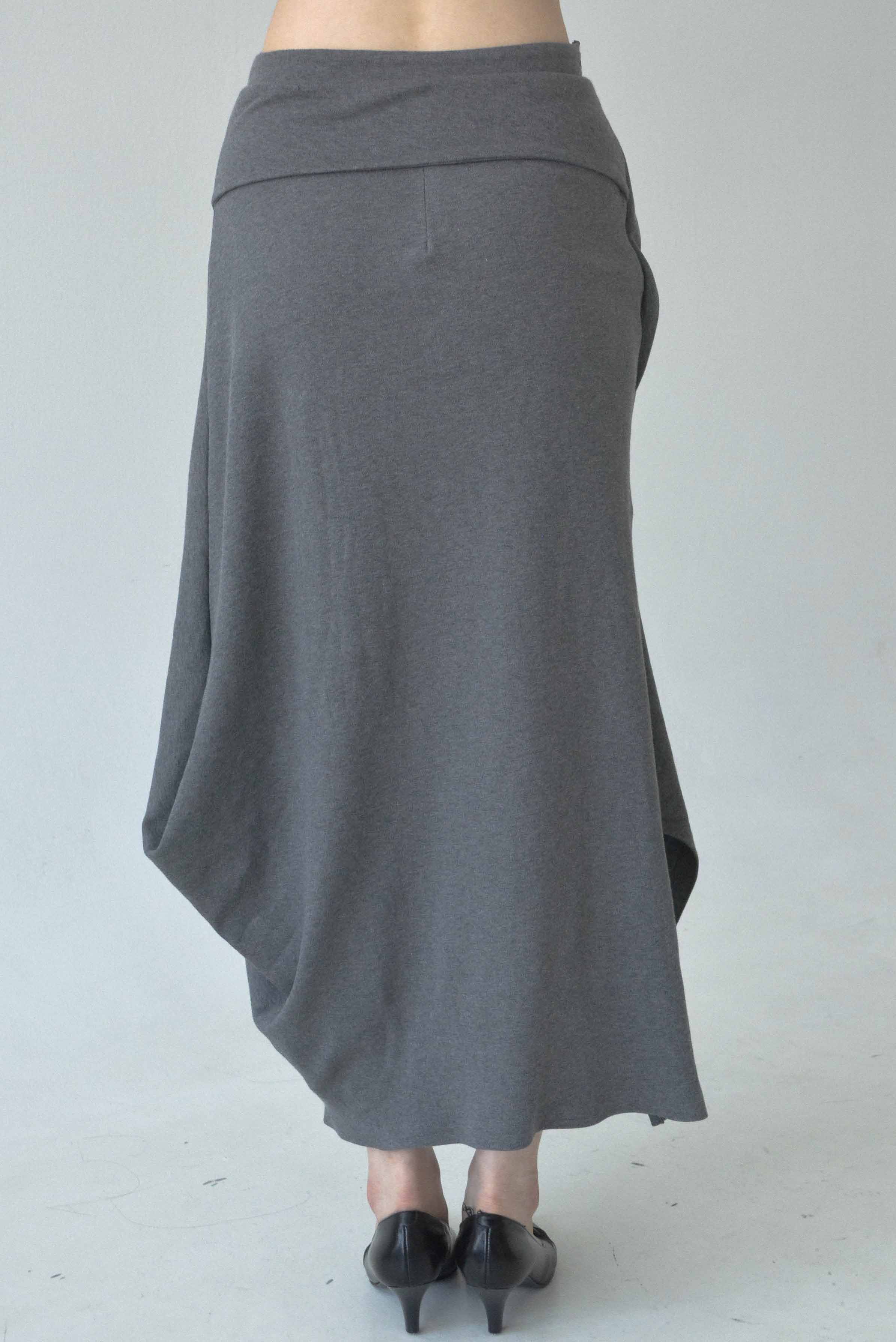 Hans Gray Skirt is an asymmetrical maxi-length skirt with zipper on the size and draping details. Low waist fit. Double layered lined.