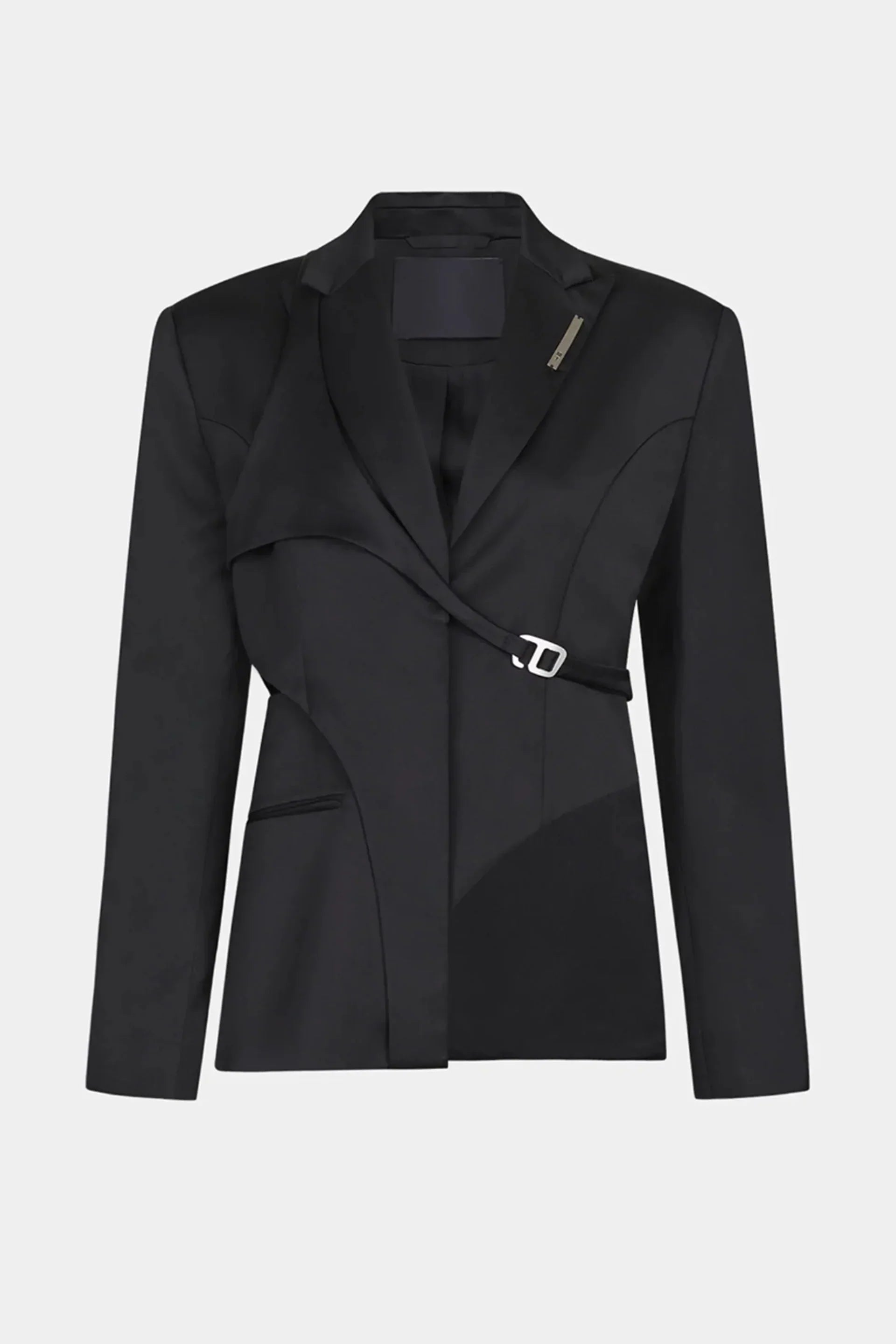 Shaped seams details and curved back panels. Cut out opening on the right side of the body. Harness shaped layer with g-hook closure. Asymmetric curved hem at left side. HE metal plate logo on the lapel. Centre front closure with concealed HE press button. Heliot Emil TM recycled polyester jacquard lining.