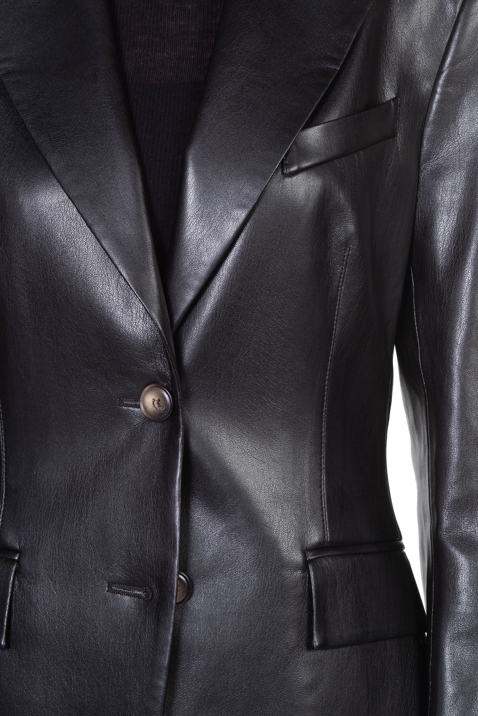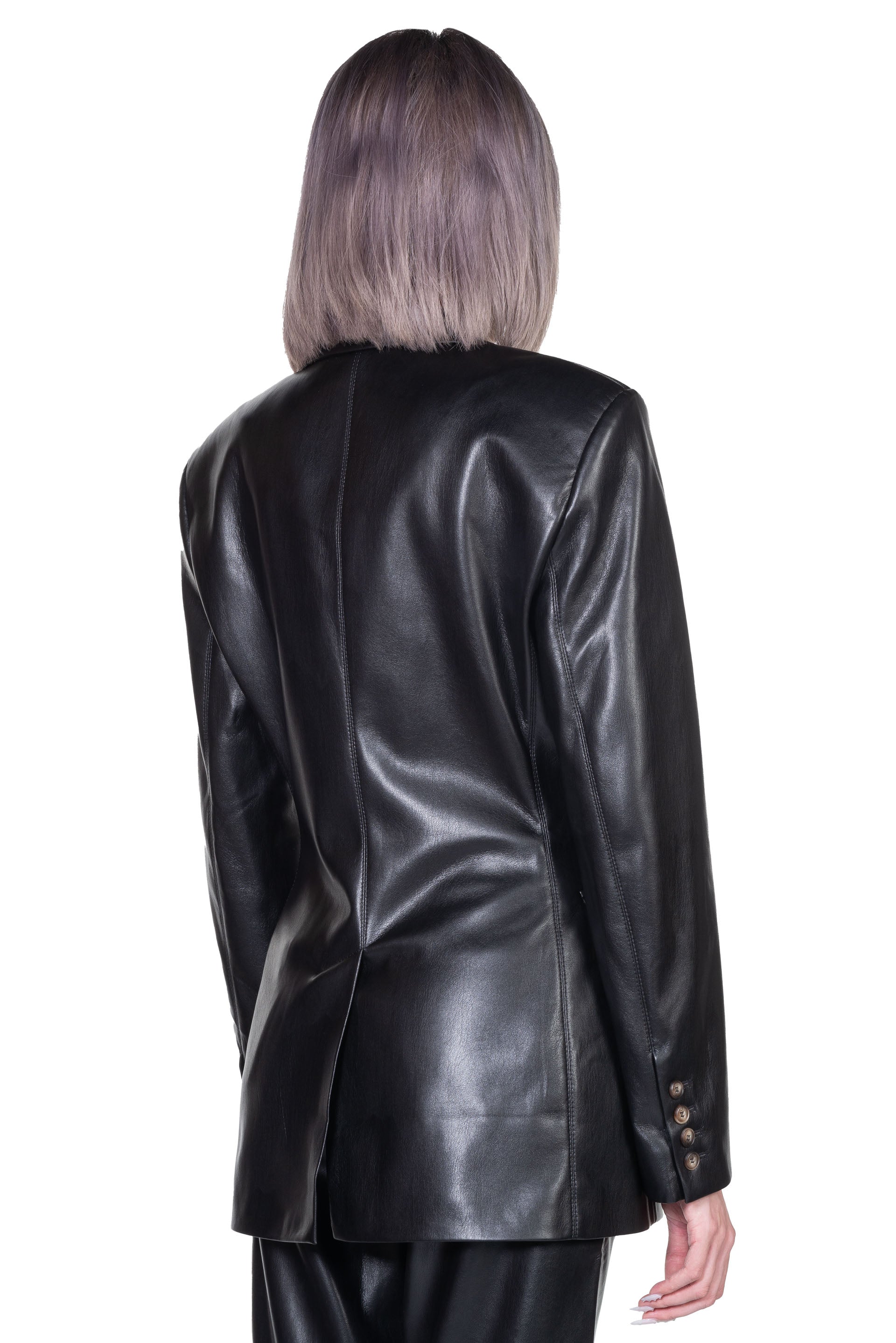 The Hathi jacket has a sculptural tailored silhouette crafted from butter-soft vegan leather. With a sharp notch lapel, dual flap pockets and double button closure.