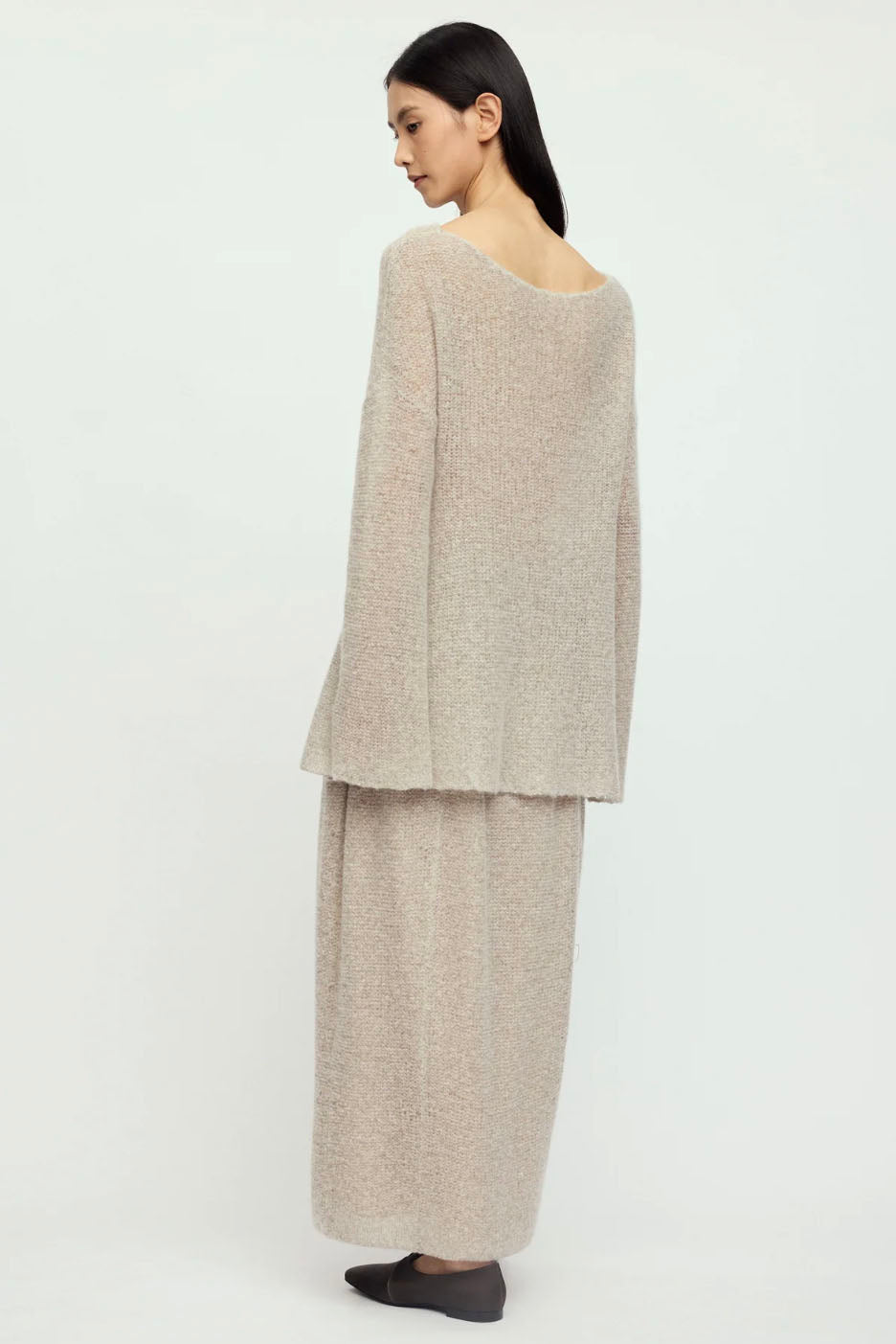 The fabric is soft and fluffy with a clear texture and a slightly fuzzy feel, offering comfortable and skin-friendly wear. The design is simple and casual yet elegant, featuring a large round neckline that highlights the neck lines gracefully.