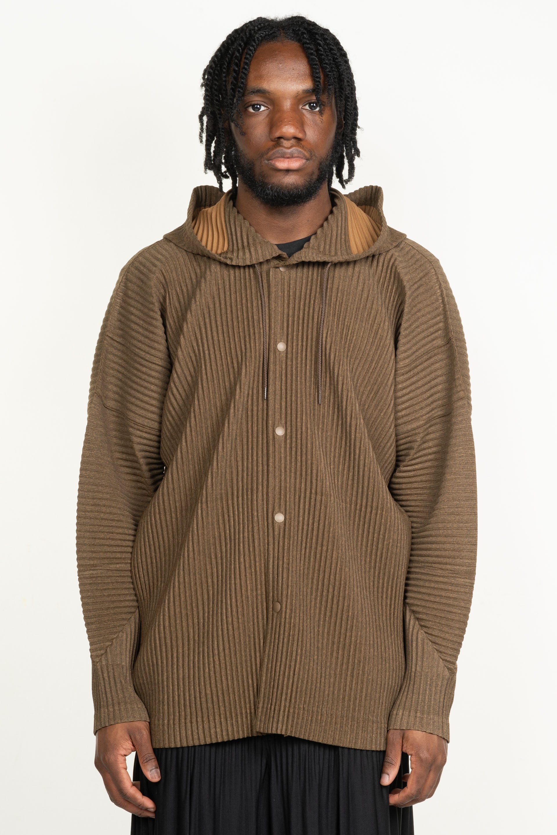 Homme Plisse brown pleated hoodie. Long sleeves. Snap button fastenings. Side pockets.