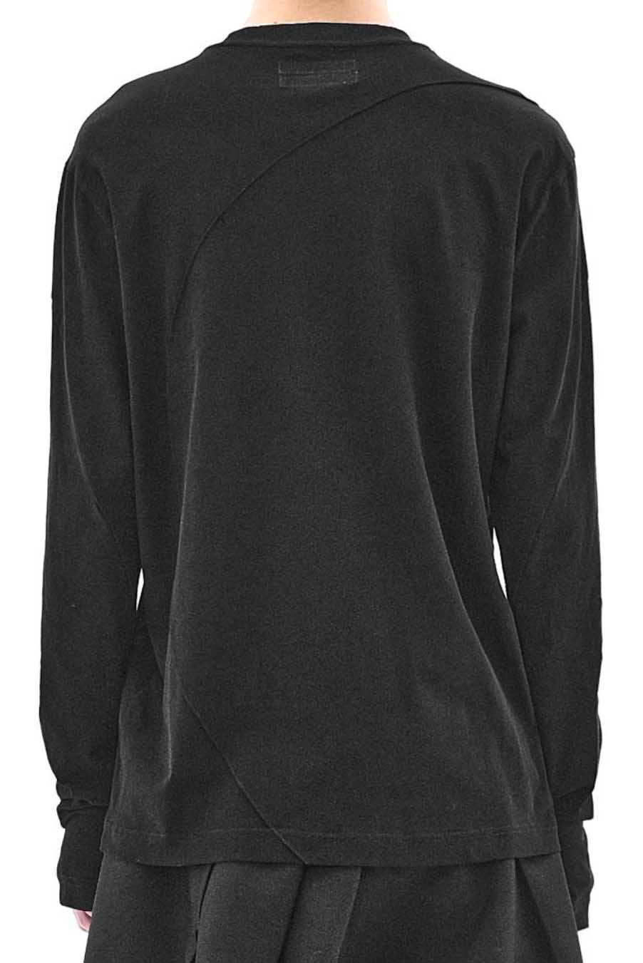 Attempt project 11 black t-shirt. Long sleeves. Round neck. Thumb holes details. Light textured fabric. Seam details throughout. Sleeves feature a spiral cut-out form around the arm.