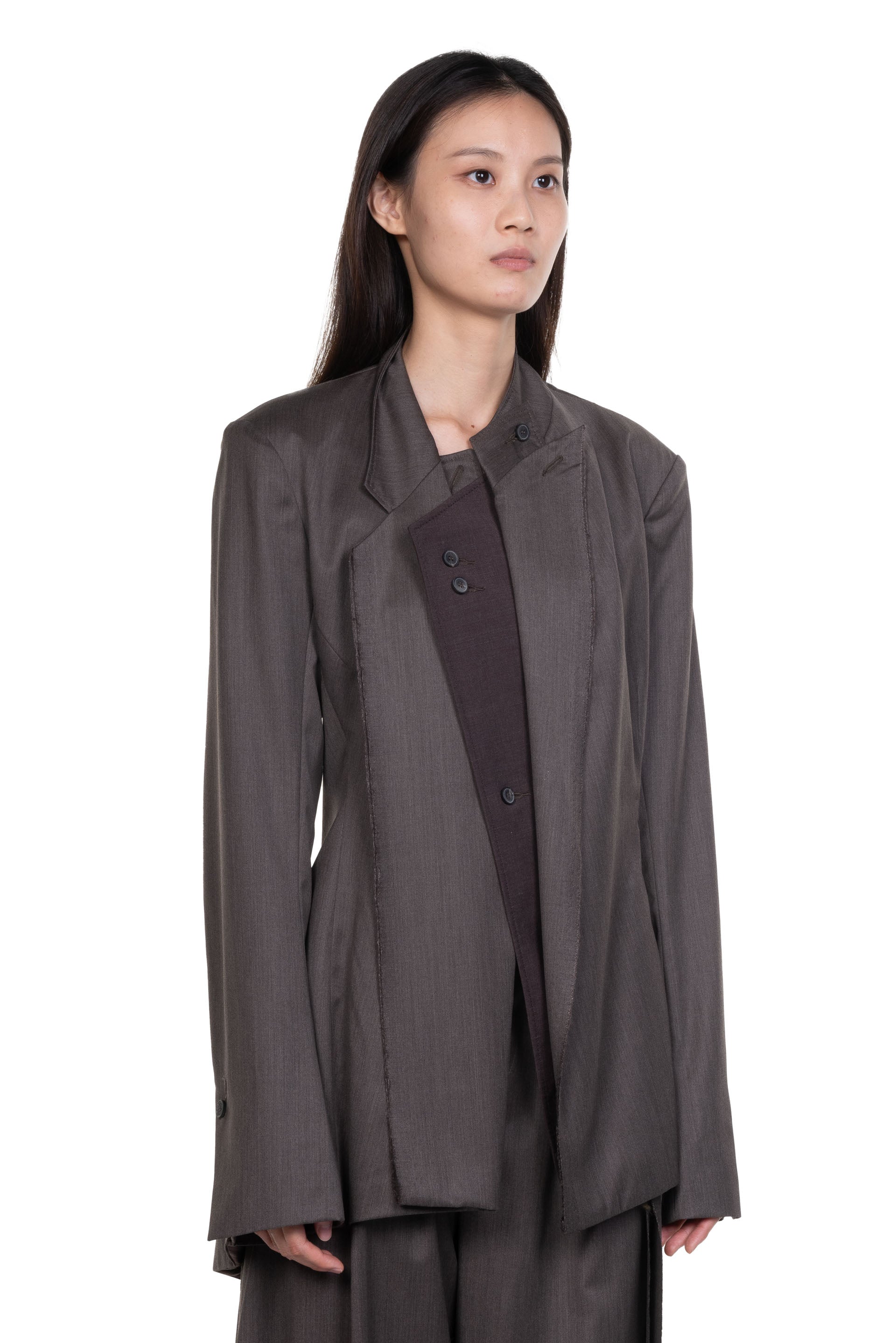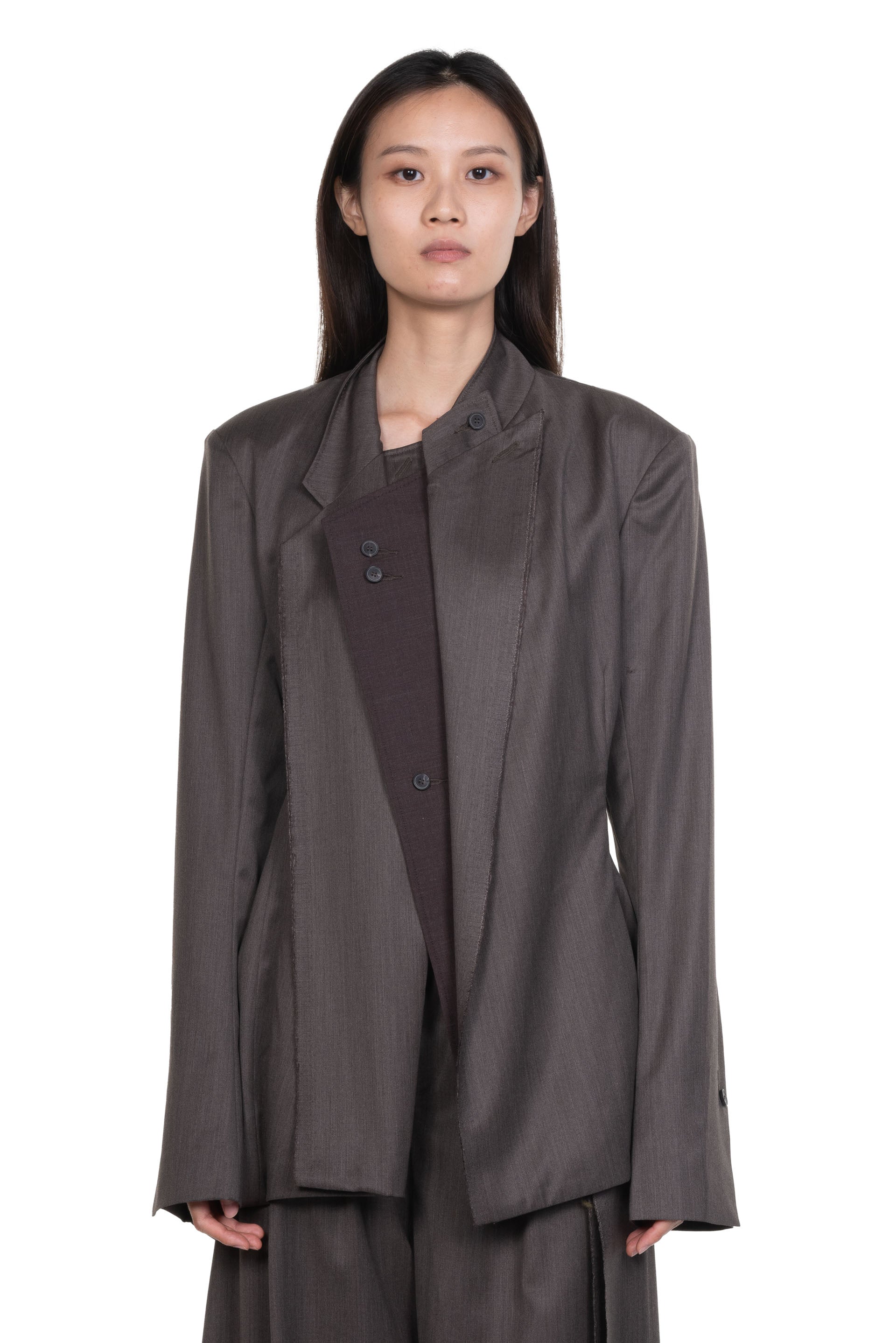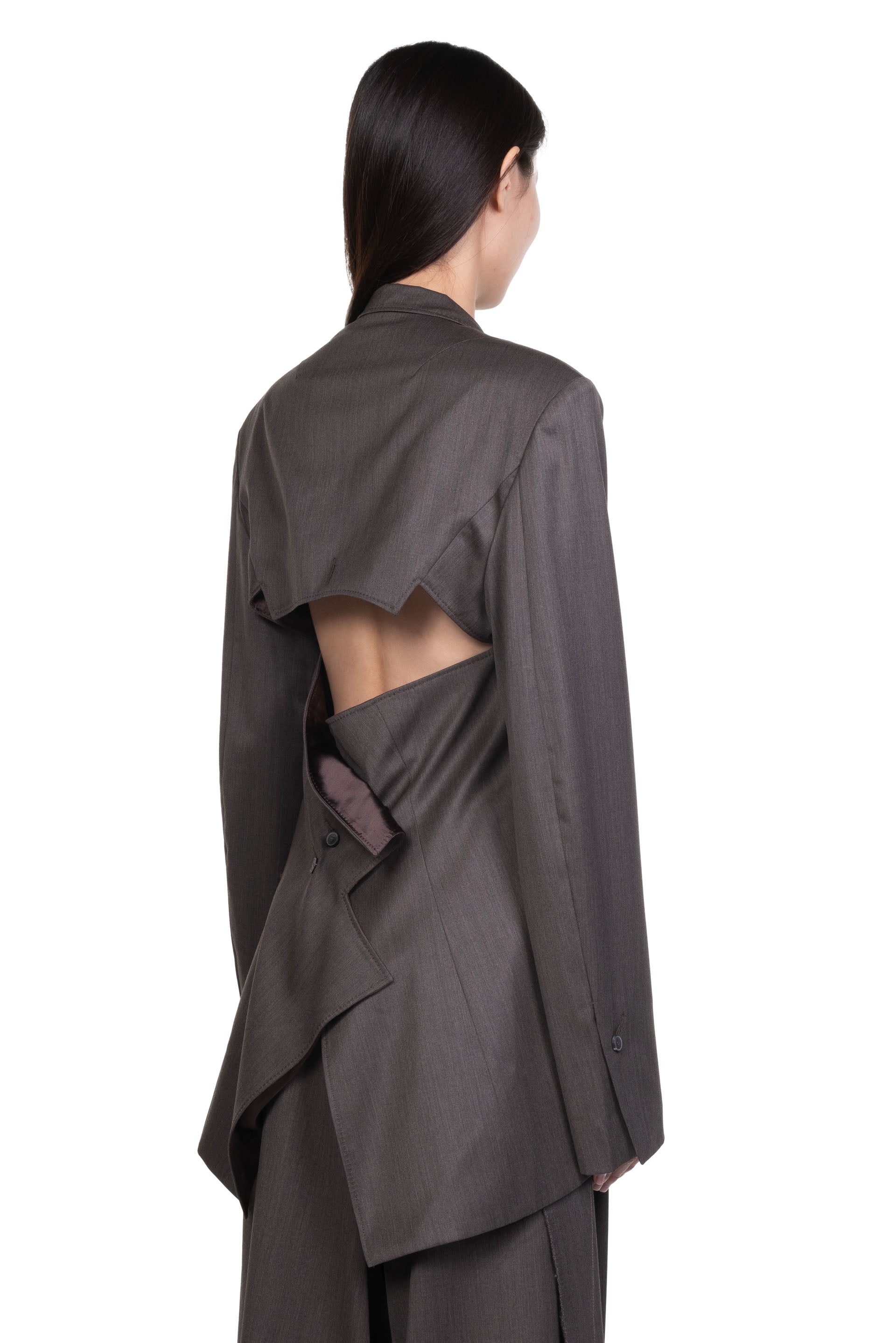 Yehuafan believes in feminine beauty with his own way to explain the smooth curve to compliment women’s body. He specialised in asymmetrical cutting and deconstructed silhouette as seen with the Henna Jacket.