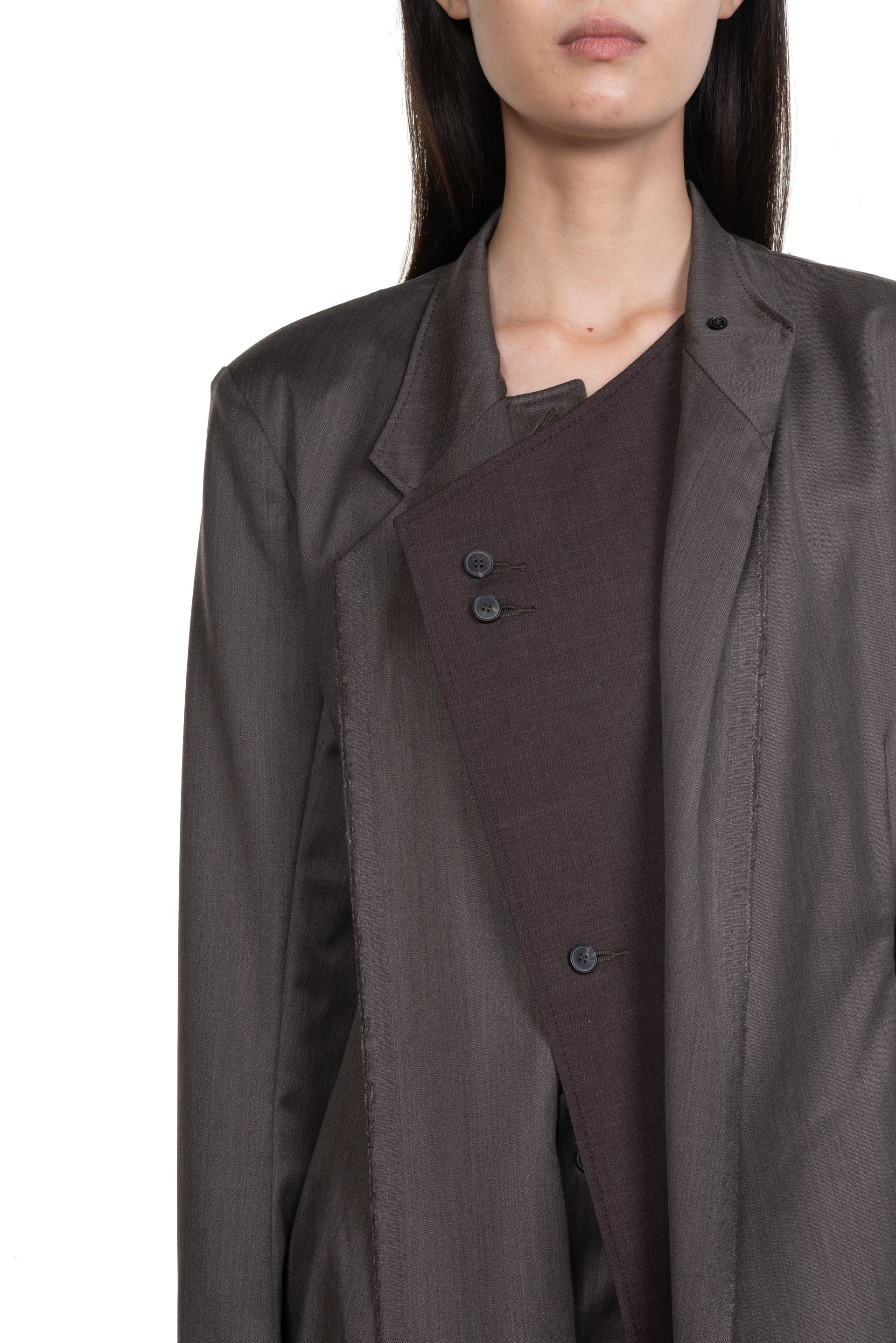 Yehuafan Asymmetric blazer in Henna colour. Long sleeves. Deconstructed. Button closure at front. Open back. Flap at chest. Two side pockets.