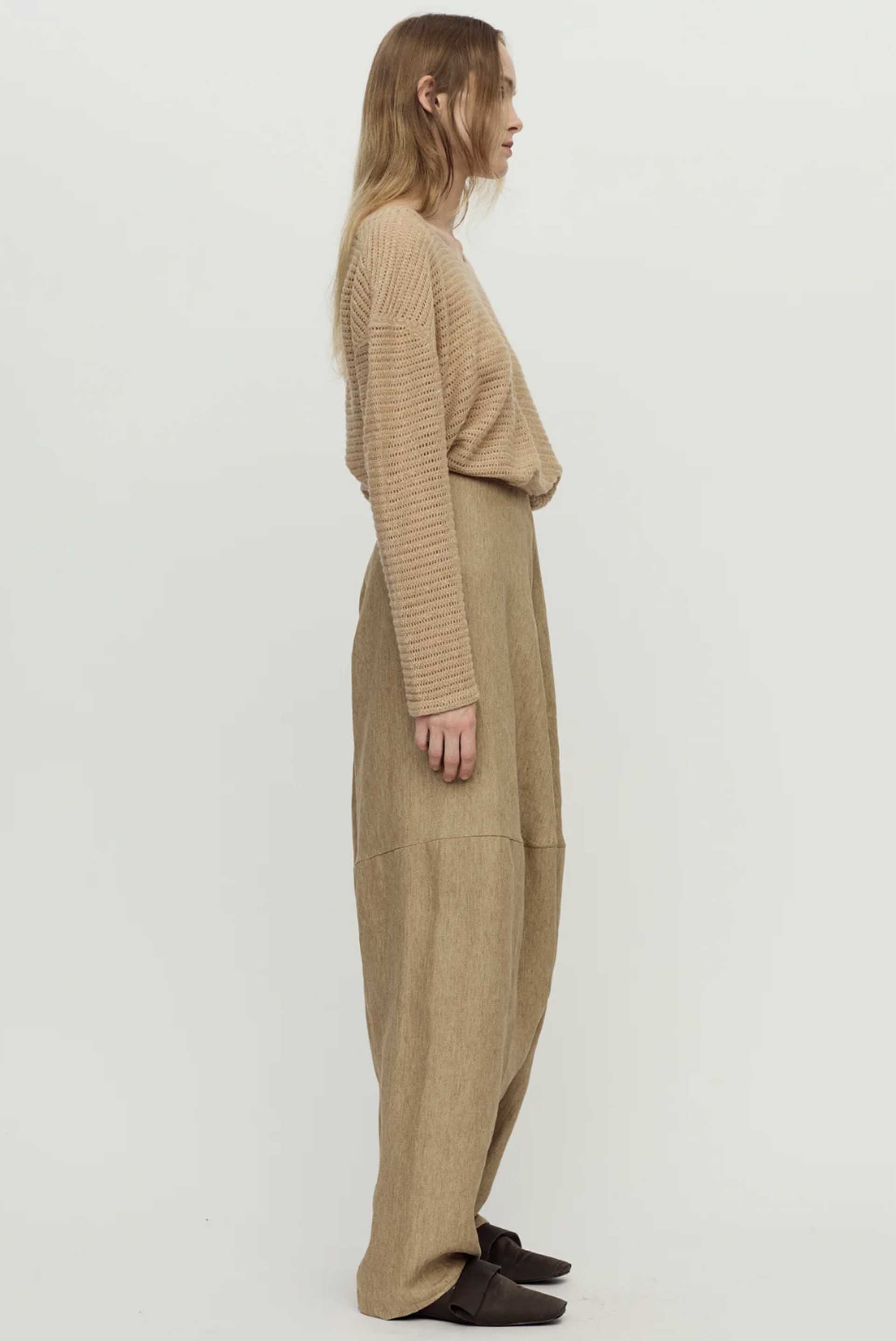Birch Hesper Trousers feature an irregular grainy texture with prominent linen characteristics and surface nodules, while the design innovatively repositions the traditional side seam to the knee, where upper and lower panels are pieced together with a rounded top panel that creates a distinctive carrot-leg silhouette.