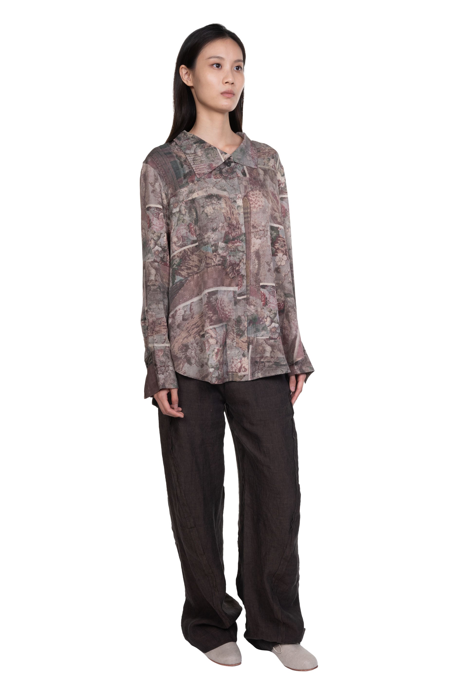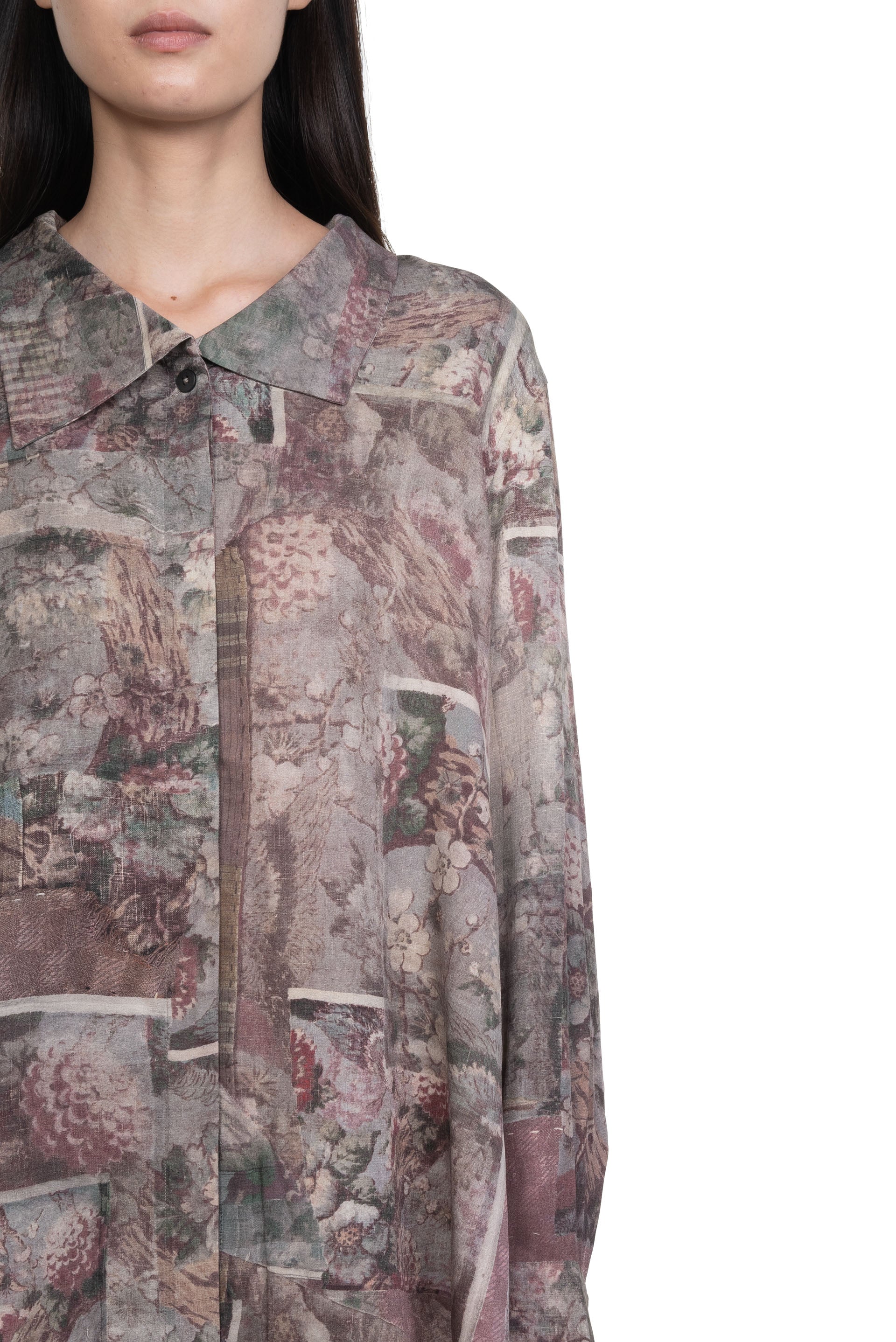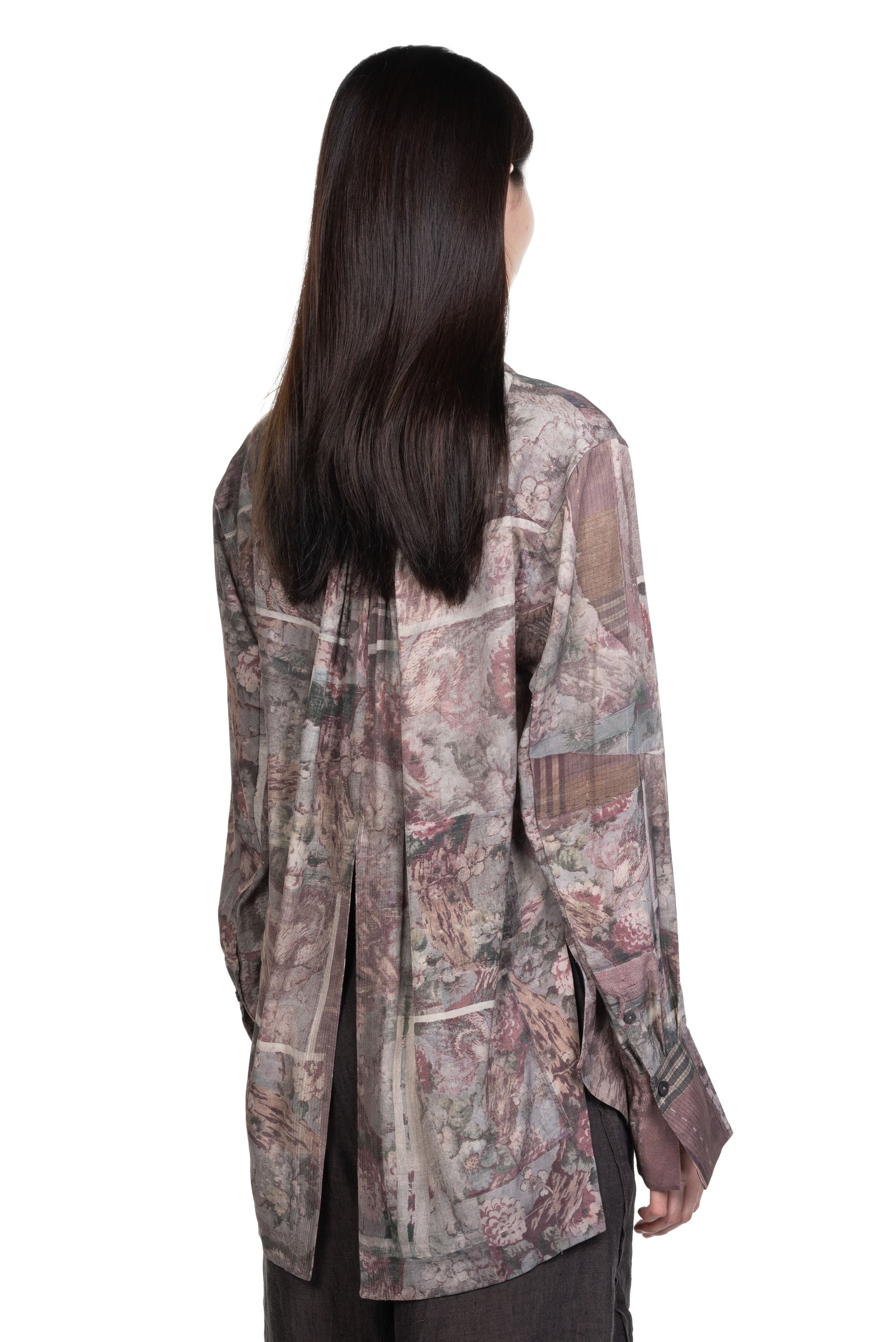 High collar printed shirt. Long sleeves. Button closure at front and cuffs. Seasonal print throughout. Slit at back. Soft and lightweight silk fabric.
