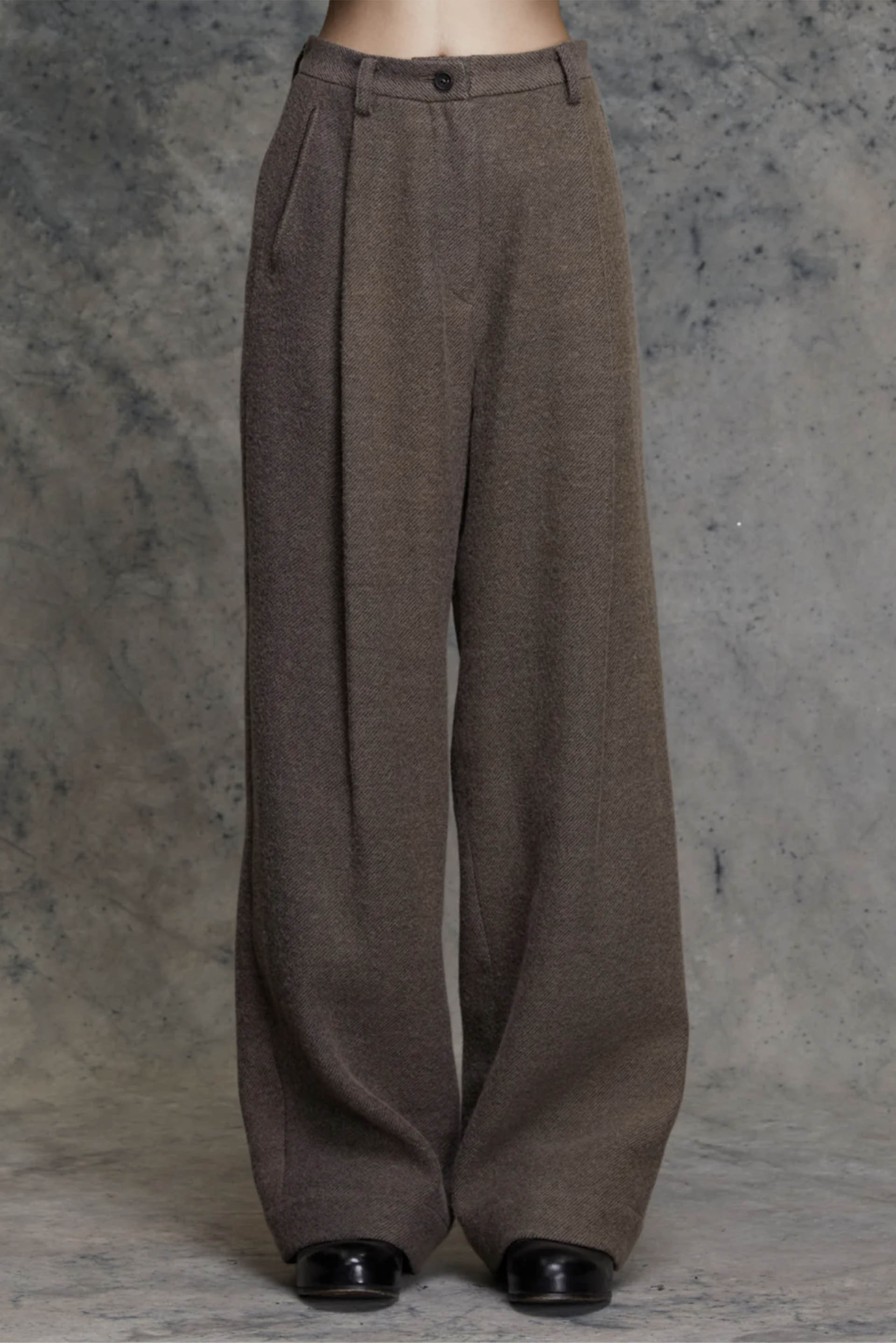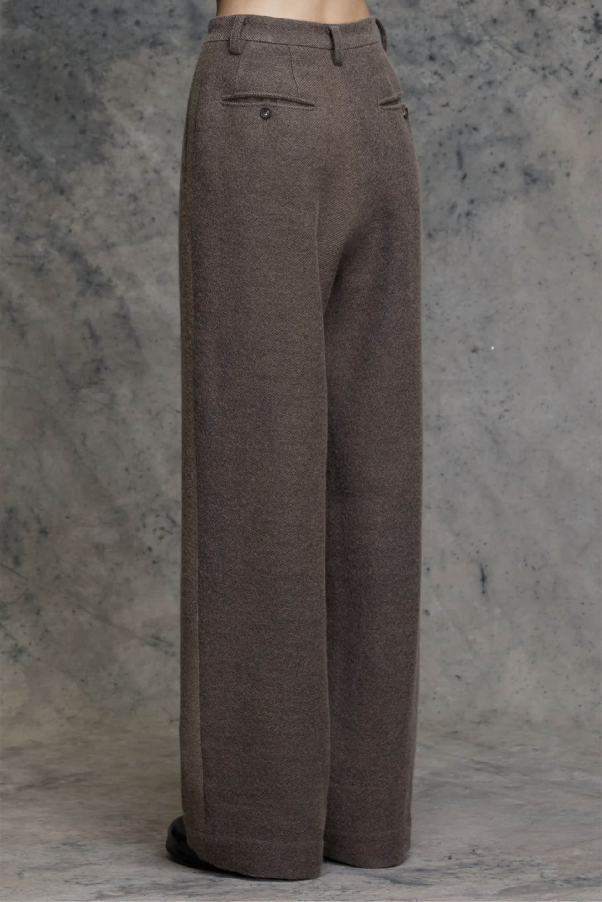 Wide leg, straight cut. Full length. Concealed zipper closure with visible button. Belt loops. Two side pockets and two back pockets. Half lined.