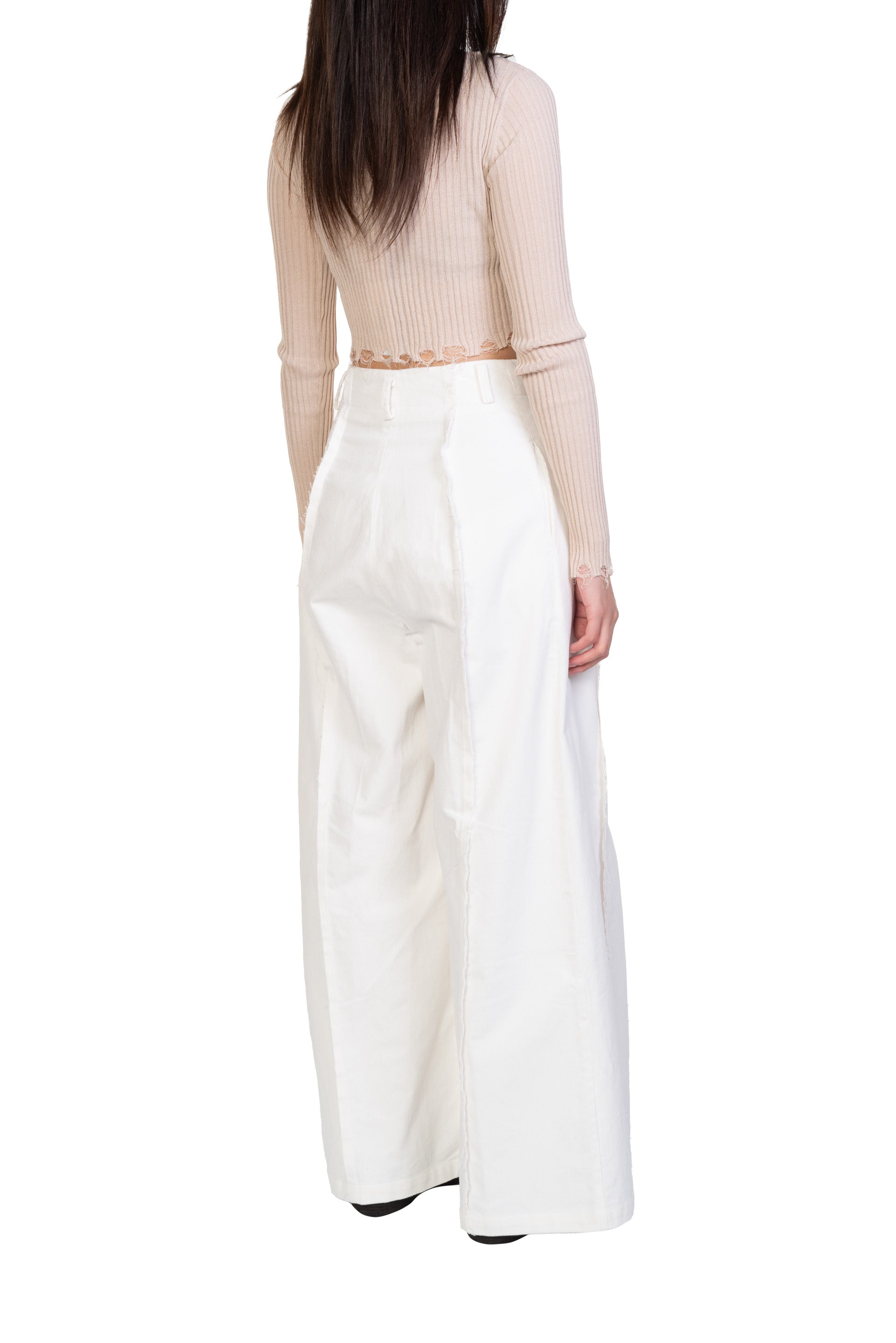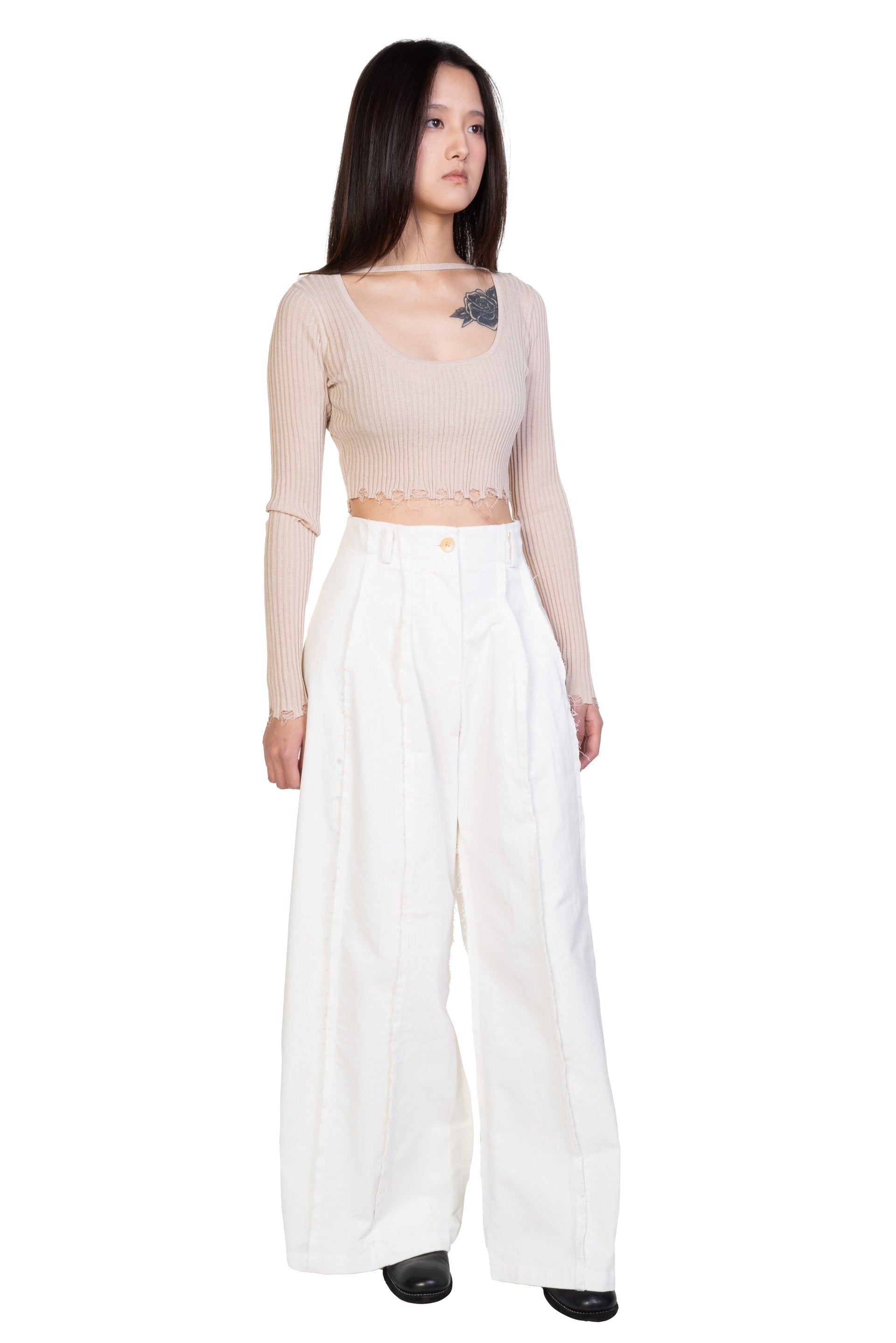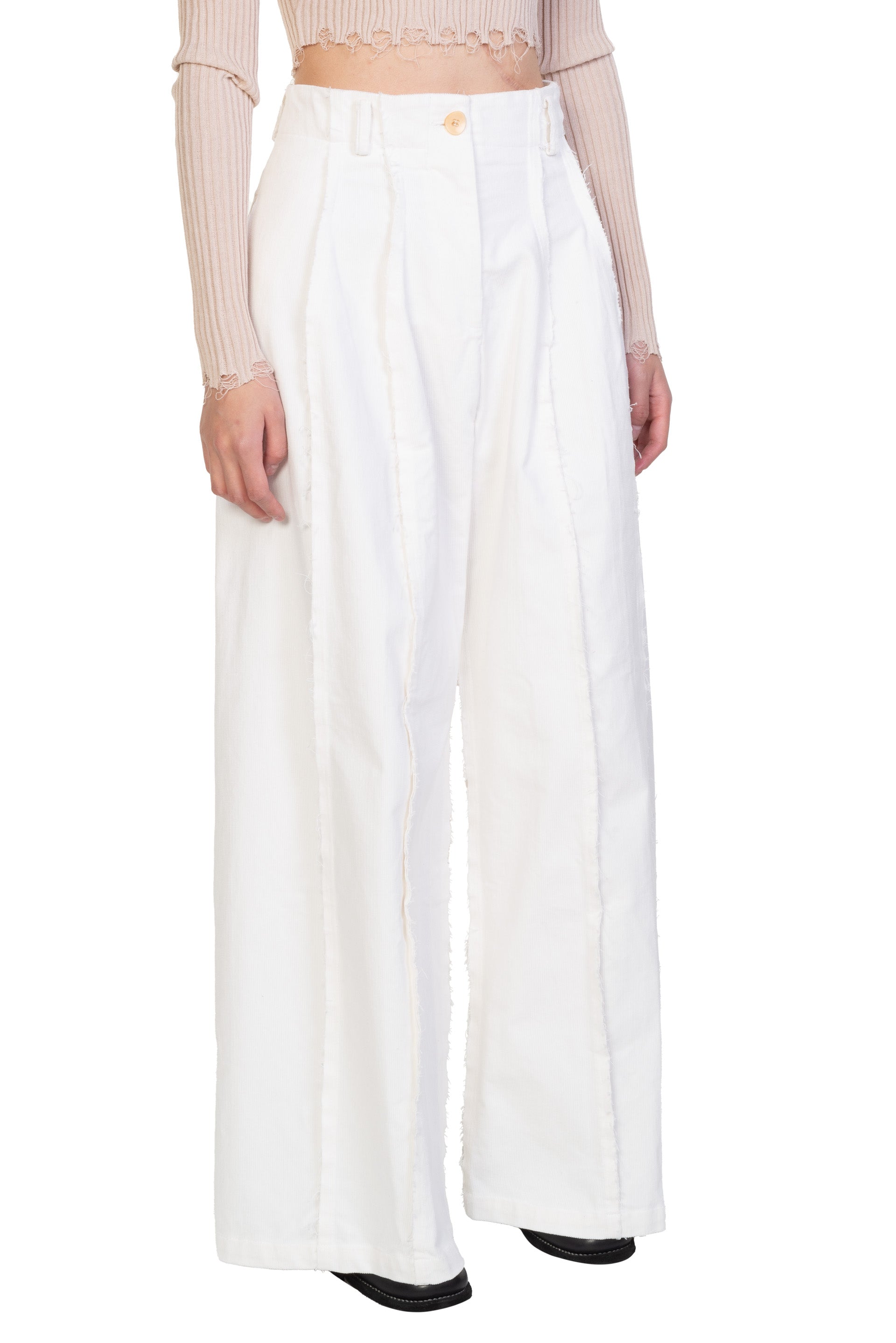 Button closure at waist. Two side pockets. Two back pockets. Leather button closure. Panelled. High waisted. Raw edges details throughout.
