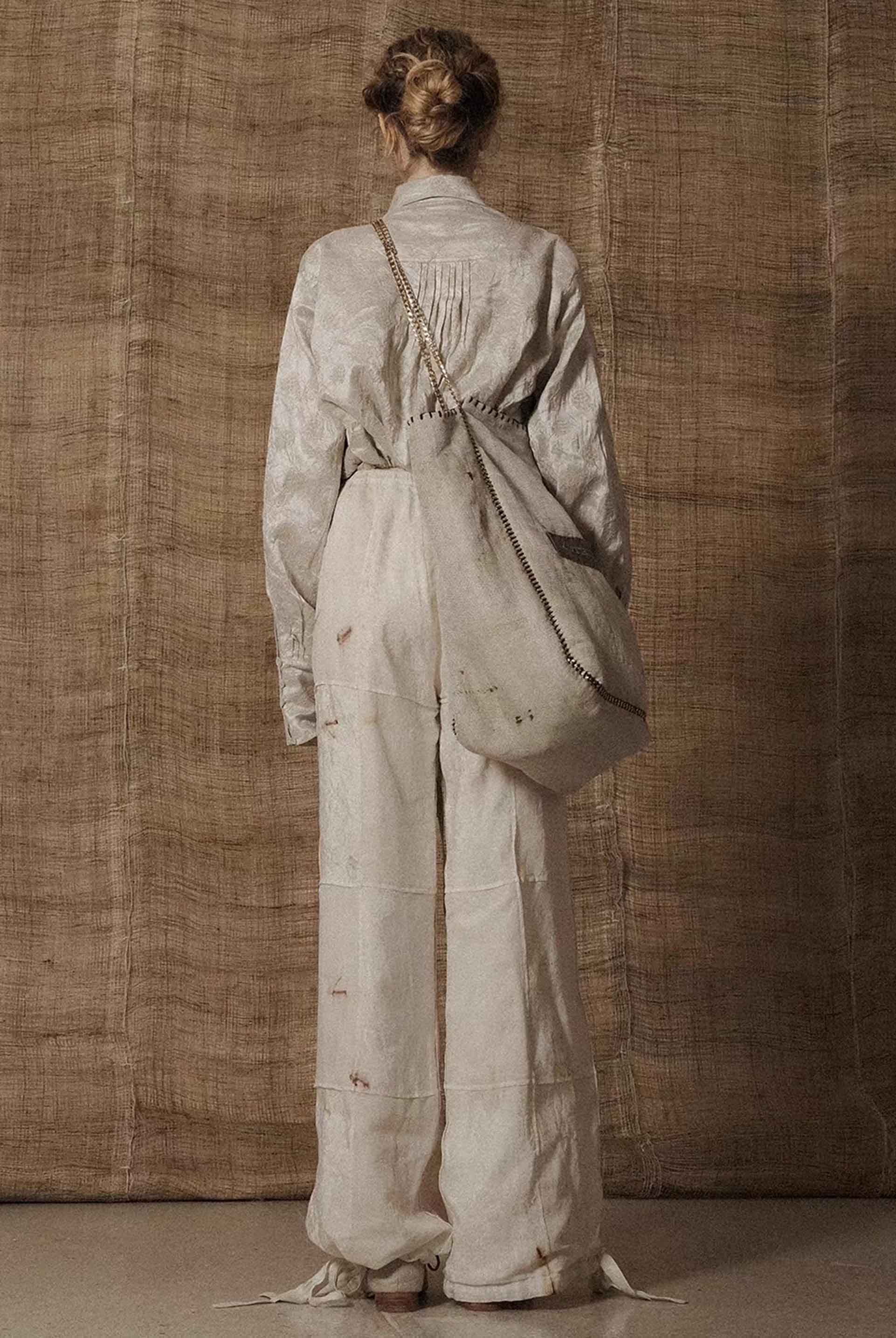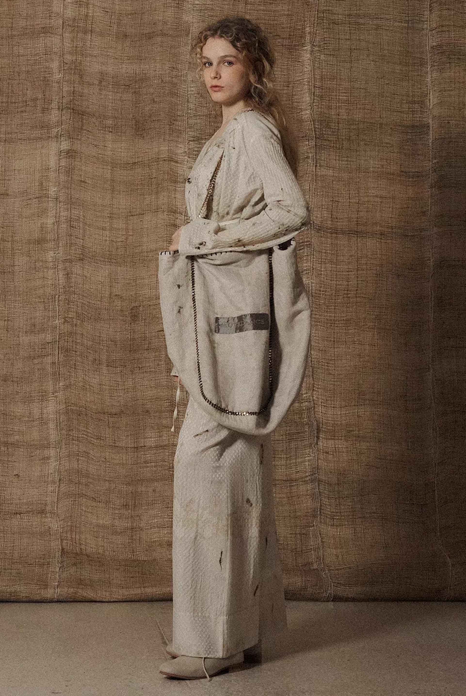 Yu Qun believes that everyone's character is multi-faceted and expressing spiritual independence. Fine hand-stitched threads, old mottled colours and patterns, and unconventional cuts are what Mute Dance has been exploring. The leaves and stems of fresh plants and berries, dried medicinal materials, old metals and so on are combined with the ancient and traditional dyeing technology to dye fabrics and paper as seen with the Hobo Bag Linen.