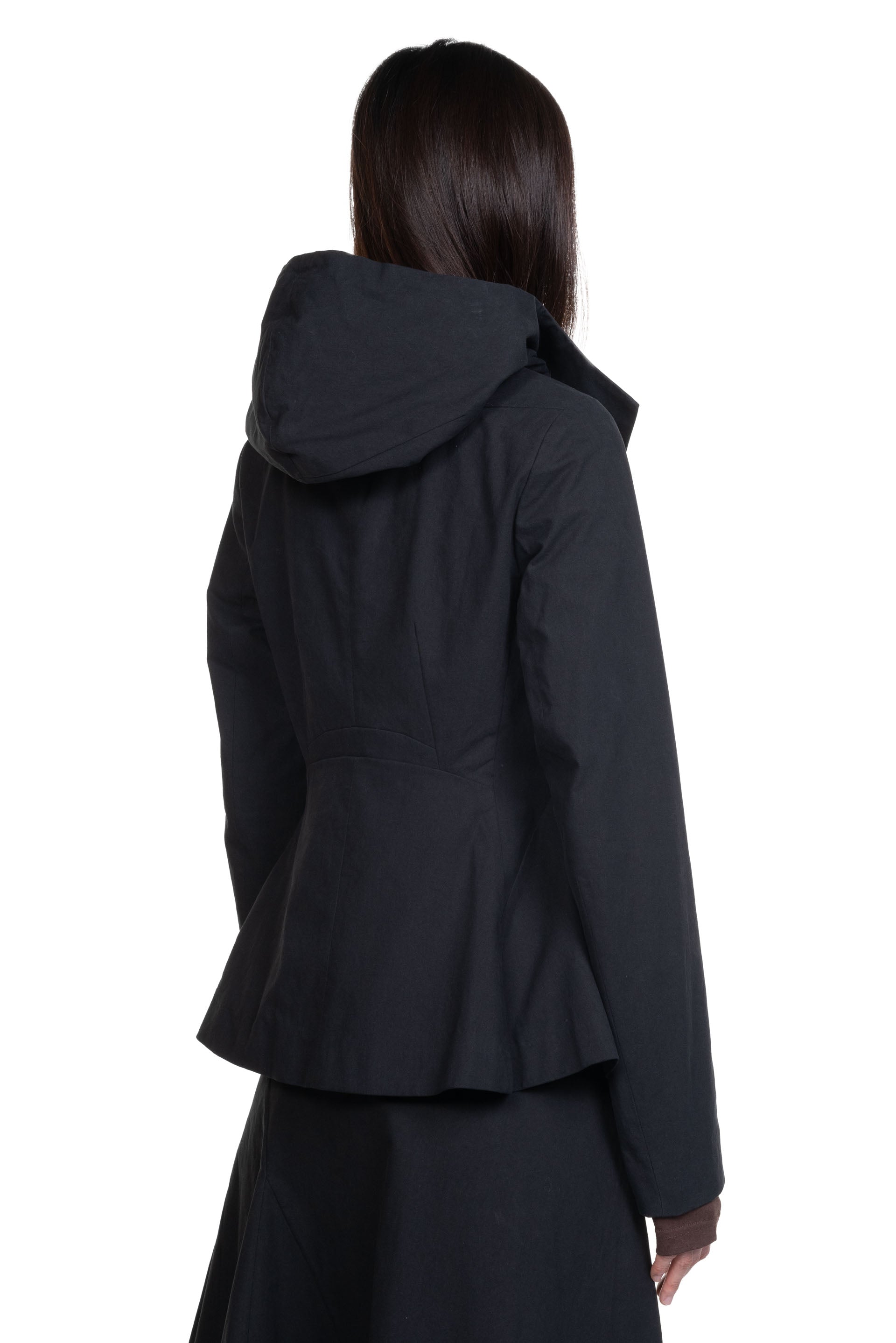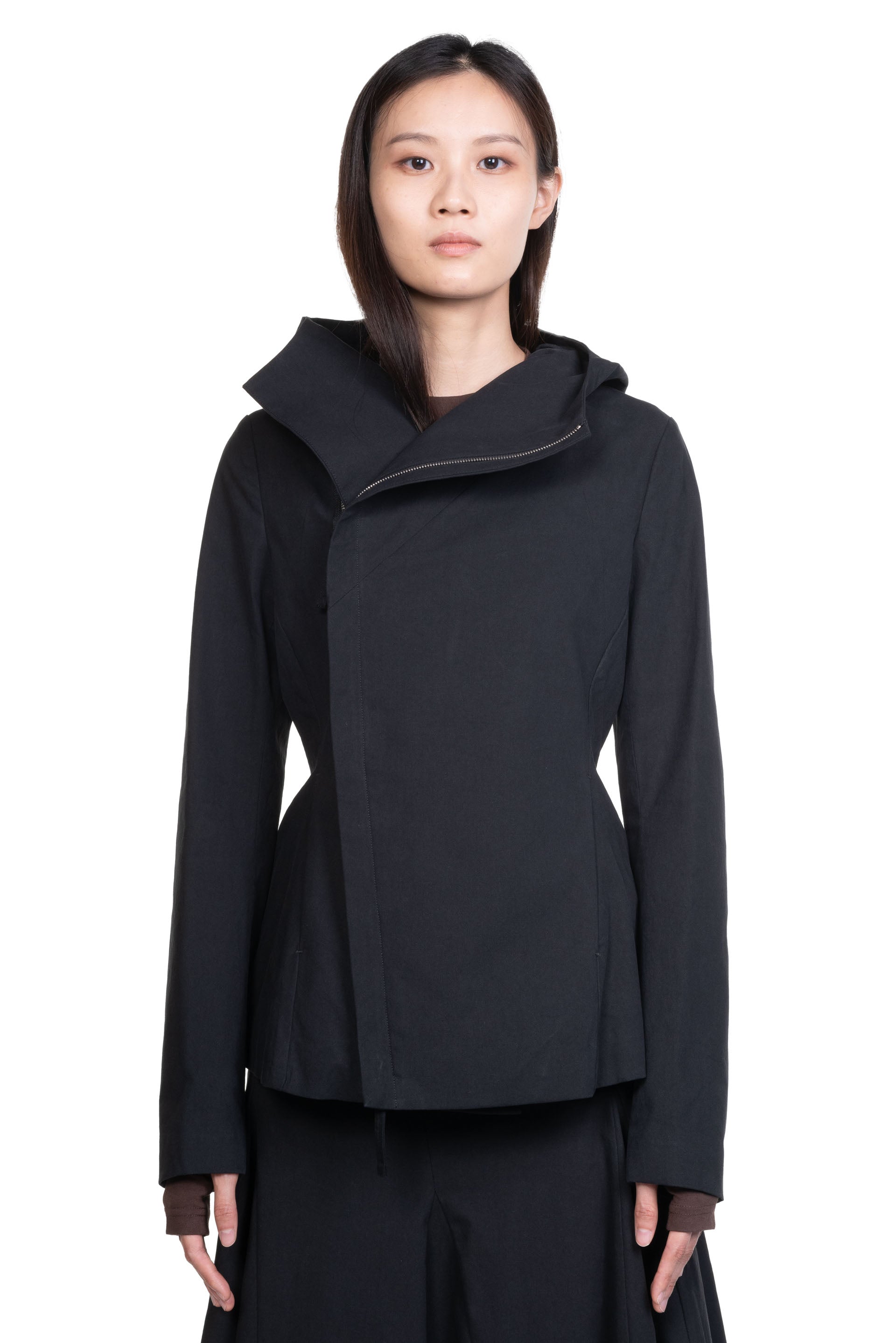 Long sleeves. Two side pockets. Double zip closure at front. Hooded. Curved design at waist.