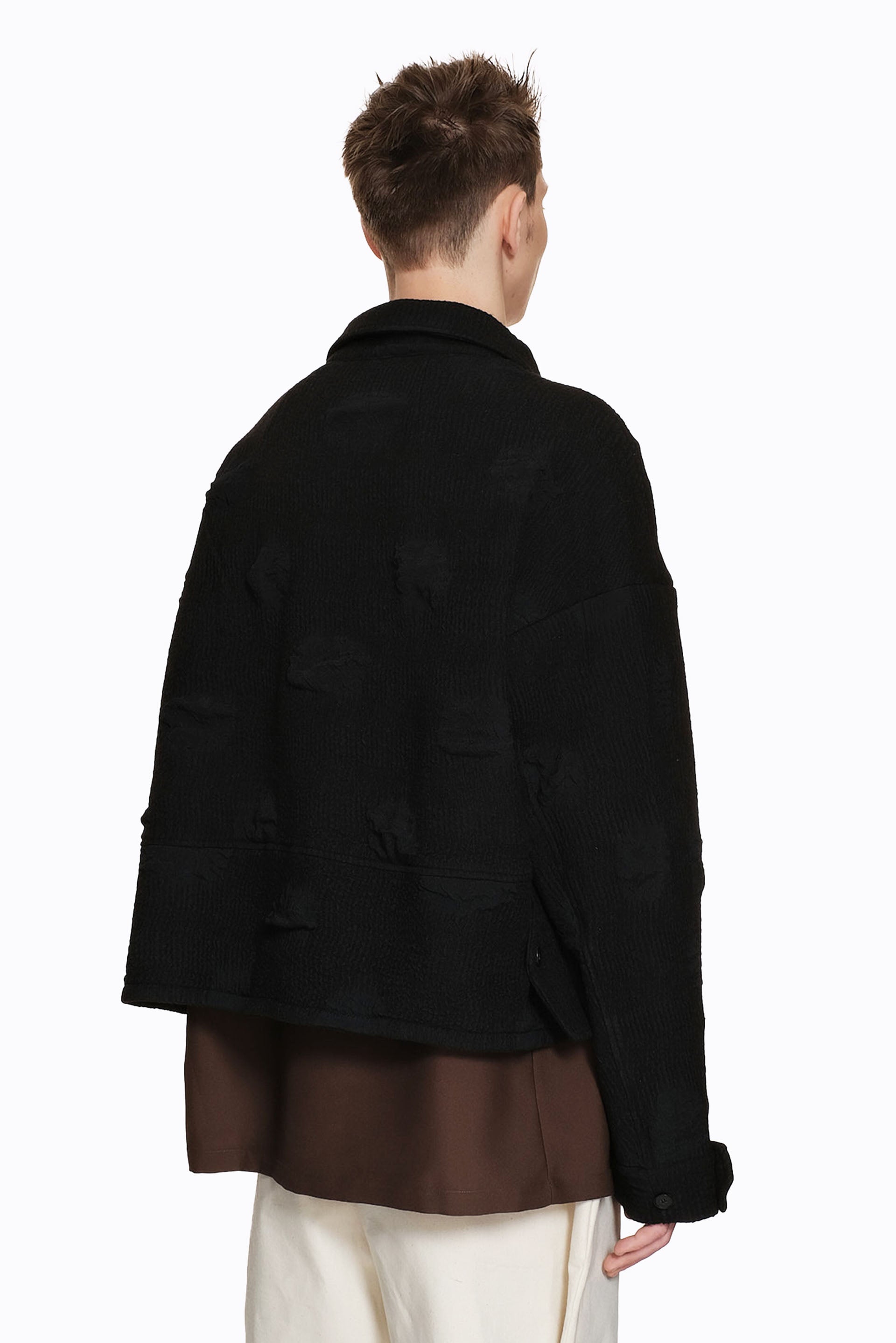 Long sleeves. Zip closure at front. Button closure at cuffs. Boxy fit. Pockets at front.