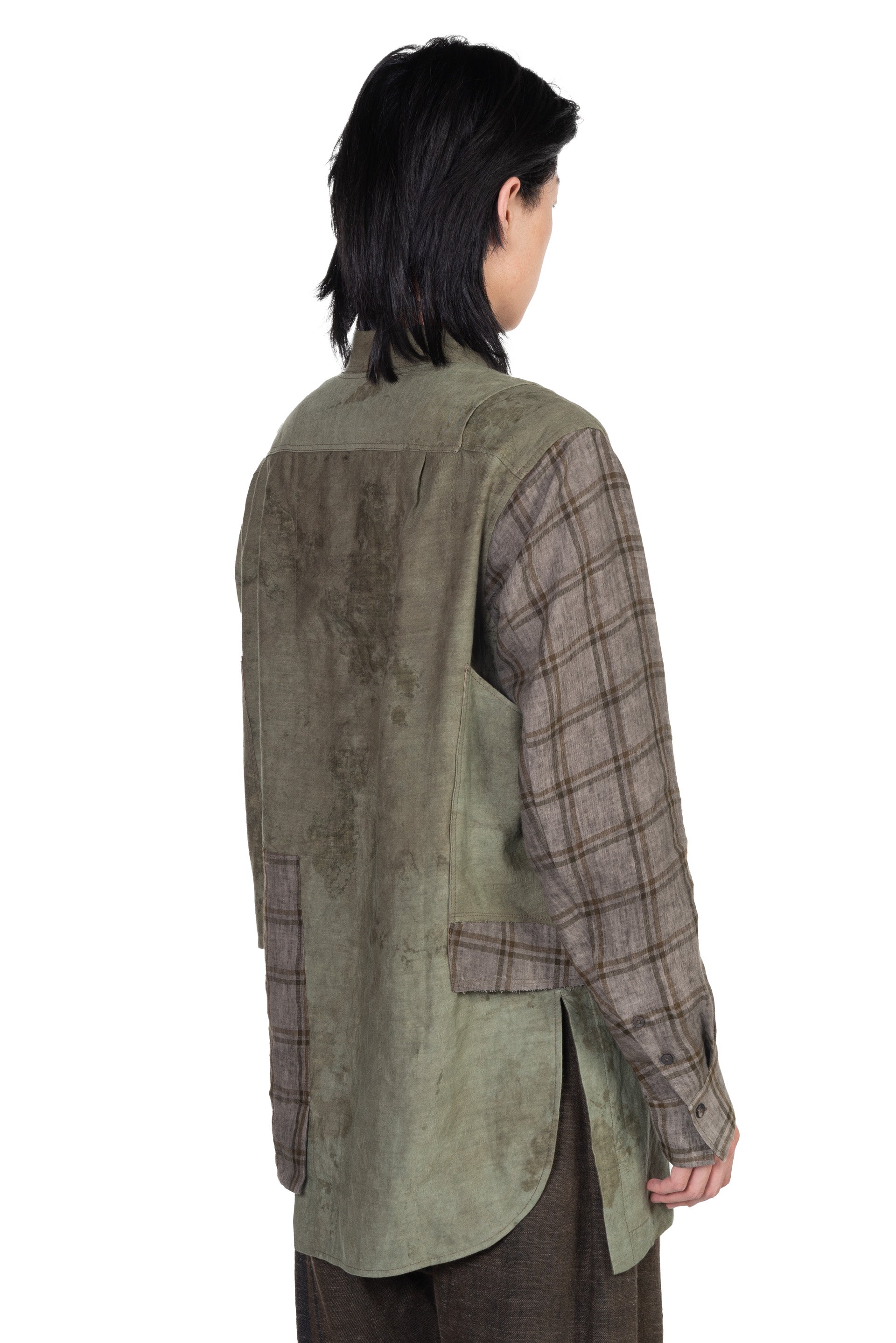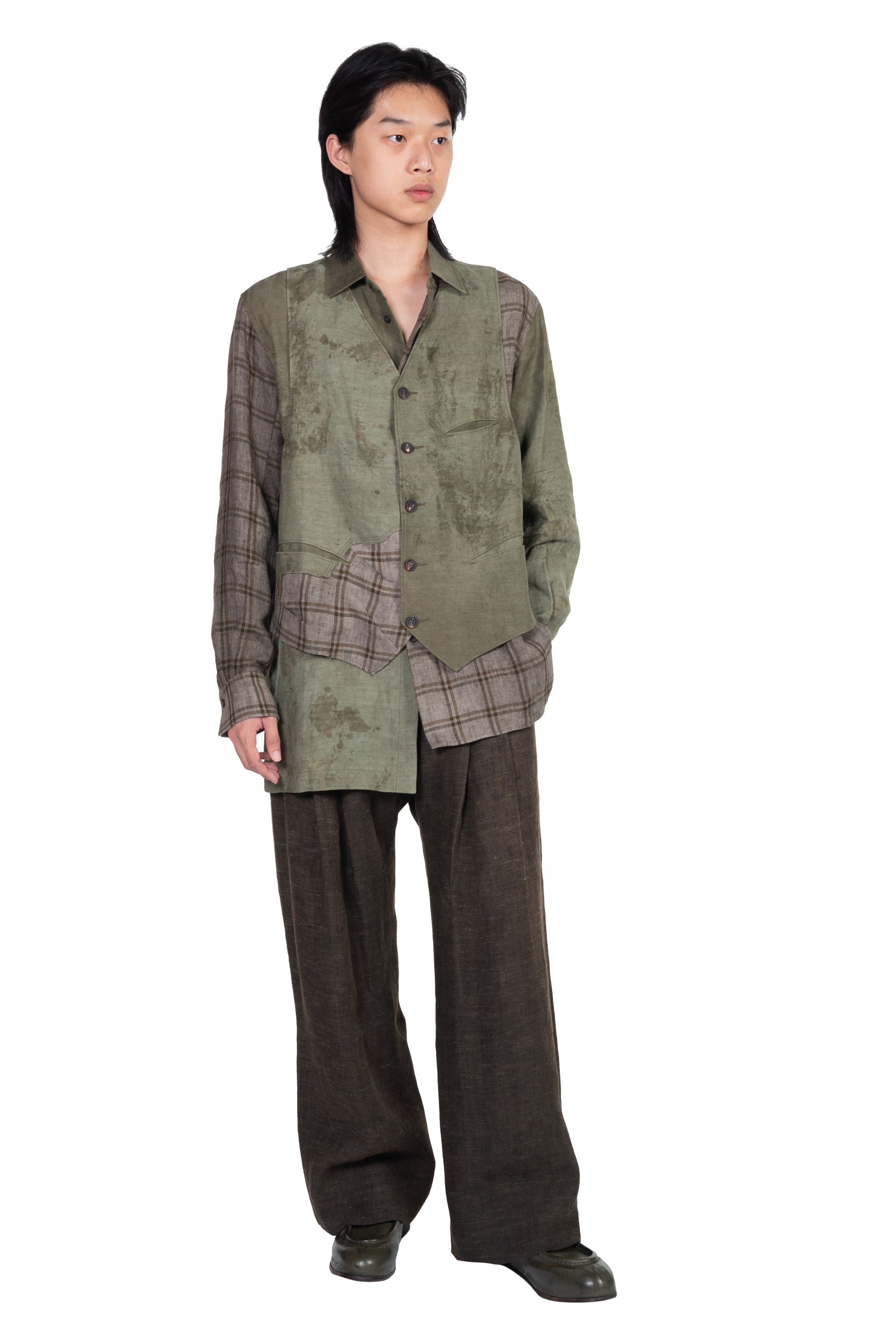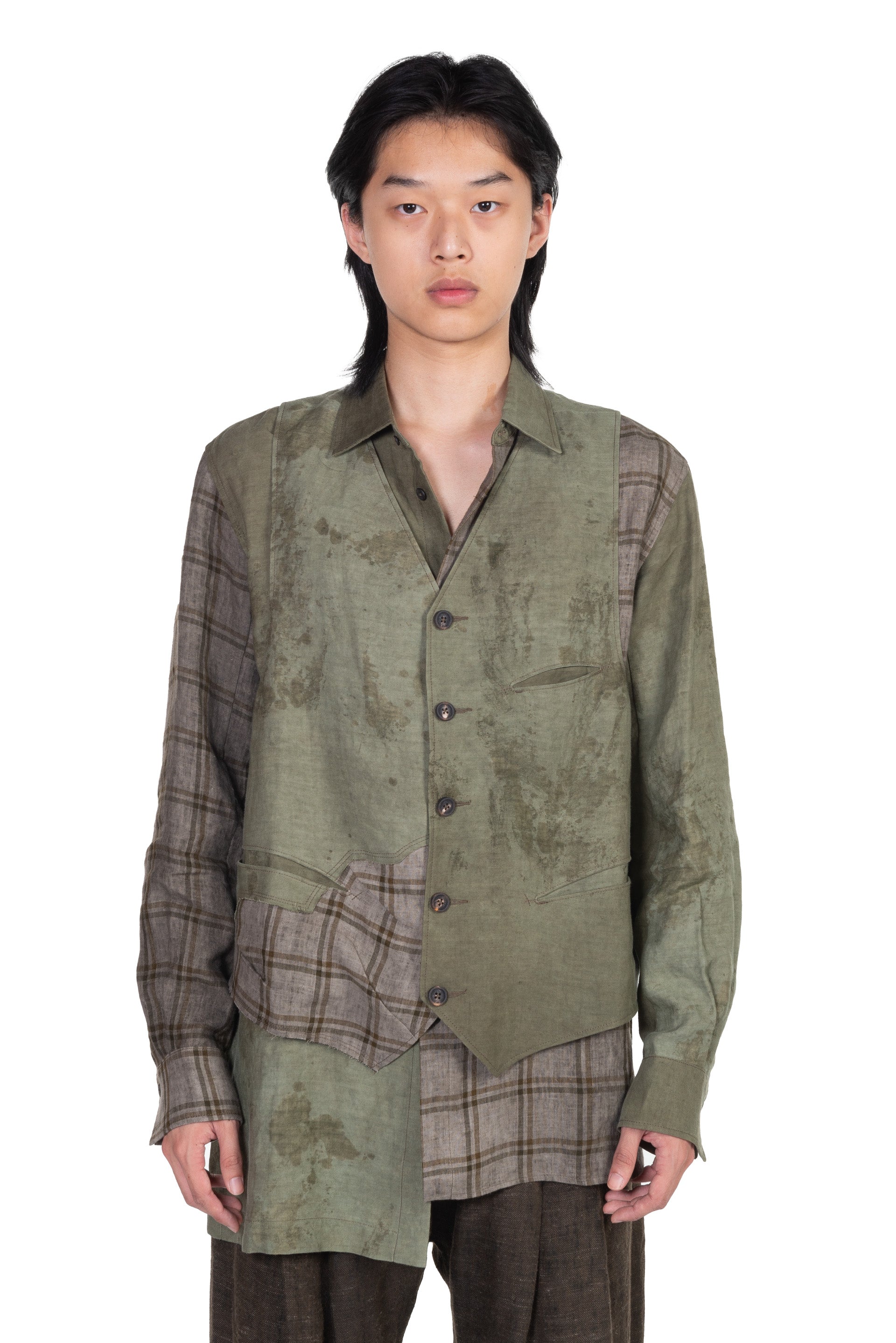 Long sleeves. Button closure at front. Button at cuffs. Semi detachable vest built in. Pleats throughout. Multi fabric patchwork.