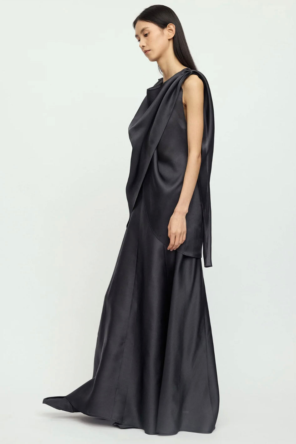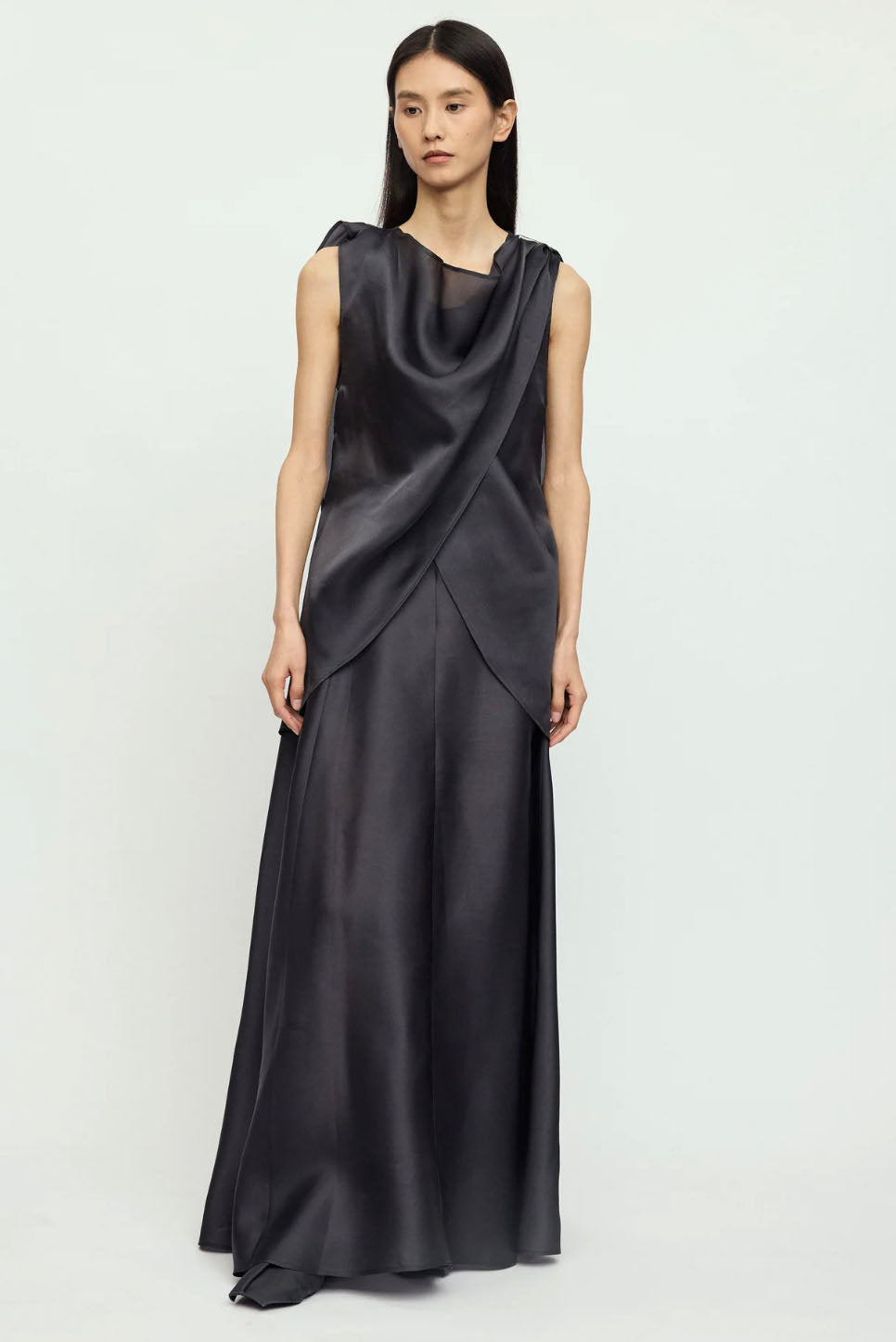 The fabric is a slightly thick organza satin with a delicate sheen, smooth to the touch, and lightweight with layered texture. The draped cowl neckline creates natural folds that highlight the elegance of the lines.
