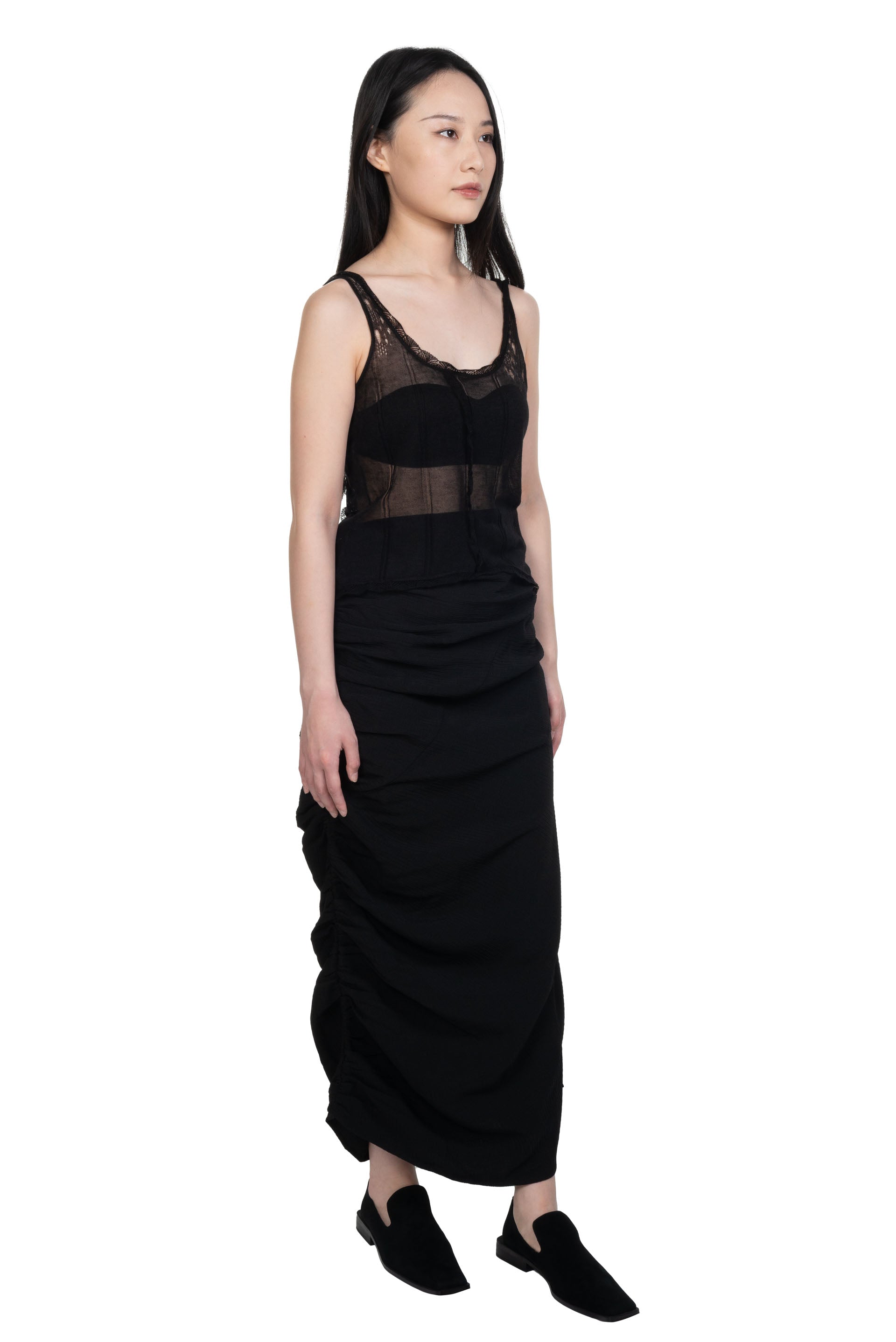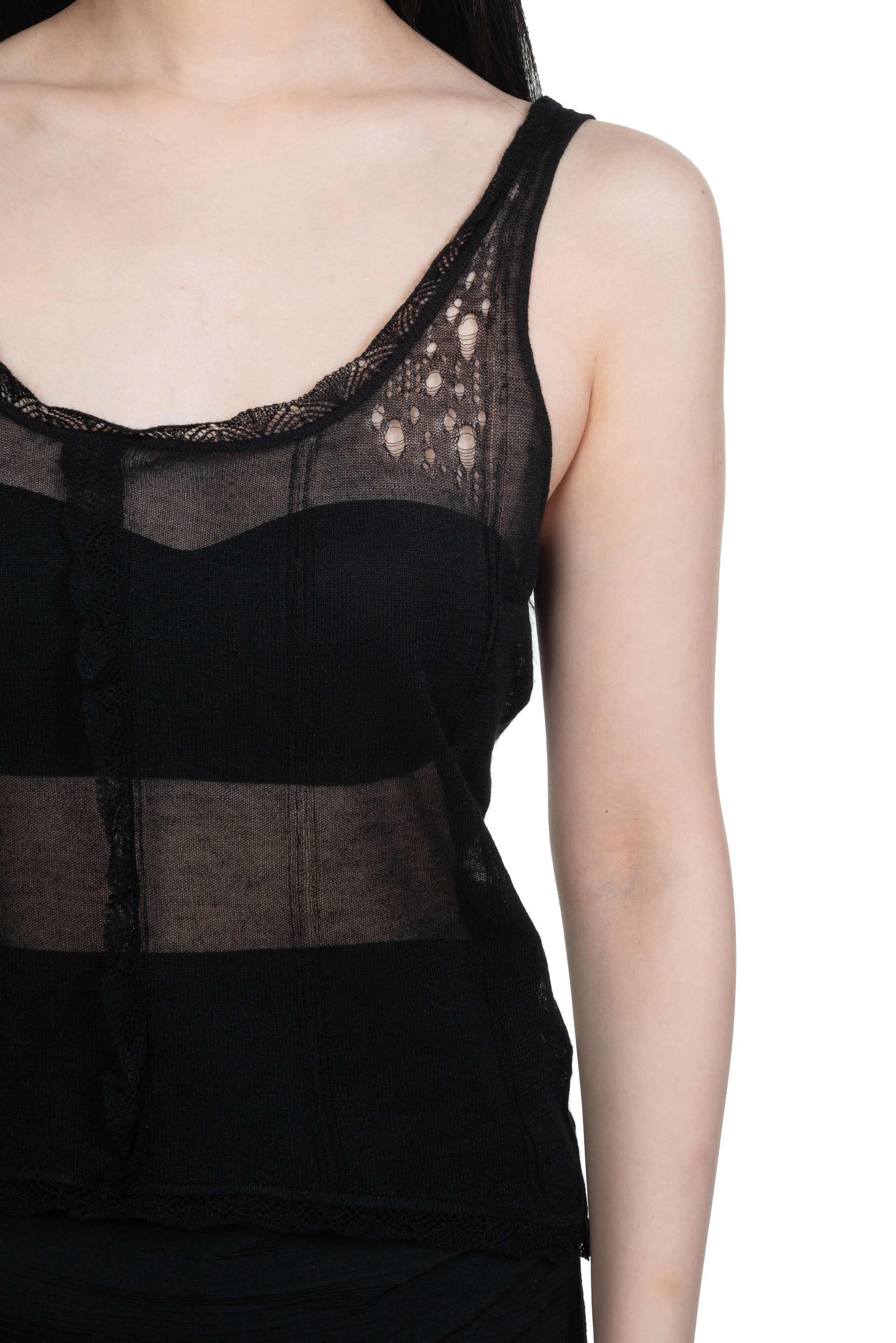 Sleeveless. Lace details on edges. Distressed details. Contrast fabric throughout. Slightly see through.