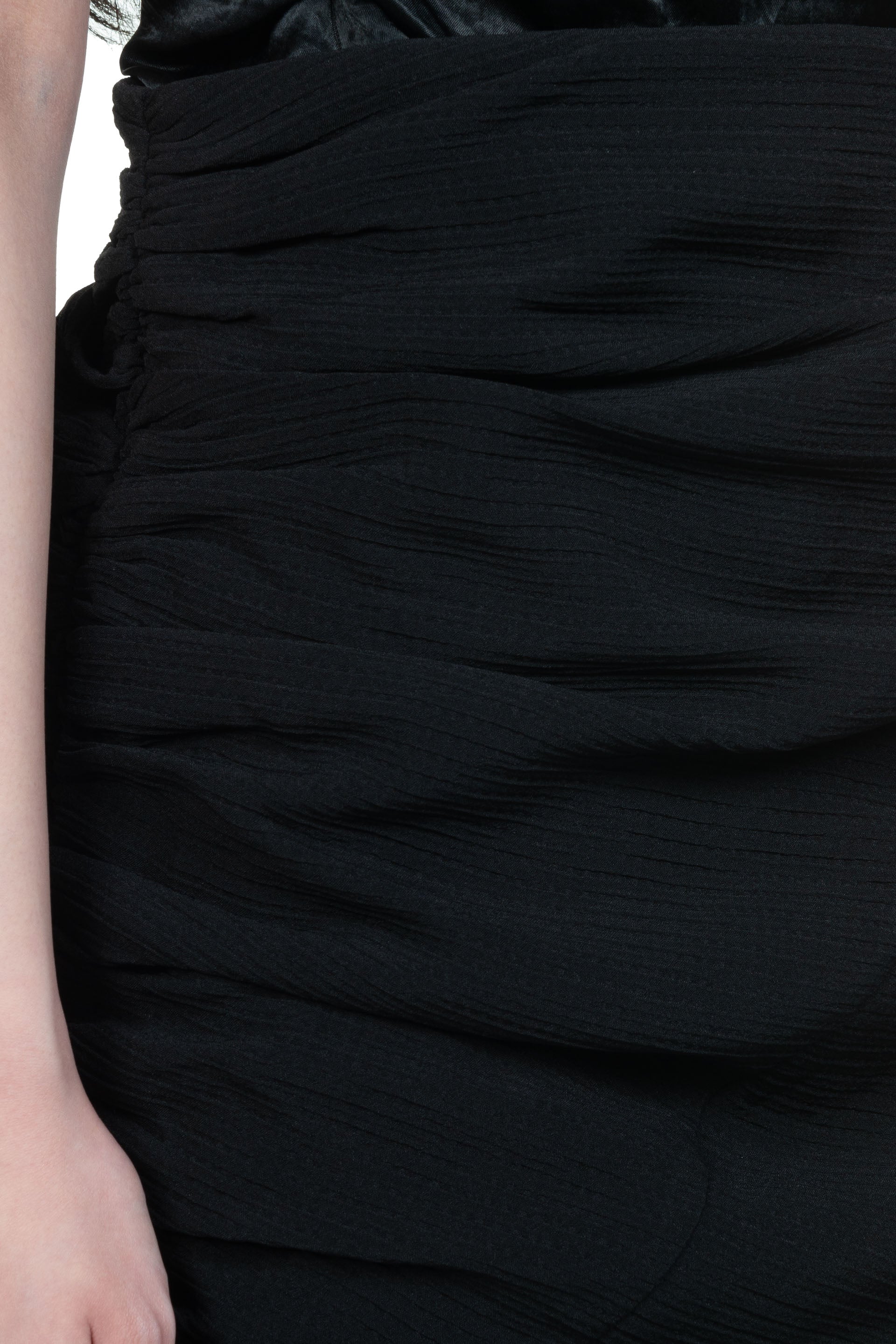 Zip closure at side. Cut out detailing. Contrast fabric. Pleated..