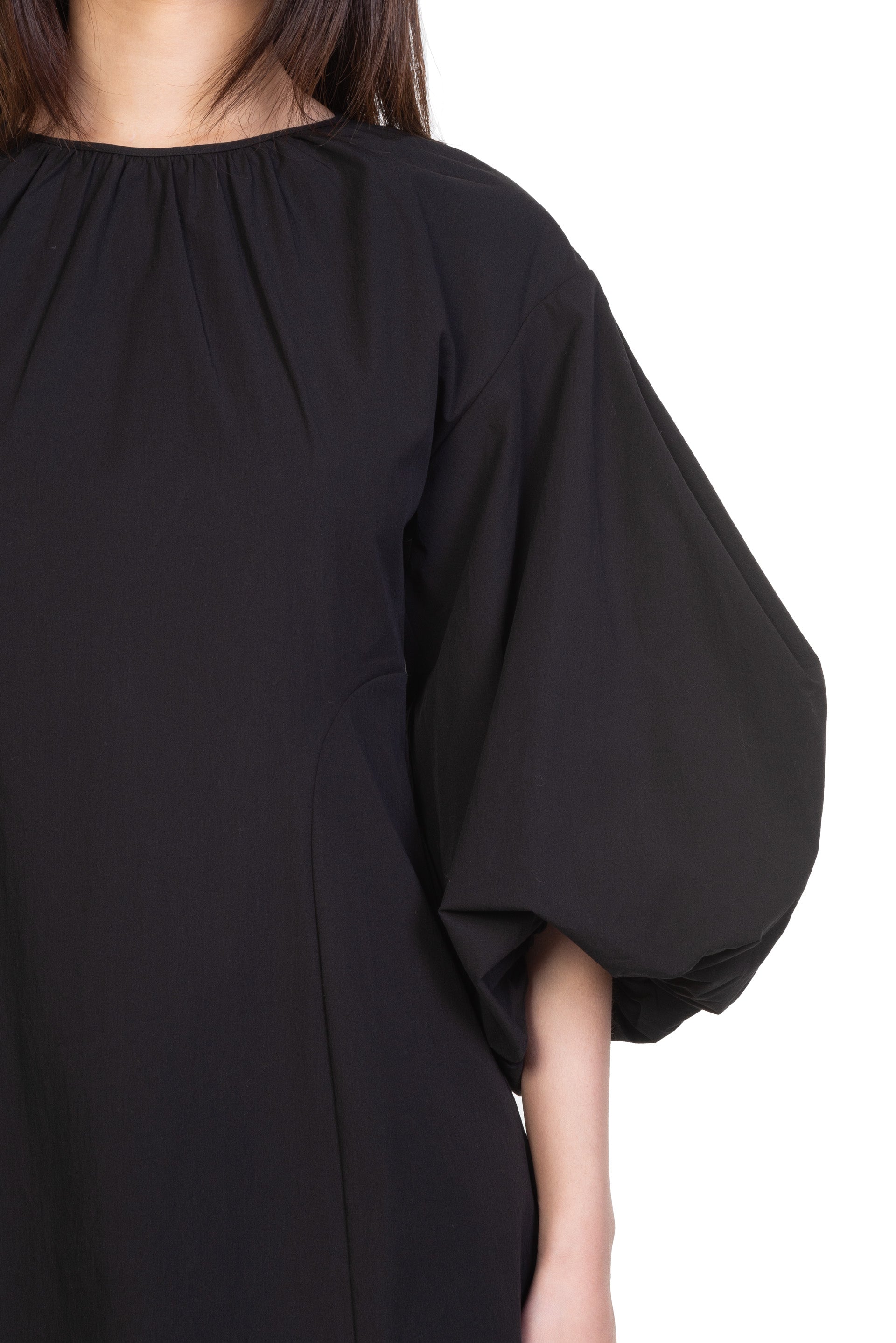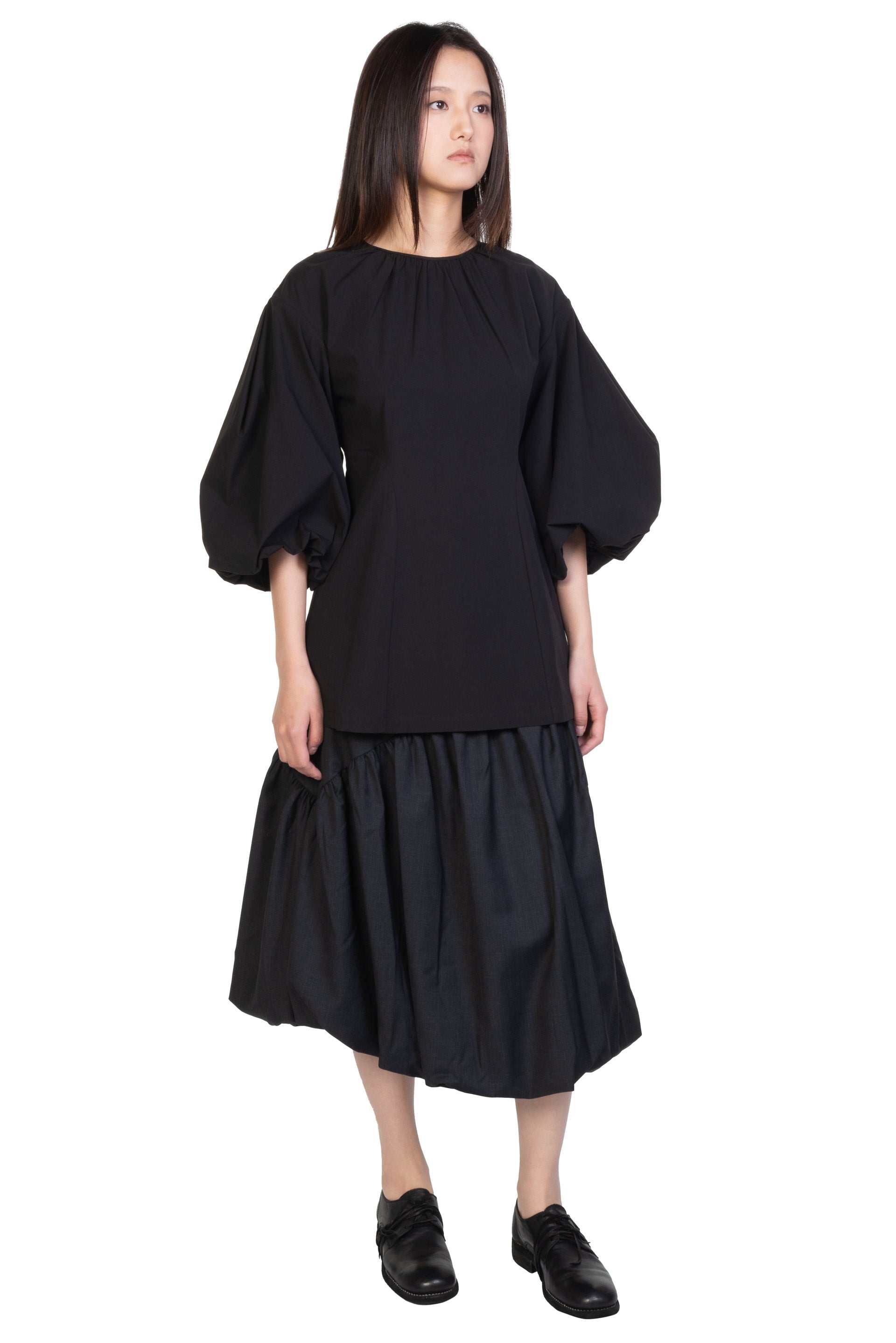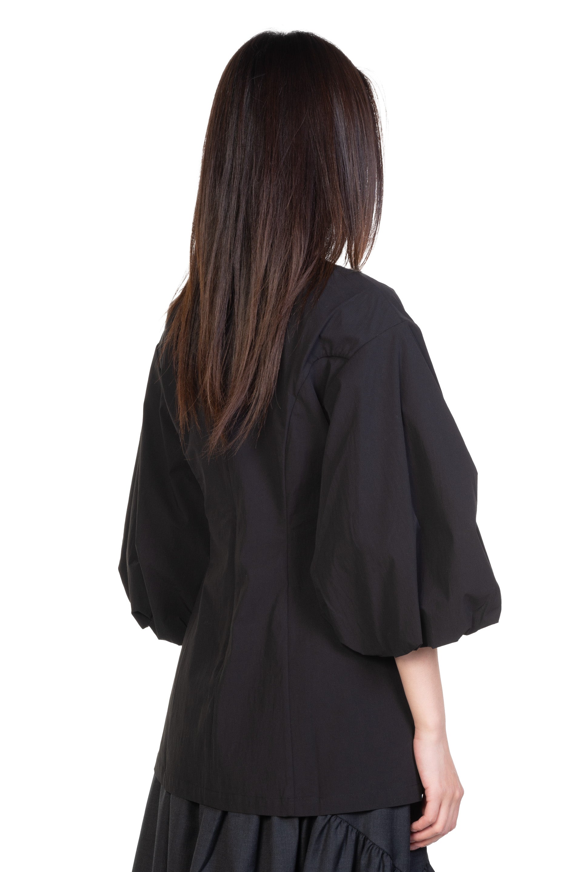 Puffy balloon sleeves. Round neck. Contrast fabric.