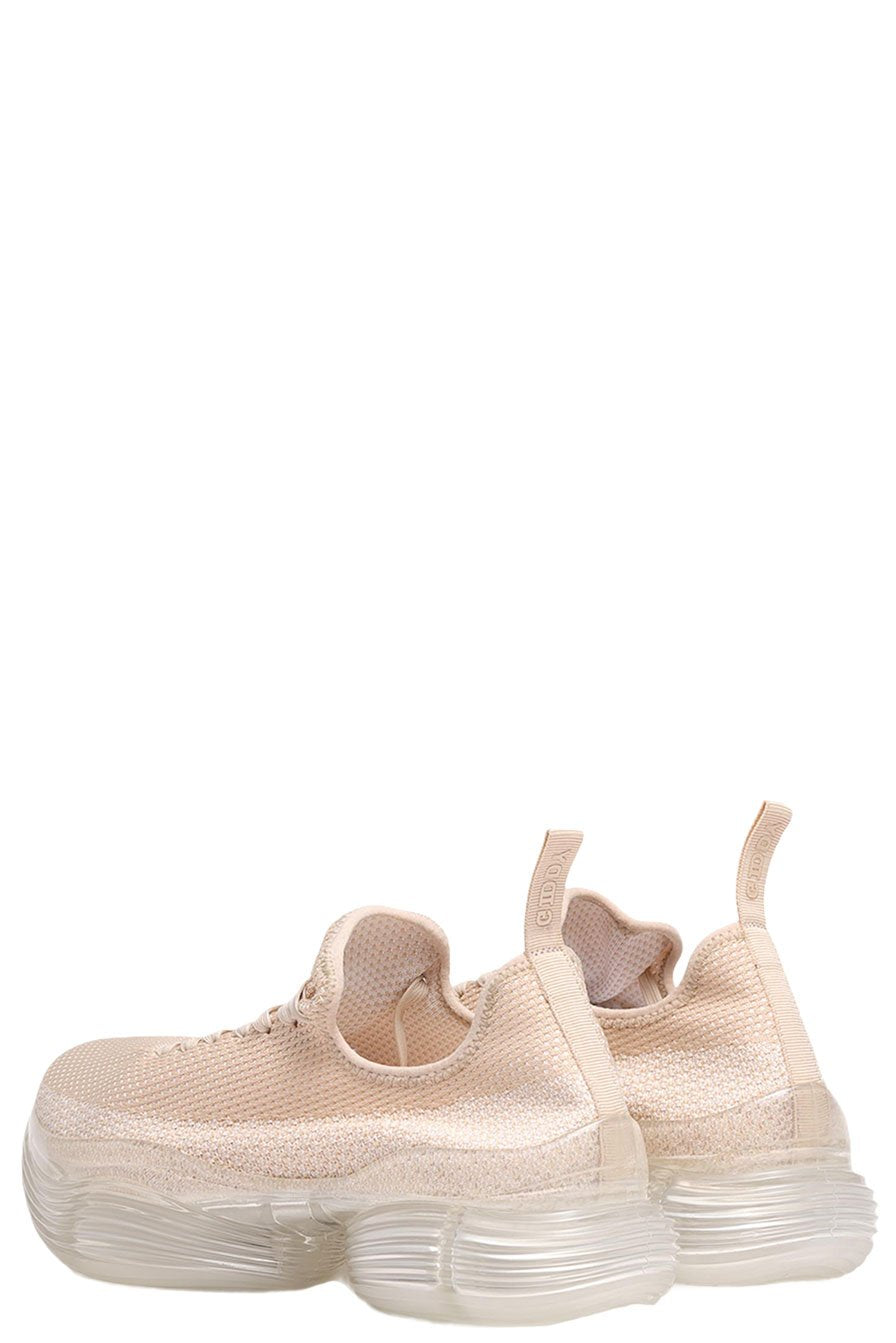 The distinctive shape of these shoes will make you feel as if your feet effortlessly glide in front of each other once you put them on. By putting on a pair of these shoes, you will feel as though you could walk anywhere. Thick-soled clear soles made of transparent spheres reminiscent of interstellar jelly fish draw the wearer's and viewer's attention to wearer's feet. In addition, the flexibility of the material is controlled to provide optimal cushioning when worn, creating a fluffy, floating sensation that you can't feel when you touch them with your hands. The knit upper, which is simple in contrast to the distinctive shape of the outsole, is deliberately minimalist in order to match with a wide range of fashion. The height of the heel is about 4 cm for all sizes, and while the heel is voluminous, it is transparent to reduce the appearance of weight.