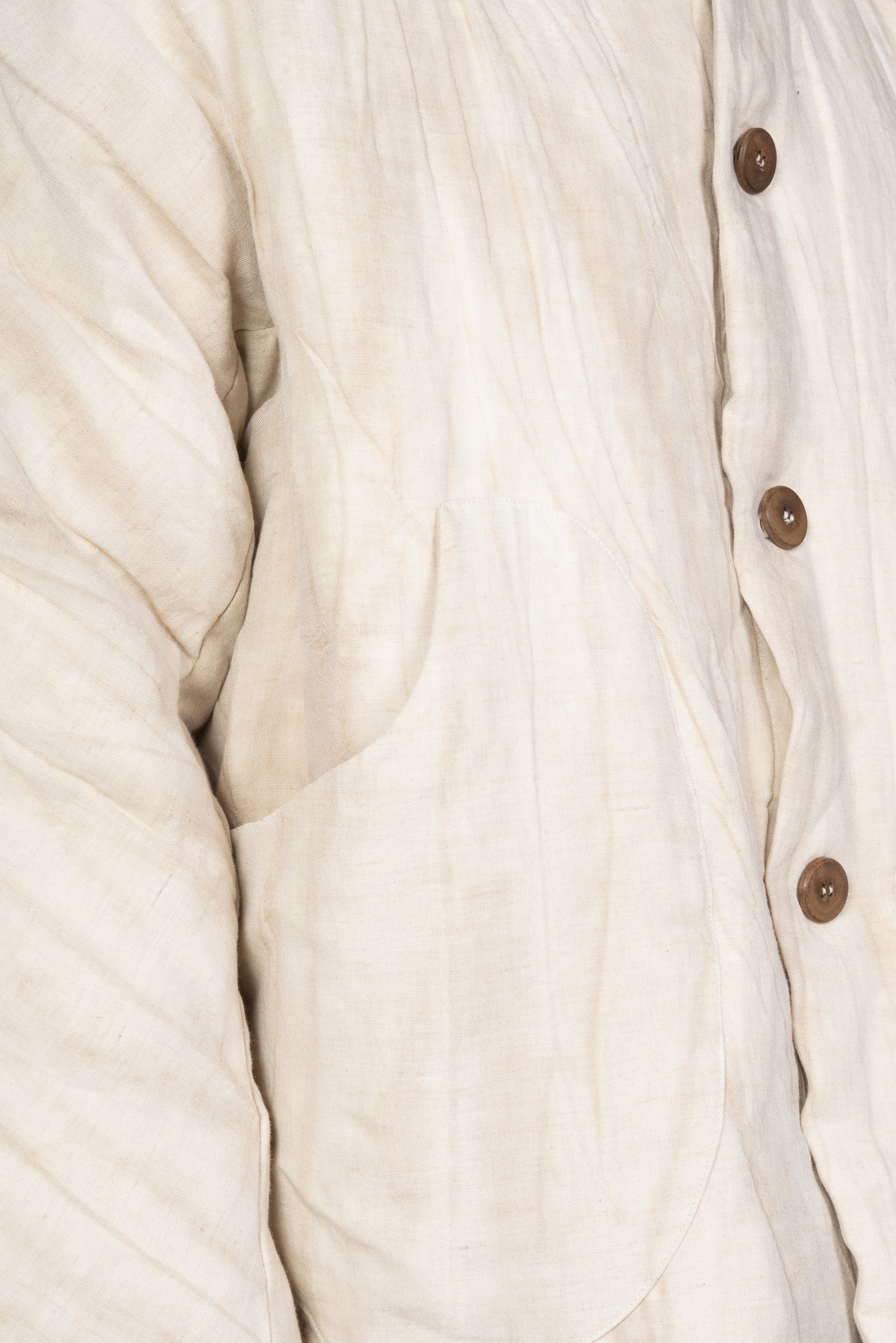 Padded with down feathers. Long sleeves. Button closure at front. Two side pockets. Inside pocket. Round pockets. Wooden buttons. Oversized fit.