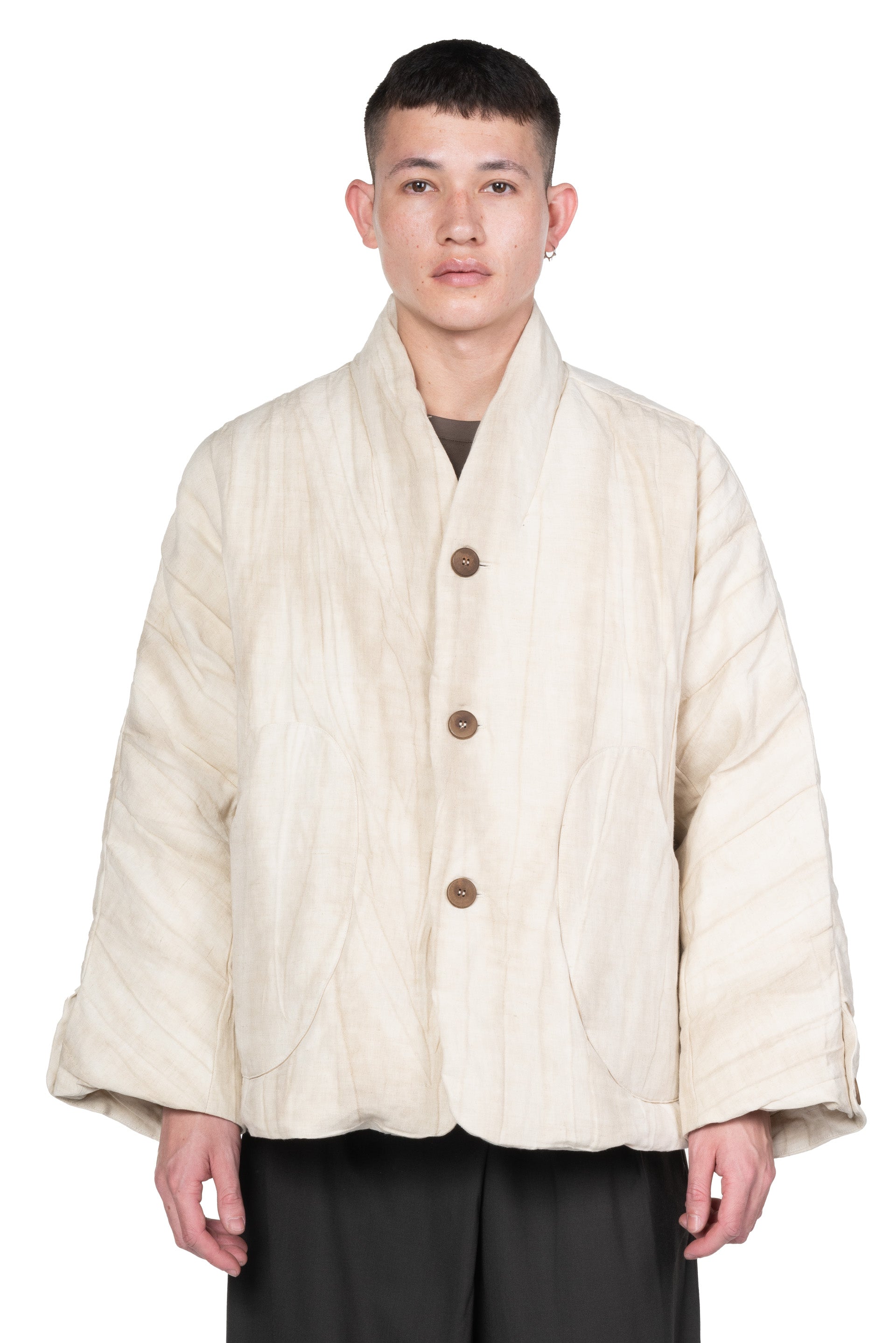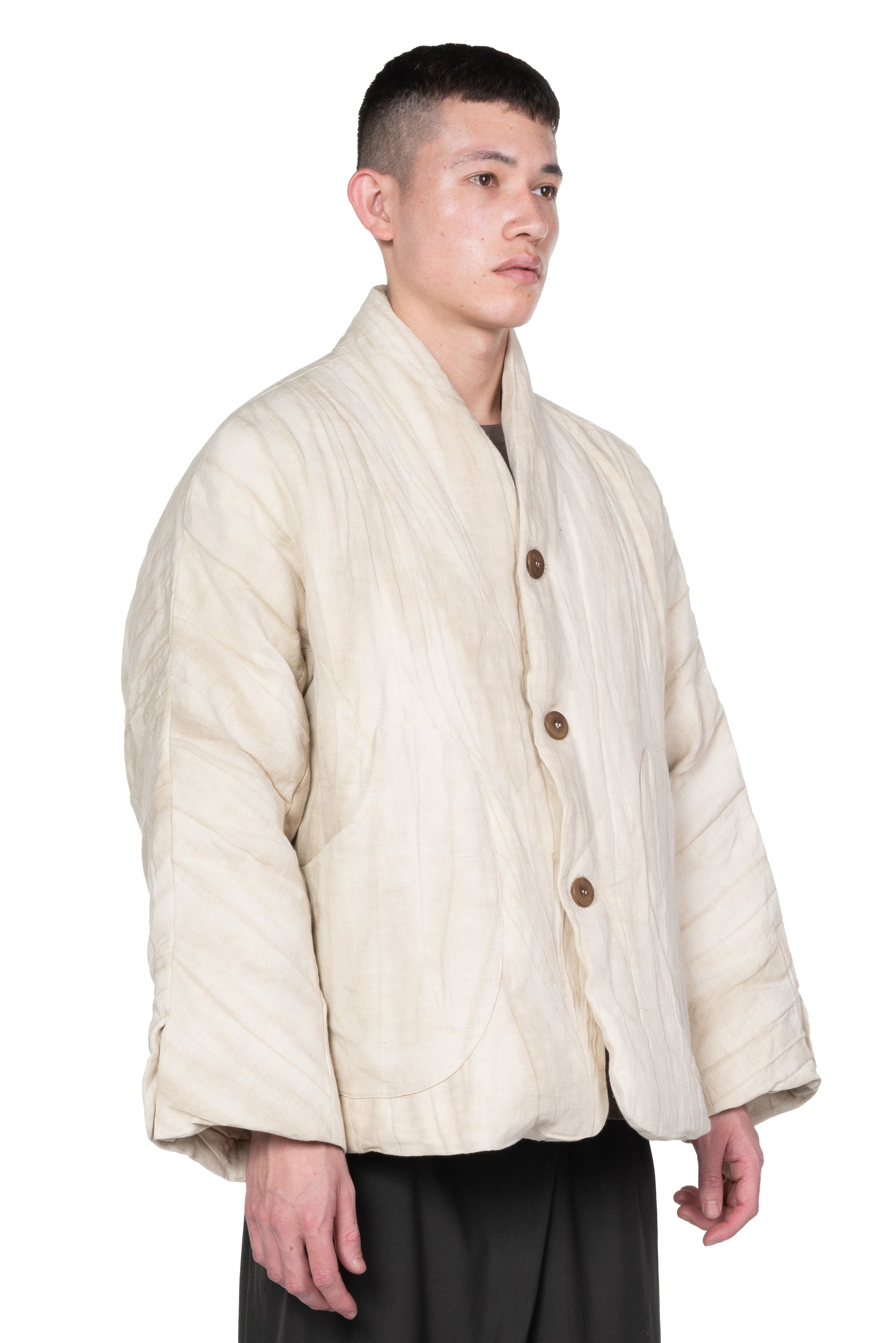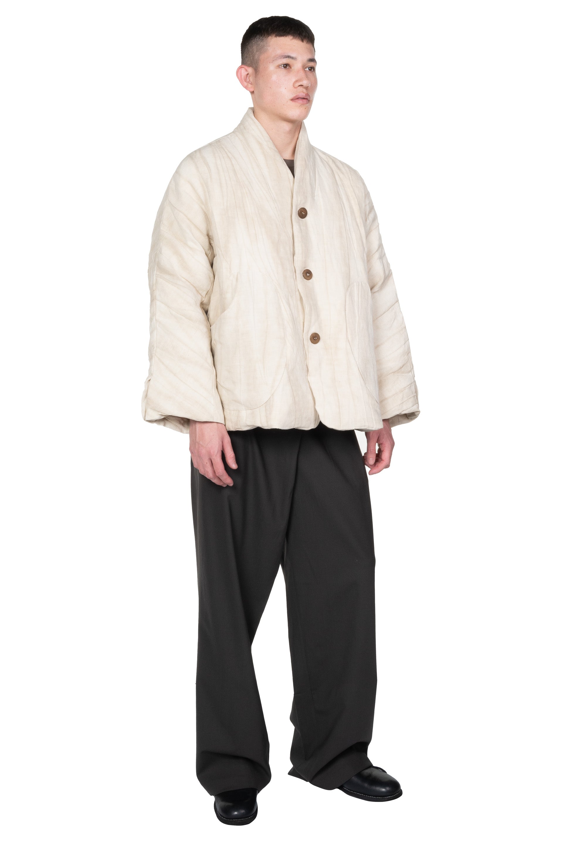 Kar Studio is an independent interior design studio, furniture and clothing brand exploring the cause and effect of aesthetics, integrating tradition and modernity. Kar is presenting modern design with Oriental philosophy. Inspired by art, literature, memories and emotions Kar focuses on design sensibility aiming to convey emotion that will resonate with people as seen with the Ivory White Padded Kimono Jacket.