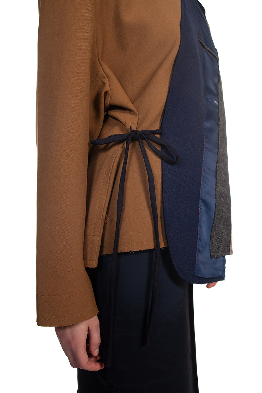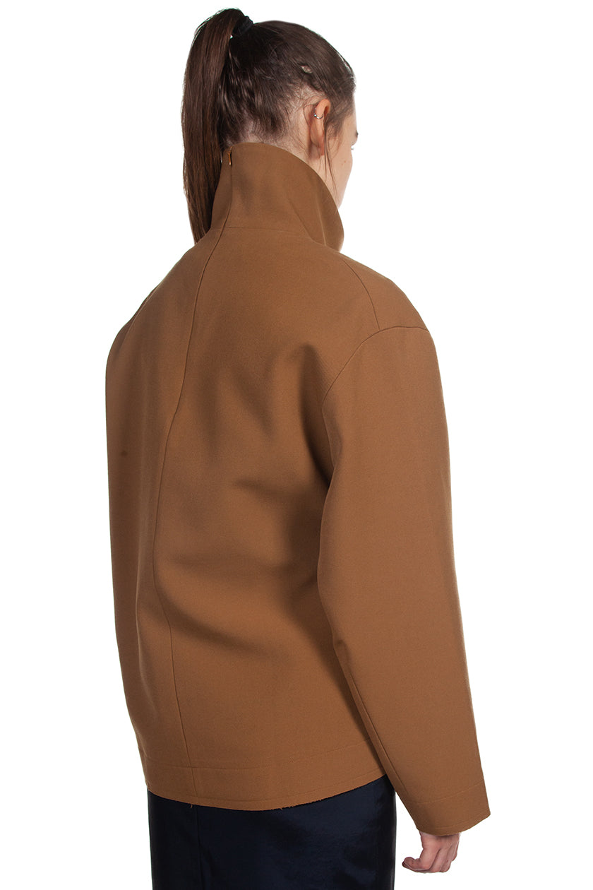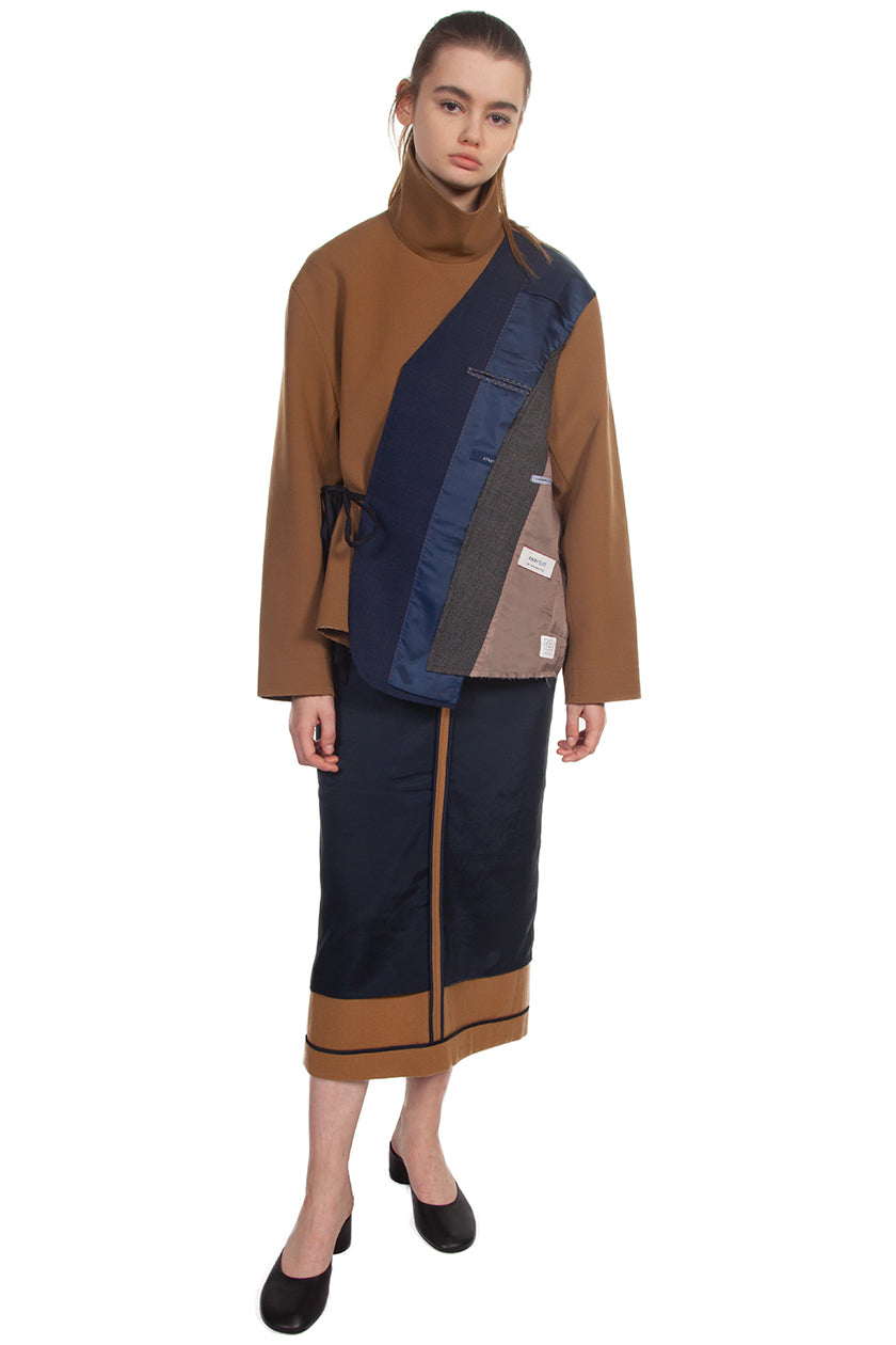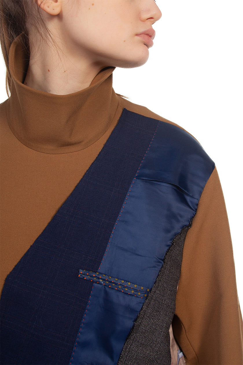 A top that stands out with a fragment of a dismantled jacket placed on a generously sized body with a oversized silhouette.
