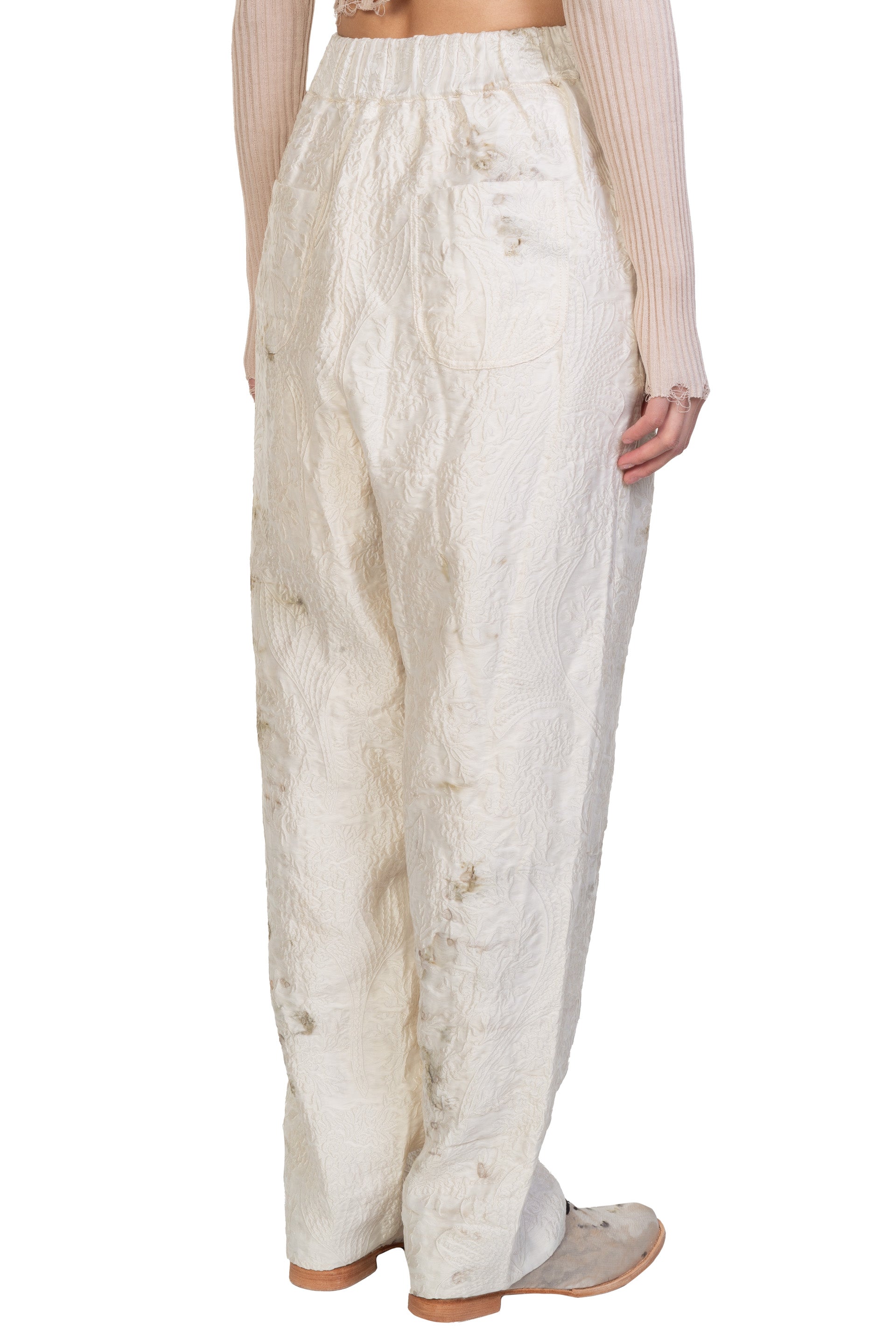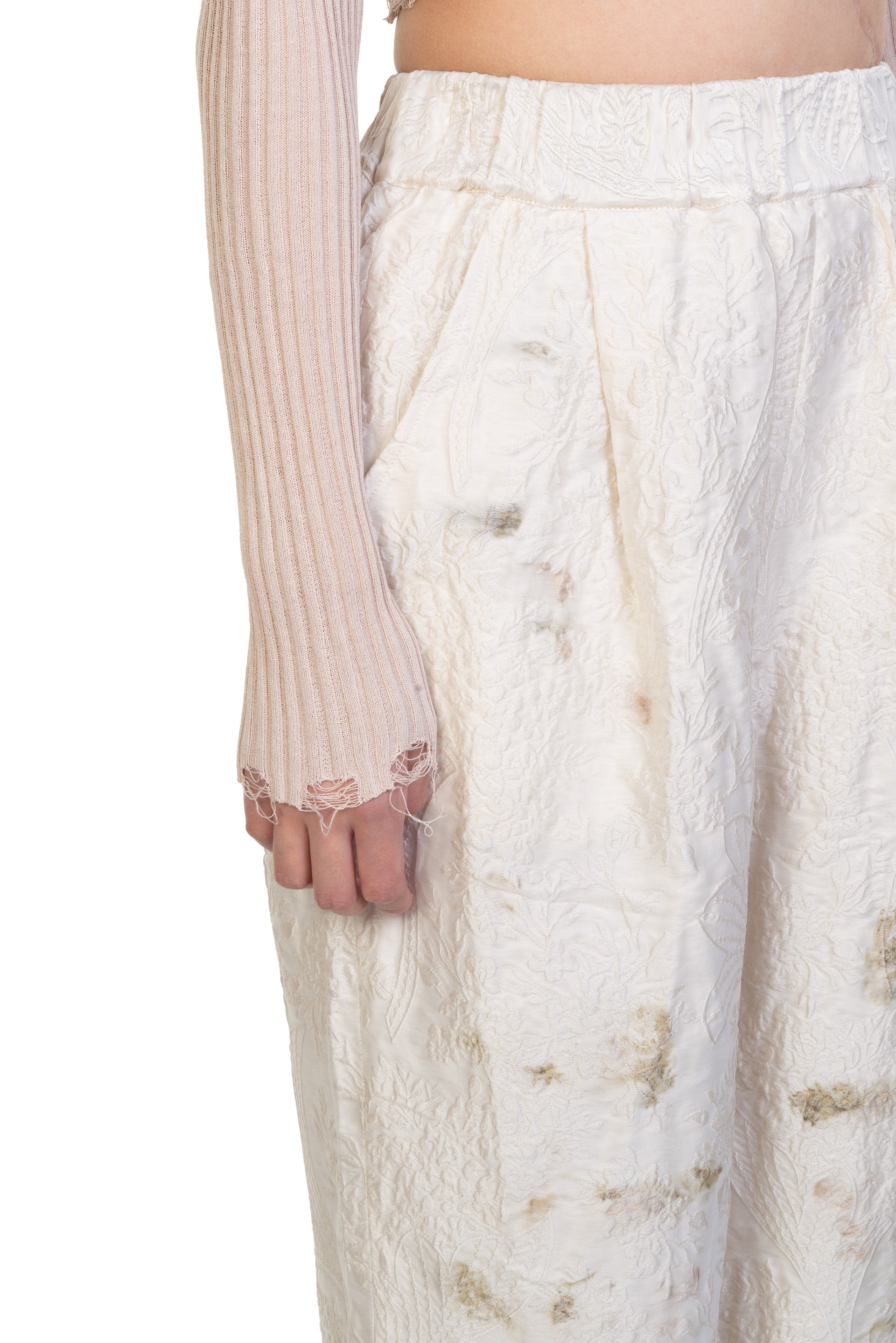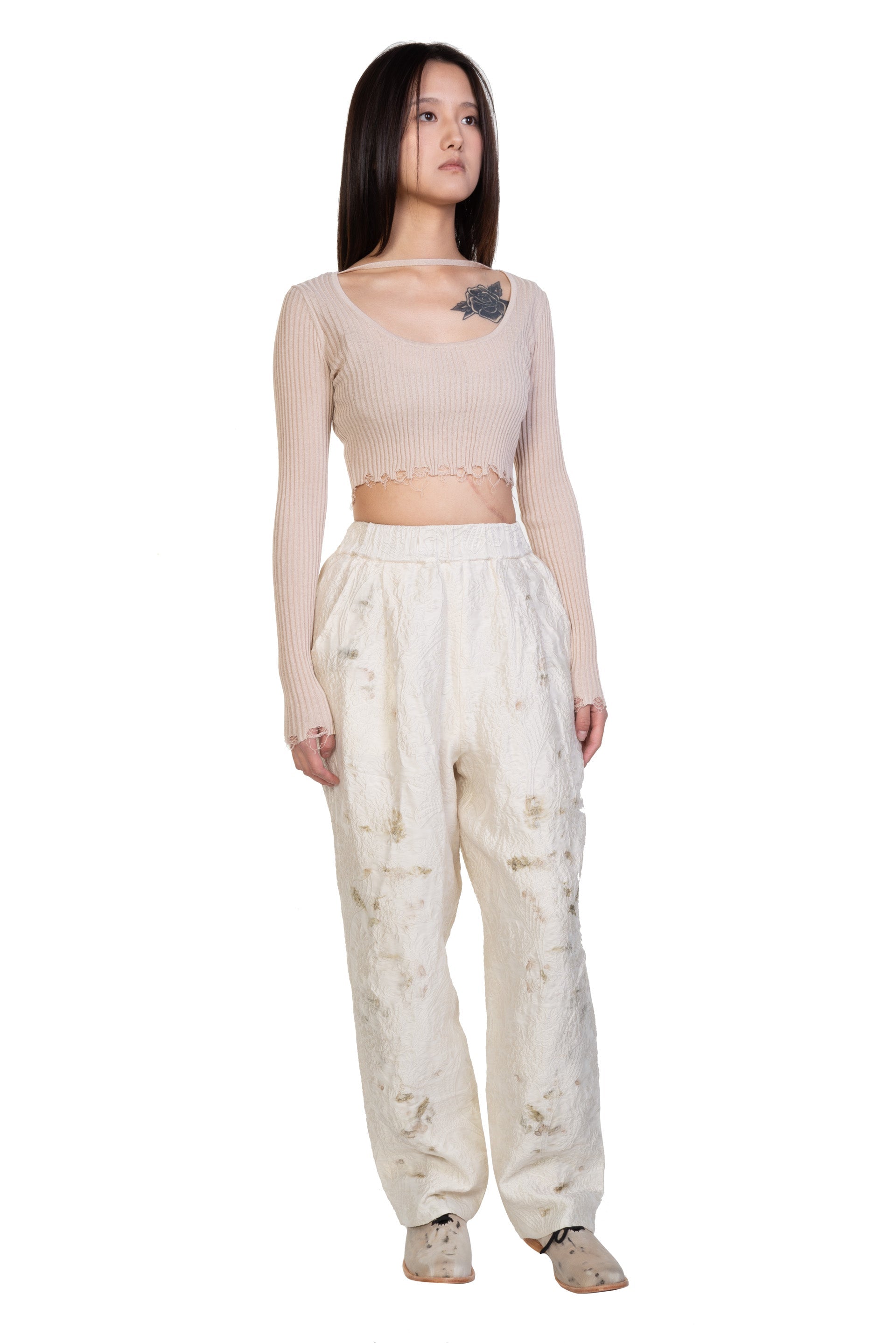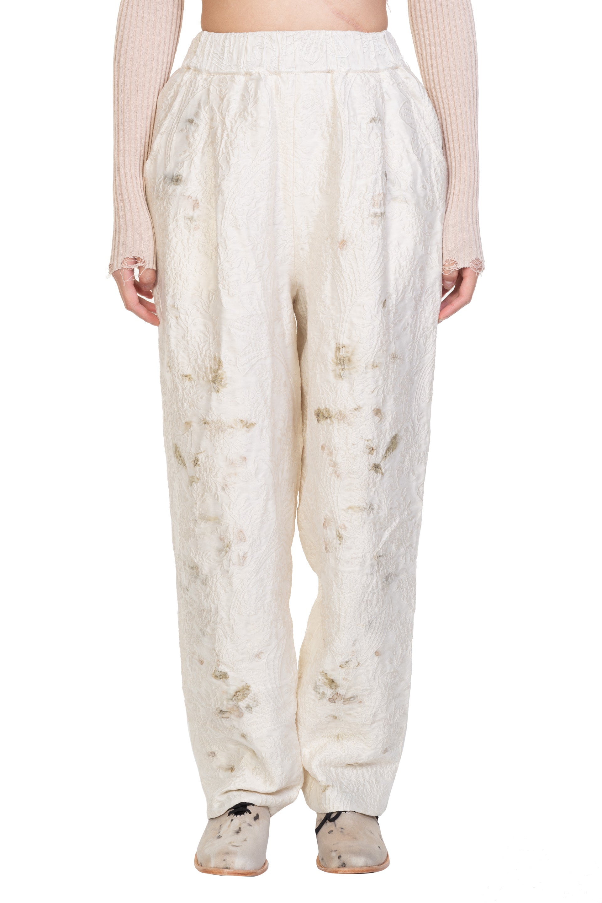 Yu Qun believes that everyone's character is multi-faceted and expressing spiritual independence. Fine hand-stitched threads, old mottled colours and patterns, and unconventional cuts are what Mute Dance has been exploring. The leaves and stems of fresh plants and berries, dried medicinal materials, old metals and so on are combined with the ancient and traditional dyeing technology to dye fabrics and paper as seen with the Jacquard Dyed Trousers.