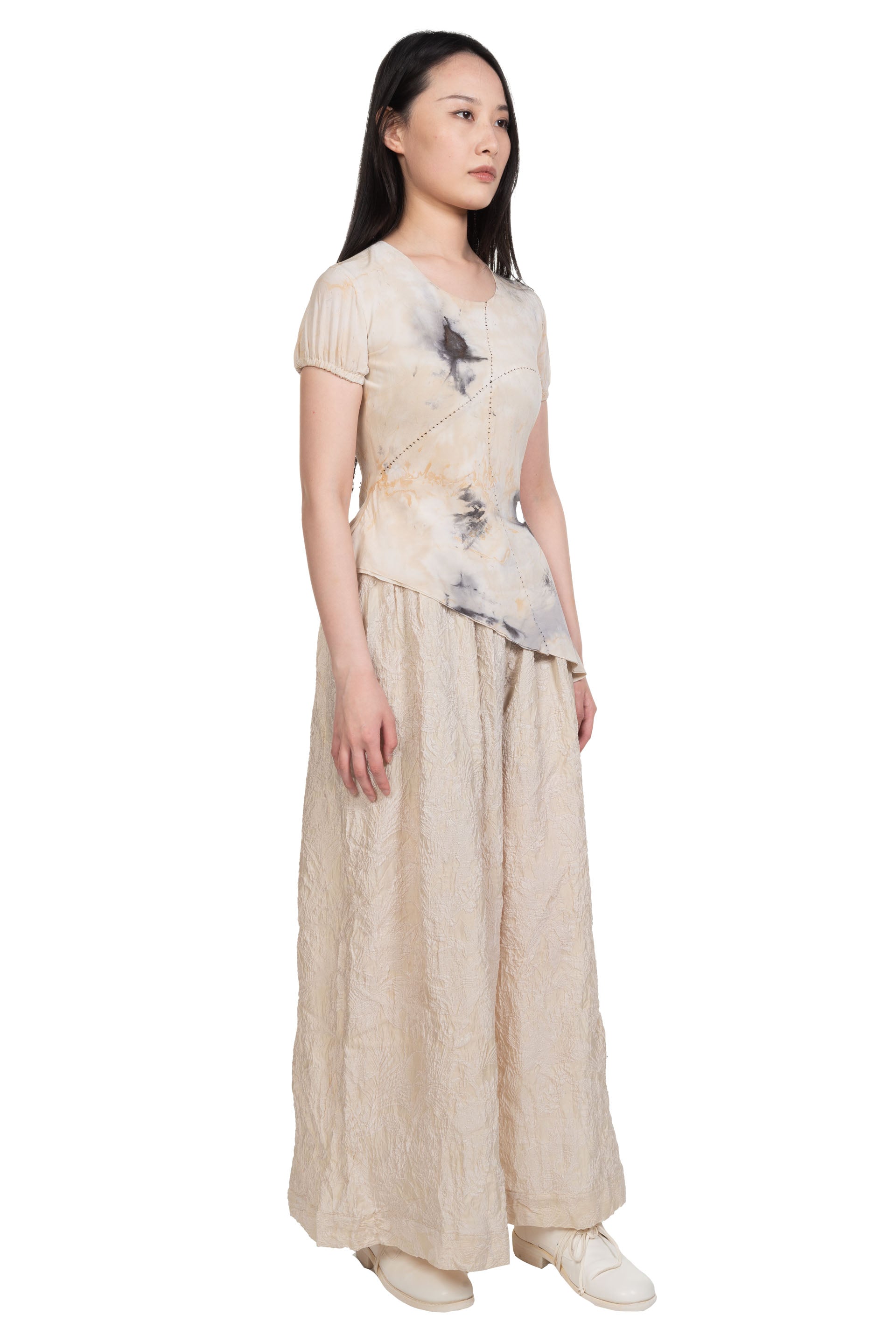 Yu Qun believes that everyone's character is multi-faceted and expressing spiritual independence. Fine hand-stitched threads, old mottled colours and patterns, and unconventional cuts are what Mute Dance has been exploring. The leaves and stems of fresh plants and berries, dried medicinal materials, old metals and so on are combined with the ancient and traditional dyeing technology to dye fabrics and paper as seen with the Jacquard Pants Celadon.