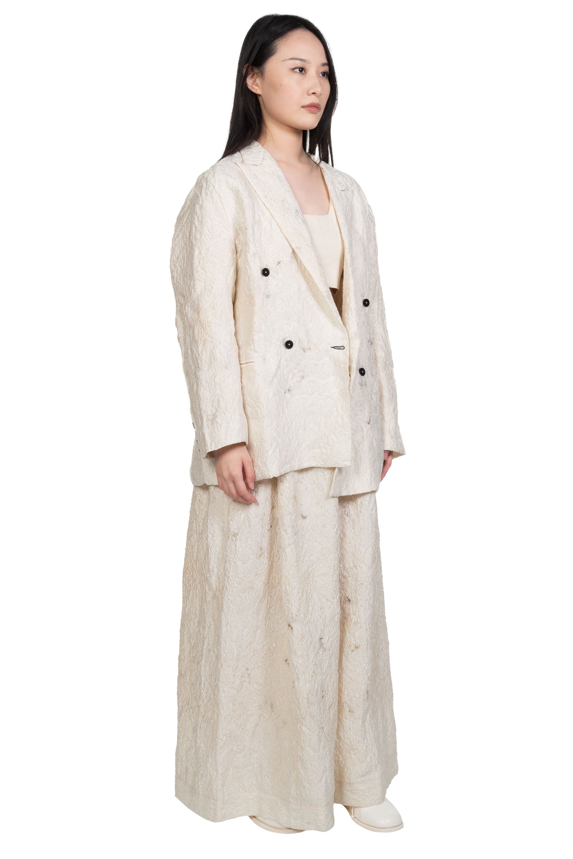 Yu Qun believes that everyone's character is multi-faceted and expressing spiritual independence. Fine hand-stitched threads, old mottled colours and patterns, and unconventional cuts are what Mute Dance has been exploring. The leaves and stems of fresh plants and berries, dried medicinal materials, old metals and so on are combined with the ancient and traditional dyeing technology to dye fabrics and paper as seen with the Jacquard Trousers.