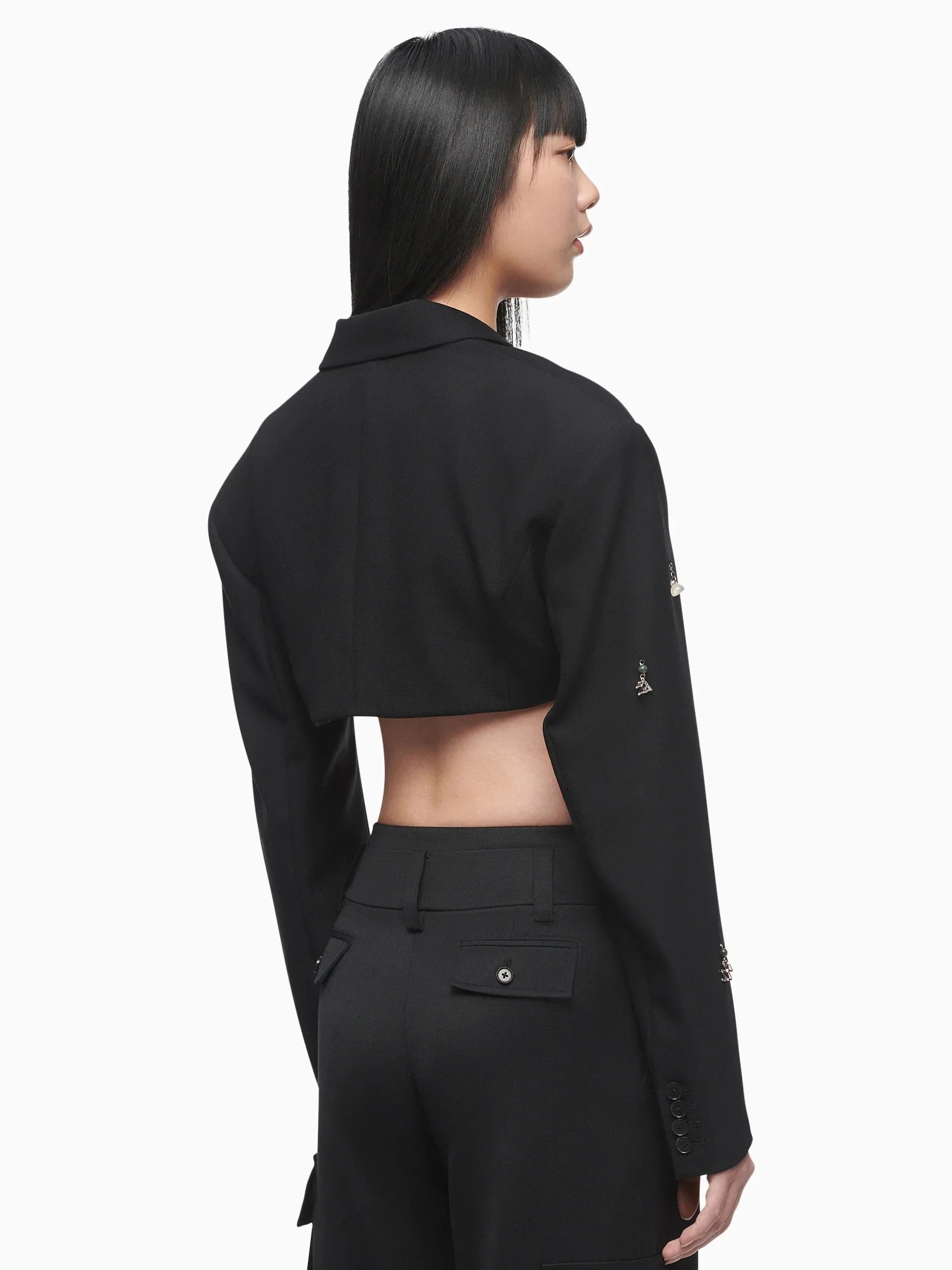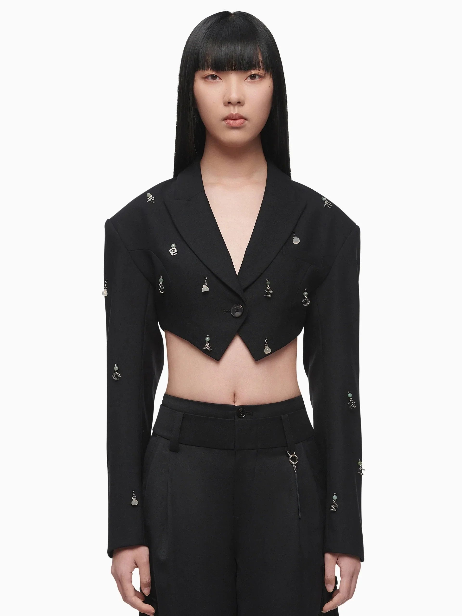 Jade Stone Embellished Jacket from Feng Chen Wang. Cropped black blazer embellished with metal FCW logo all over, single breast silhouette with button closure, slightly exaggerated shoulders and an asymmetrical hem.