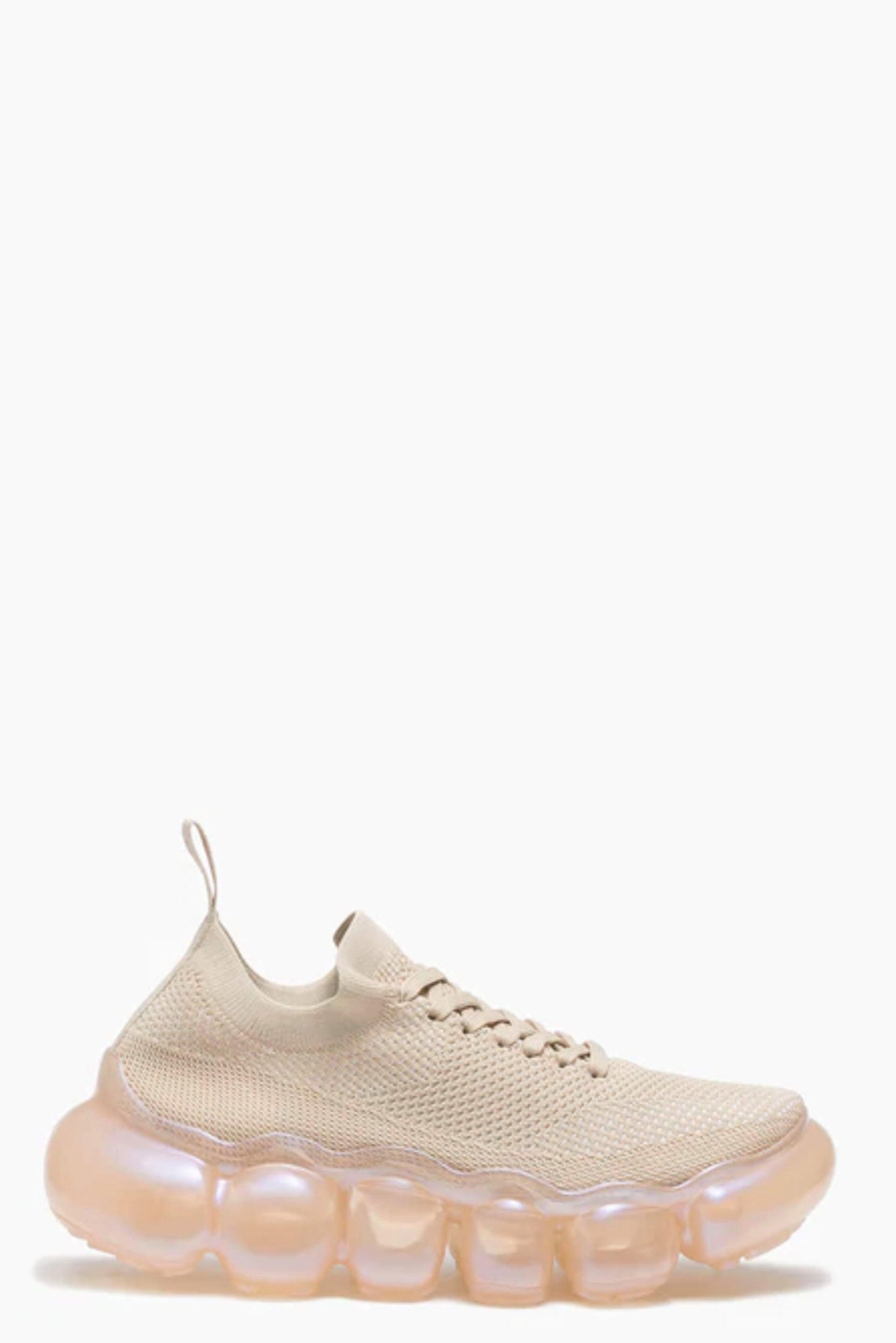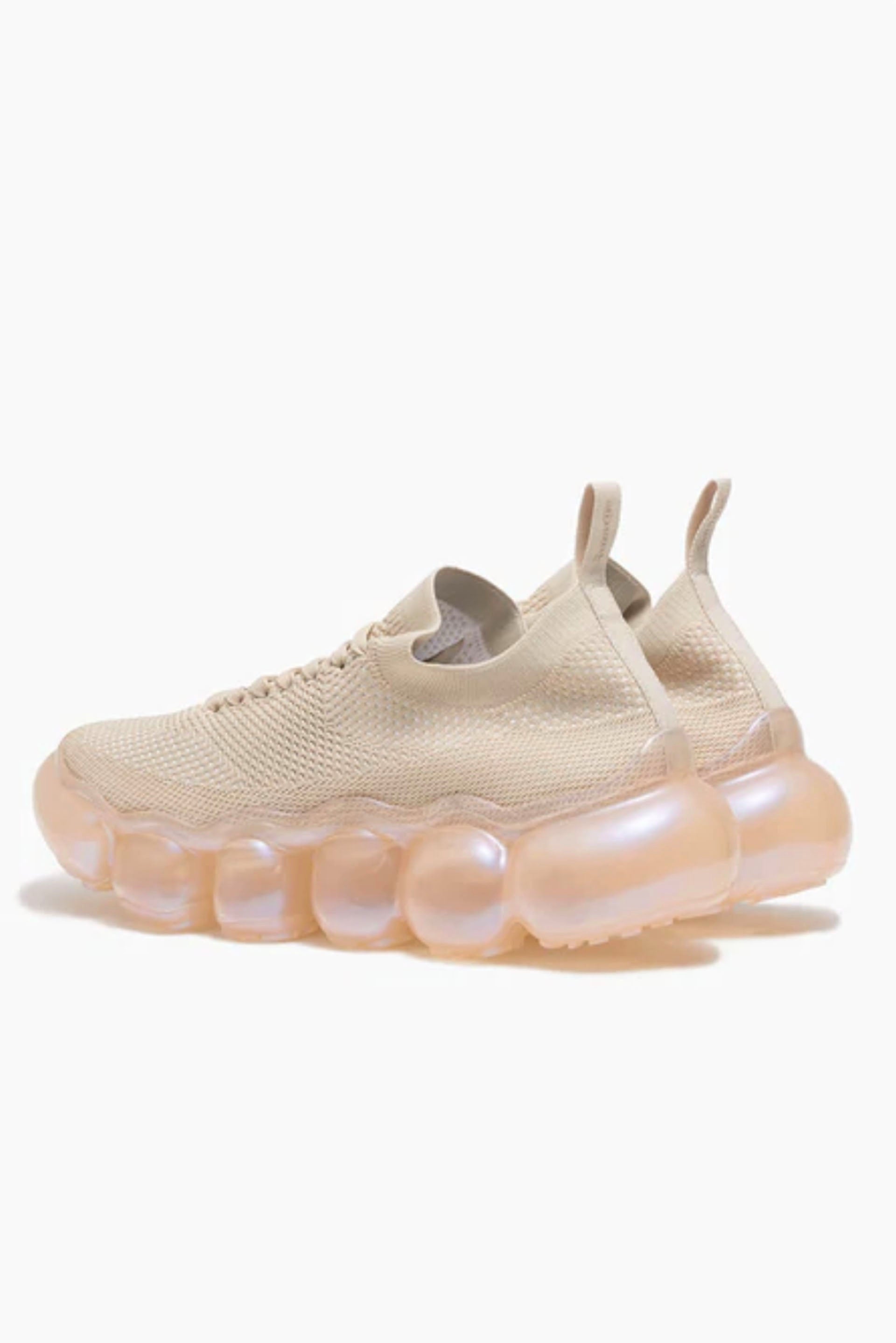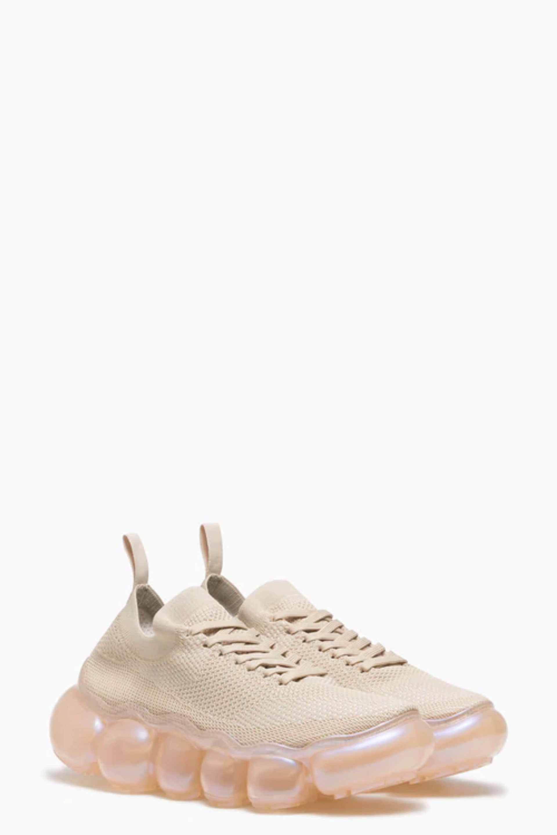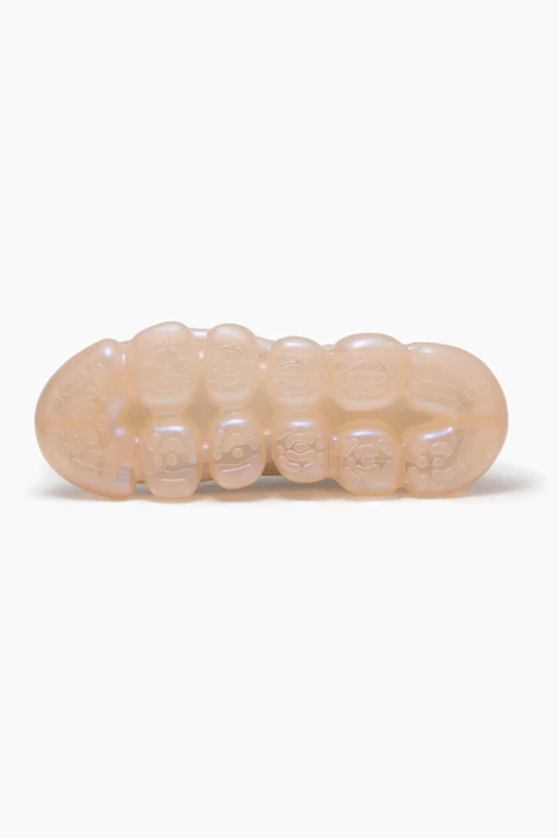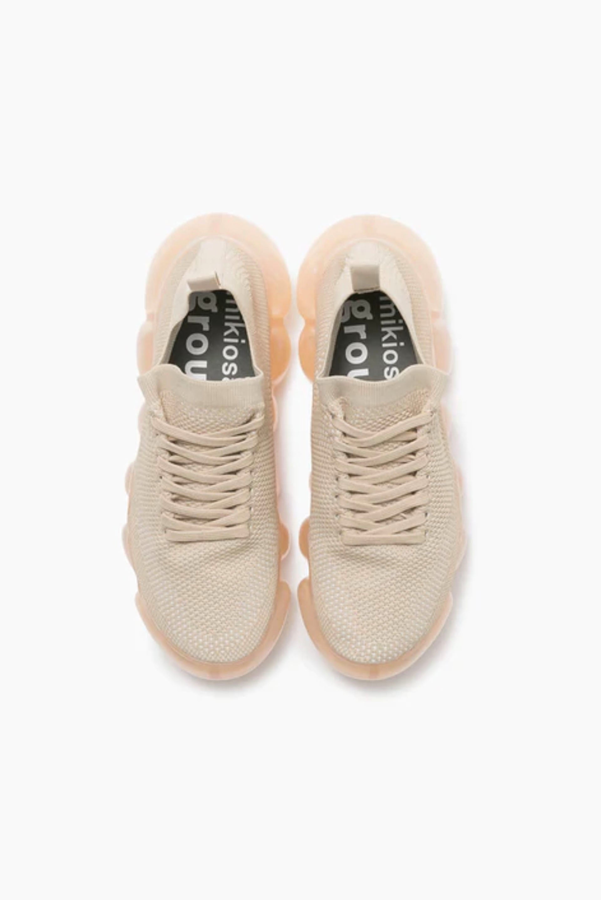 Grounds translates the pulse of Japanese youth into bold shoe design as seen with the Jewelry Aurora Nude Nude Shoes that are wearable jewelry. Thick-soled clear soles made of transparent spheres reminiscent of jewelry draw the wearer's and viewer's attention to wearer's feet. The sole has a lamé finish, giving it an aurora-like glittery sole. Each sphere is designed to move softly with the movement of your foot, giving you a unique walking and gripping experience. In addition, the flexibility of the material is controlled to provide optimal cushioning when worn, creating a fluffy, floating sensation that you can't feel when you touch them with your hands. The knit upper, which is simple in contrast to the distinctive shape of the outsole, is deliberately minimalist in order to match with a wide range of fashion. The height of the heel is about 5 cm for all sizes, and while the heel is voluminous, it is transparent to reduce the appearance of weight.