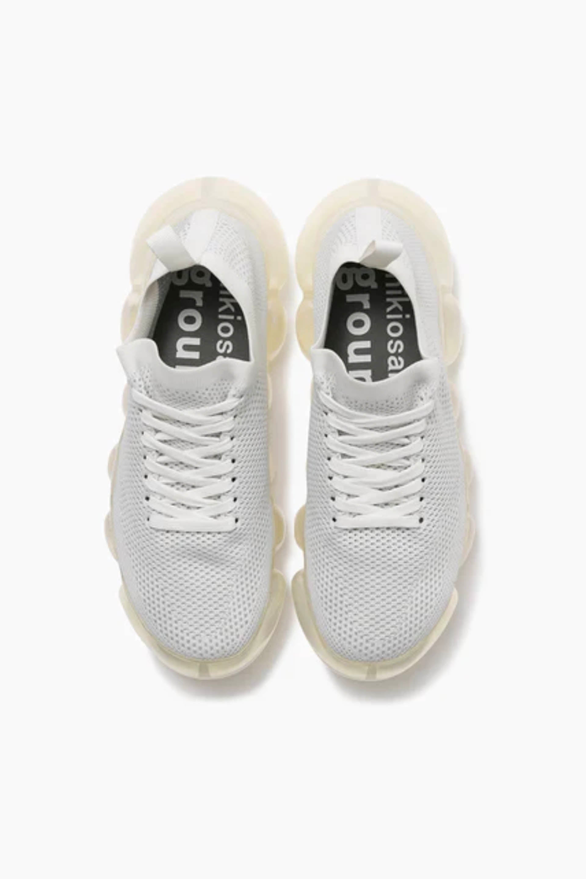 Grounds translates the pulse of Japanese youth into bold shoe design as seen with the Jewelry Aurora White Gray Clear. Shoes that are wearable jewelry. Thick-soled clear soles made of transparent spheres reminiscent of jewelry draw the wearer's and viewer's attention to wearer's feet. The sole has a lamé finish, giving it an aurora-like glittery sole. Each sphere is designed to move softly with the movement of your foot, giving you a unique walking and gripping experience. In addition, the flexibility of the material is controlled to provide optimal cushioning when worn, creating a fluffy, floating sensation that you can't feel when you touch them with your hands. The knit upper, which is simple in contrast to the distinctive shape of the outsole, is deliberately minimalist in order to match with a wide range of fashion. The height of the heel is about 5 cm for all sizes, and while the heel is voluminous, it is transparent to reduce the appearance of weight.