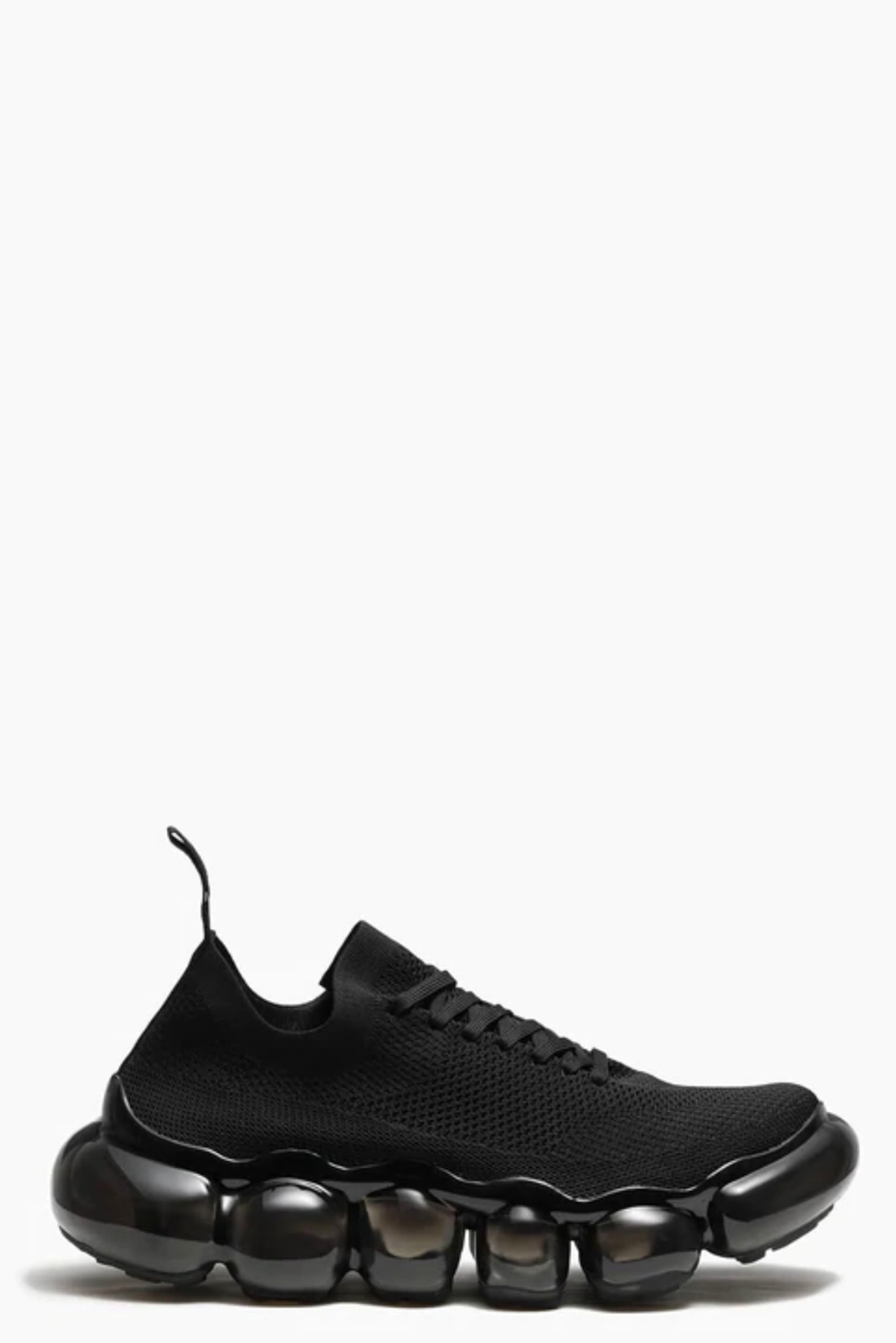 Thick Black clear soles made of transparent spheres reminiscent of jewelry draw the wearer's and viewer's attention to wearer's feet. Each sphere is designed to move softly with the movement of your foot, giving you a unique walking and gripping experience. In addition, the flexibility of the material is controlled to provide optimal cushioning when worn, creating a fluffy, floating sensation that you can't feel when you touch them with your hands.The Black knit upper, which is simple in contrast to the distinctive shape of the outsole, is deliberately minimalist in order to match with a wide range of fashion. The height of the heel is about 5 cm for all sizes, and while the heel is voluminous, it is transparent to reduce the appearance of weight.