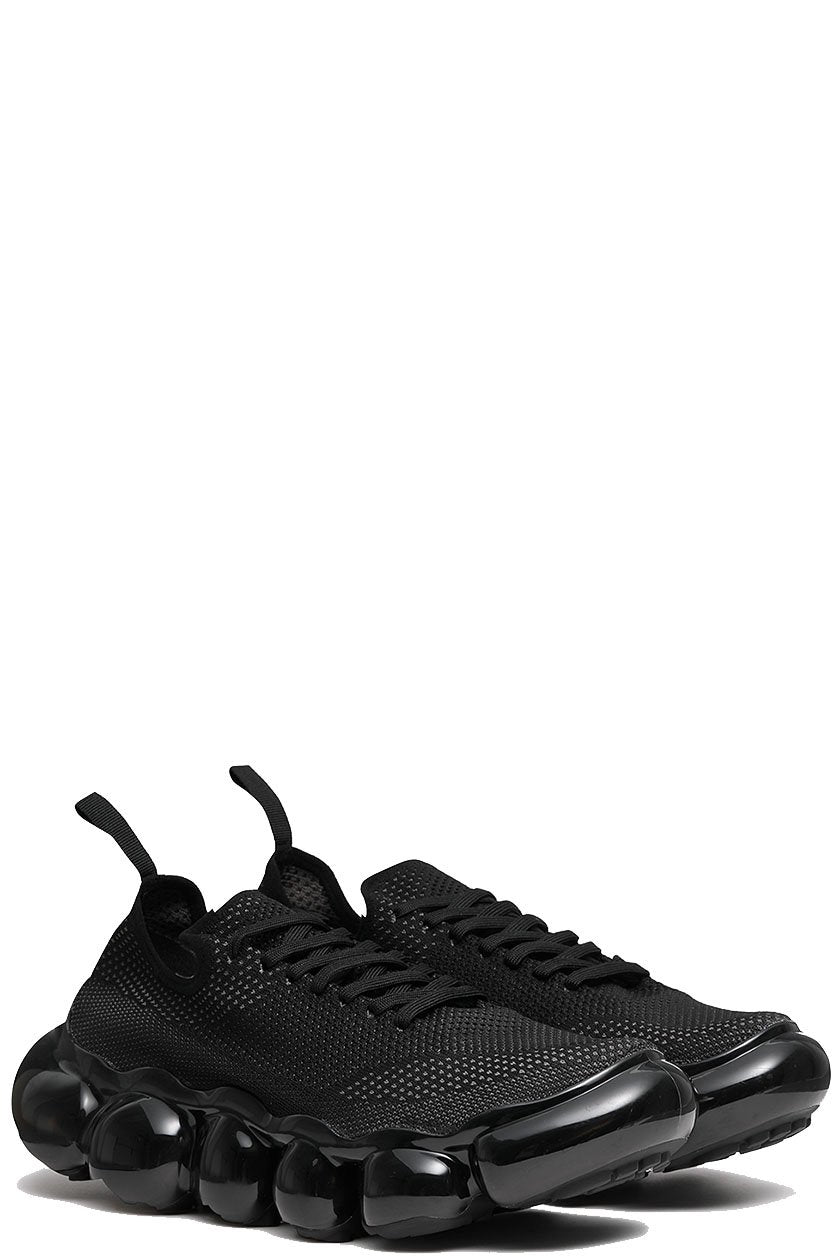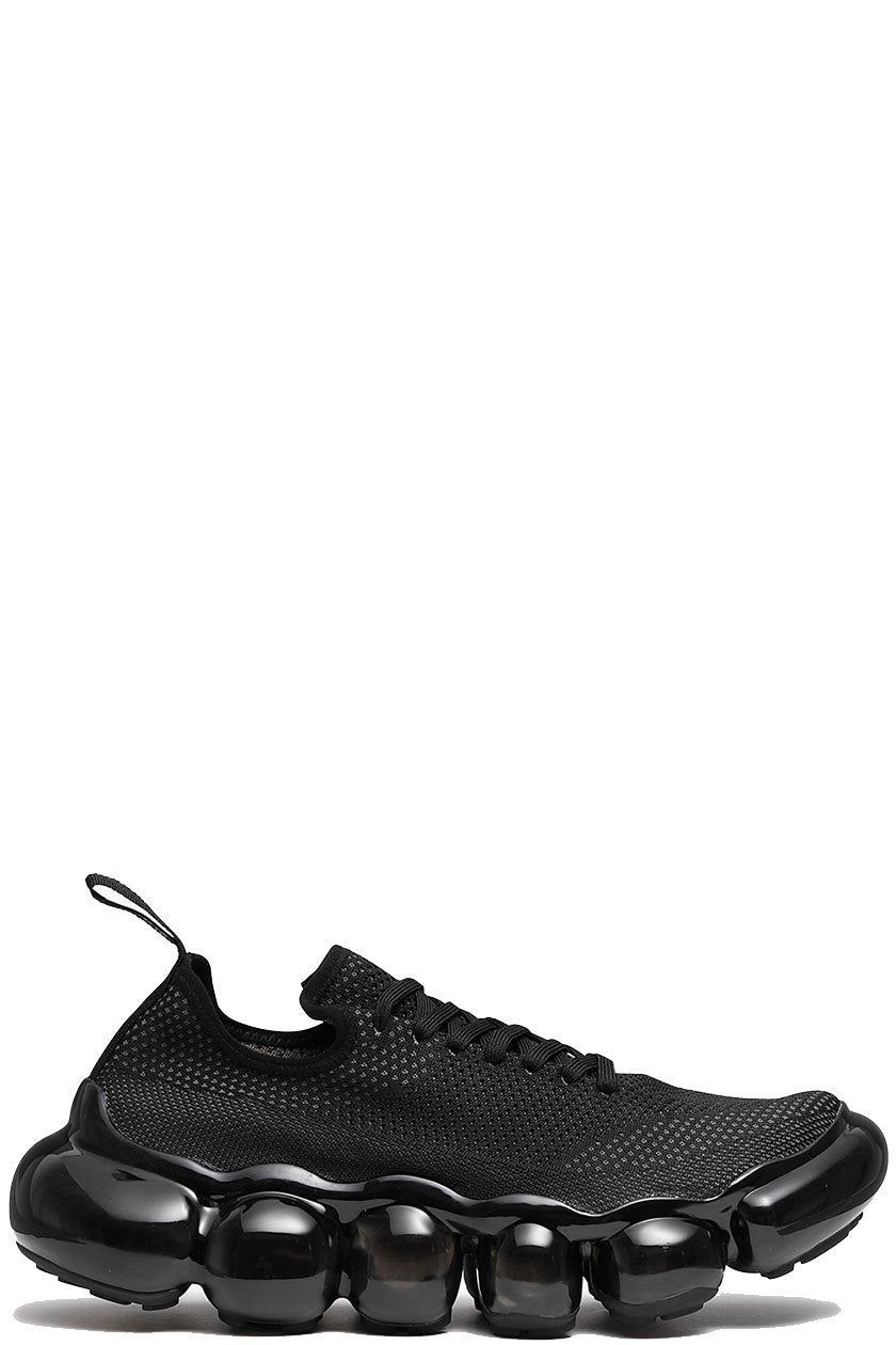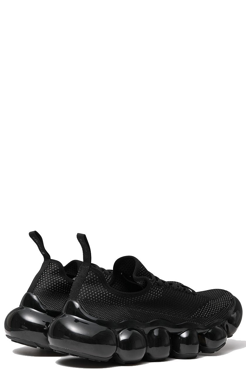 Thick Black clear soles made of transparent spheres reminiscent of jewelry draw the wearer's and viewer's attention to wearer's feet. Each sphere is designed to move softly with the movement of your foot, giving you a unique walking and gripping experience. In addition, the flexibility of the material is controlled to provide optimal cushioning when worn, creating a fluffy, floating sensation that you can't feel when you touch them with your hands.The Black Gray knit upper, which is simple in contrast to the distinctive shape of the outsole, is deliberately minimalist in order to match with a wide range of fashion. The height of the heel is about 5 cm for all sizes, and while the heel is voluminous, it is transparent to reduce the appearance of weight.