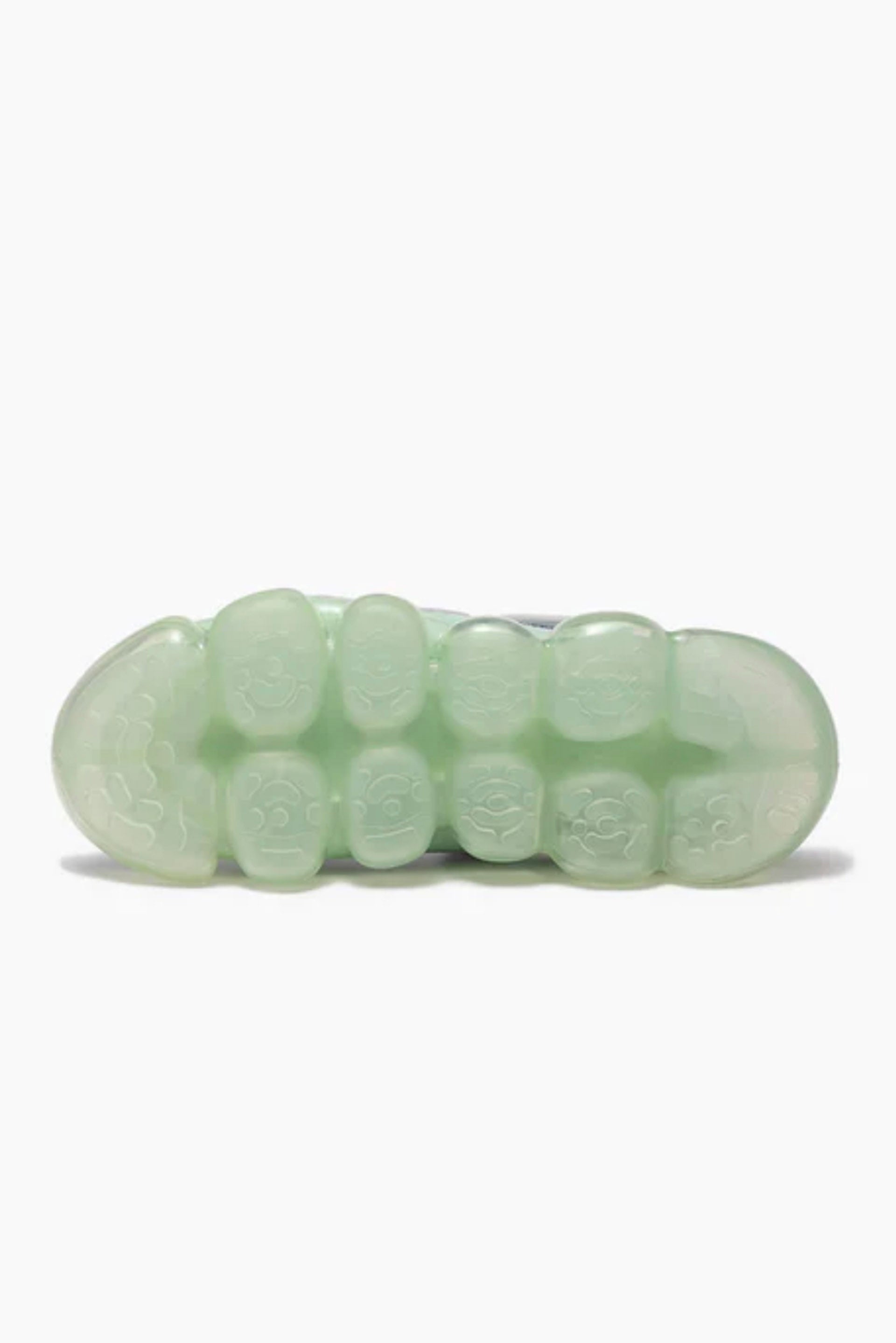 Thick-soled clear soles made of transparent spheres reminiscent of jewelry draw the wearer's and viewer's attention to wearer's feet. Each sphere is designed to move softly with the movement of your foot, giving you a unique walking and gripping experience. In addition, the flexibility of the material is controlled to provide optimal cushioning when worn, creating a fluffy, floating sensation that you can't feel when you touch them with your hands. The upper is a Mary Jane made of a combination of different materials: wetsuit-like fabric and suede. The suede strap has a Velcro closure. Colour: Mesh Gray Mint. The height of the heel is about 5 cm for all sizes, and while the heel is voluminous, it is transparent to reduce the appearance of weight.