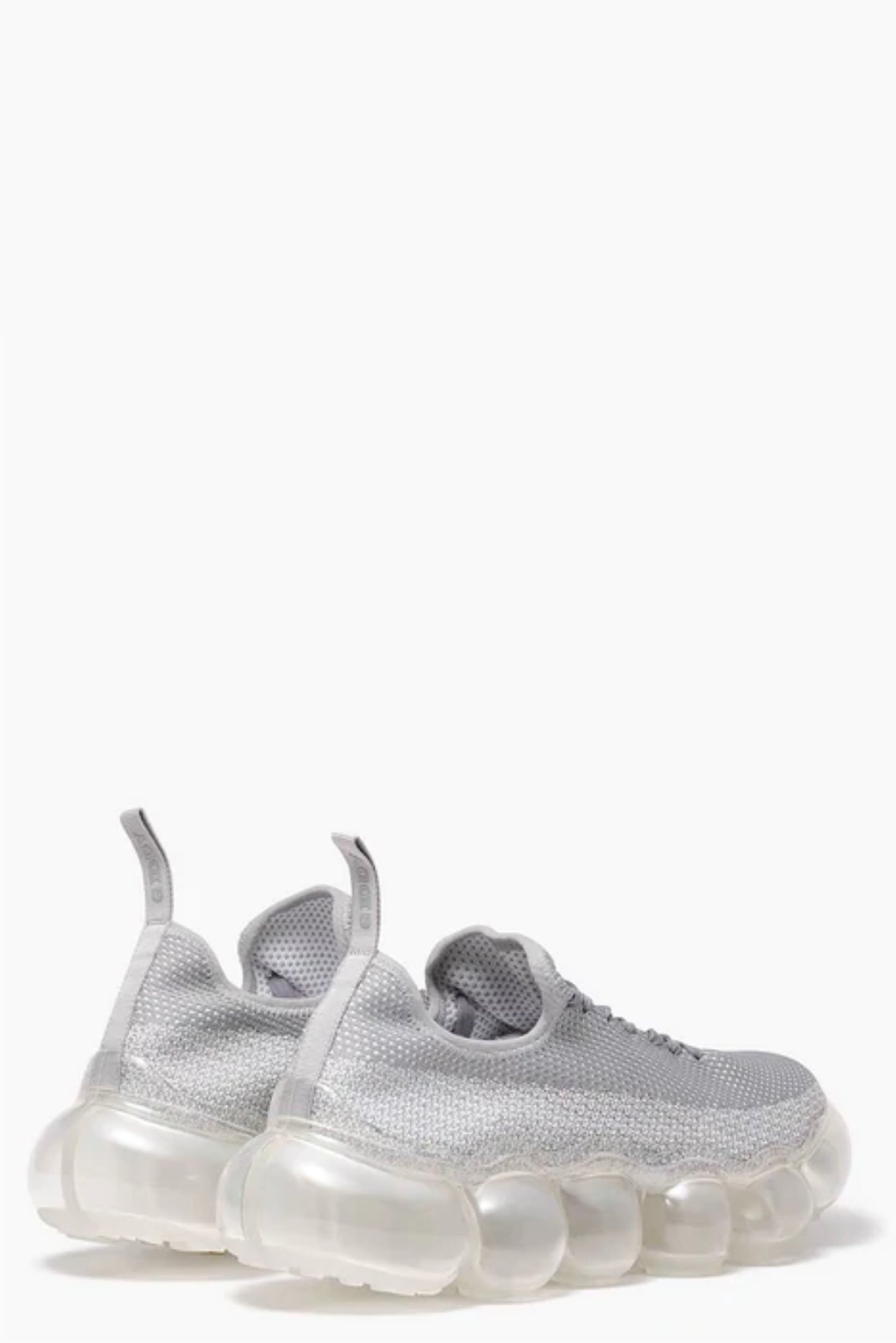 Thick Black clear soles made of transparent spheres reminiscent of jewelry draw the wearer's and viewer's attention to wearer's feet. Each sphere is designed to move softly with the movement of your foot, giving you a unique walking and gripping experience. In addition, the flexibility of the material is controlled to provide optimal cushioning when worn, creating a fluffy, floating sensation that you can't feel when you touch them with your hands.The Black knit upper, which is simple in contrast to the distinctive shape of the outsole, is deliberately minimalist in order to match with a wide range of fashion. The heel is voluminous, it is transparent to reduce the appearance of weight.