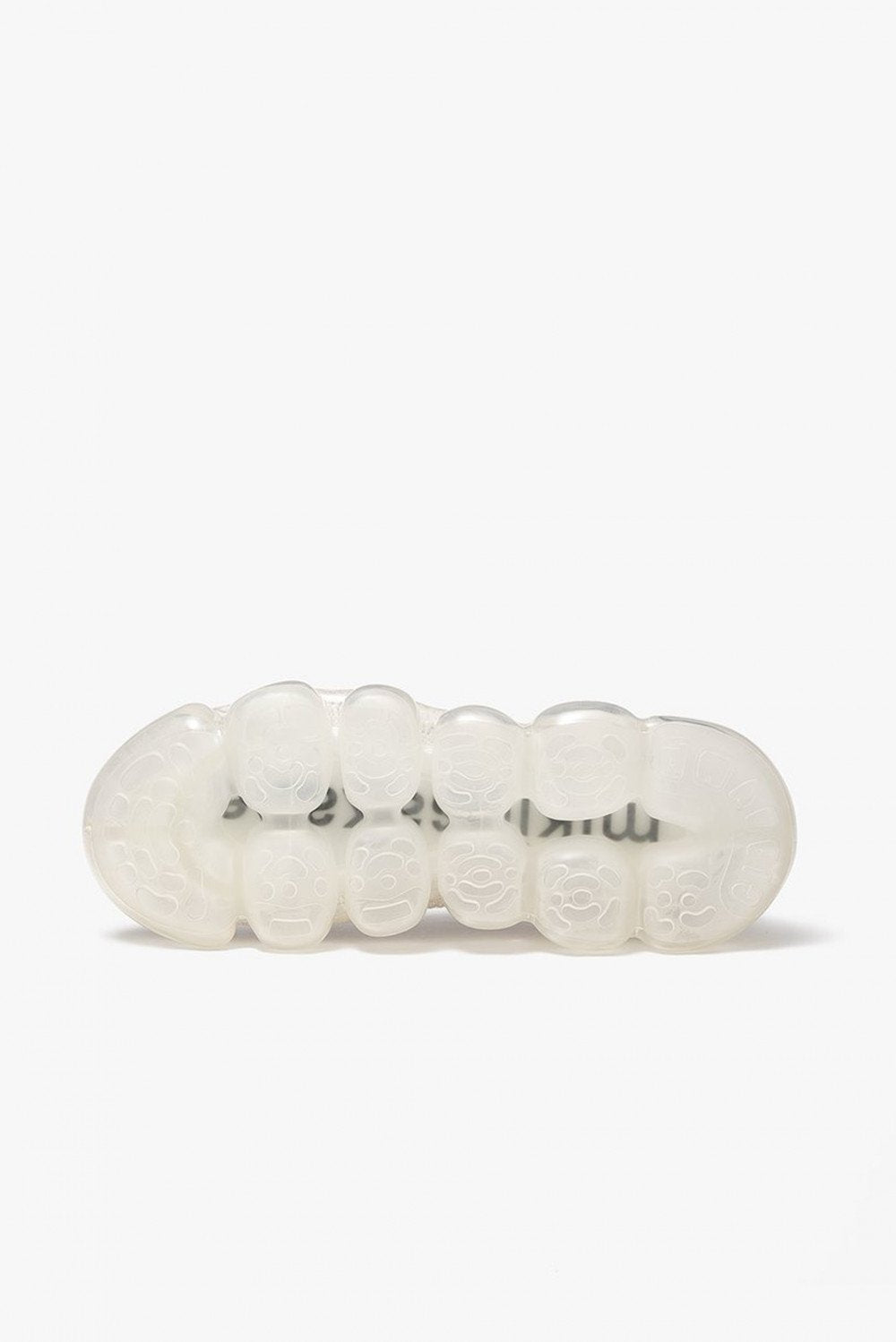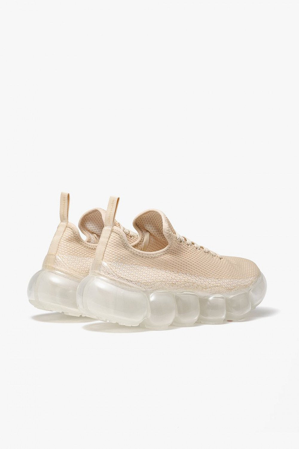 Grounds translates the pulse of Japanese youth into bold shoe design as seen with the grounds Jewelry Nude Clear. Shoes that are wearable jewelry designed by MIkio Sakabe. Thick-soled clear soles made of transparent spheres reminiscent of jewelry draw the wearer's and viewer's attention to wearer's feet. The sole has a matte finish, giving it a clean sole. Each sphere is designed to move softly with the movement of your foot, giving you a unique walking and gripping experience. In addition, the flexibility of the material is controlled to provide optimal cushioning when worn, creating a fluffy, floating sensation that you can't feel when you touch them with your hands. The knit upper, which is simple in contrast to the distinctive shape of the outsole, is deliberately minimalist in order to match with a wide range of fashion. The height of the heel is about 5 cm for all sizes, and while the heel is voluminous, it is transparent to reduce the appearance of weight.