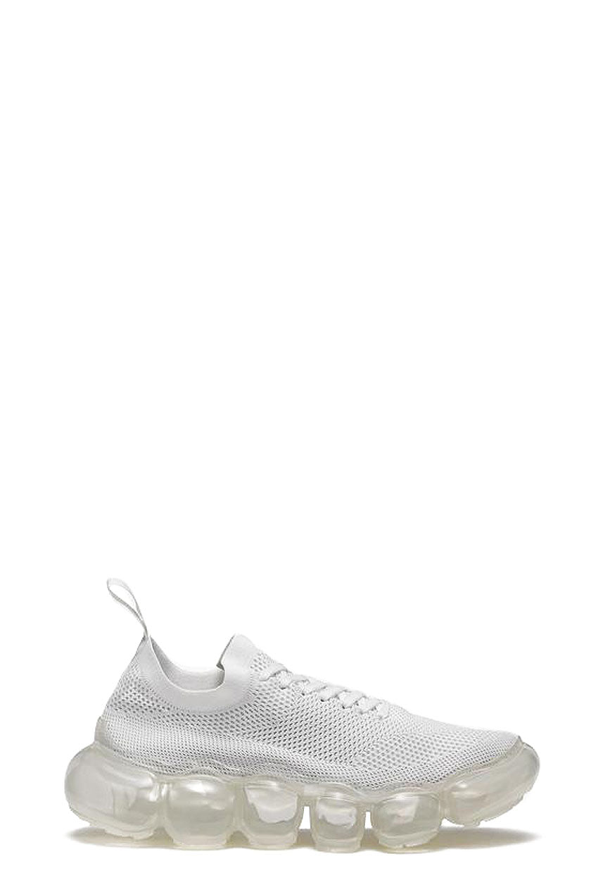 Thick Black clear soles made of transparent spheres reminiscent of jewelry draw the wearer's and viewer's attention to wearer's feet. Each sphere is designed to move softly with the movement of your foot, giving you a unique walking and gripping experience. In addition, the flexibility of the material is controlled to provide optimal cushioning when worn, creating a fluffy, floating sensation that you can't feel when you touch them with your hands.The Black knit upper, which is simple in contrast to the distinctive shape of the outsole, is deliberately minimalist in order to match with a wide range of fashion. The heel is voluminous, it is transparent to reduce the appearance of weight.