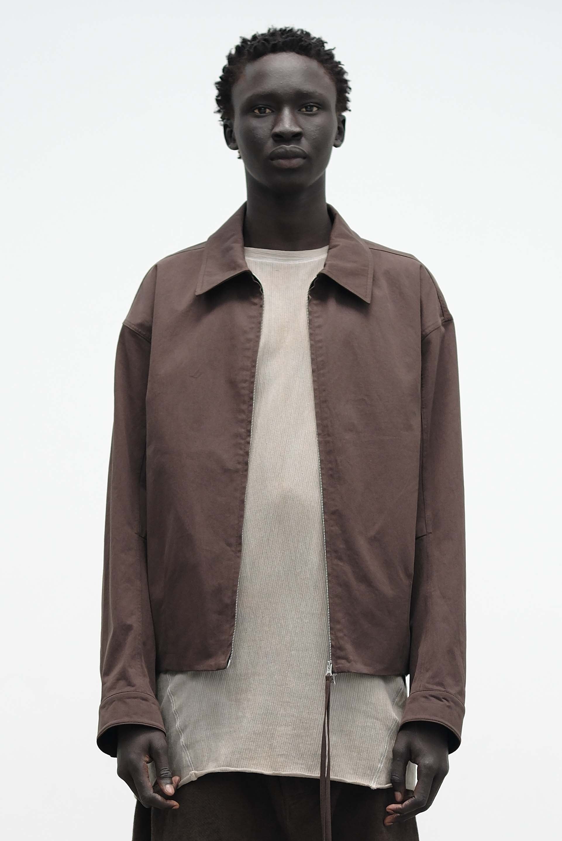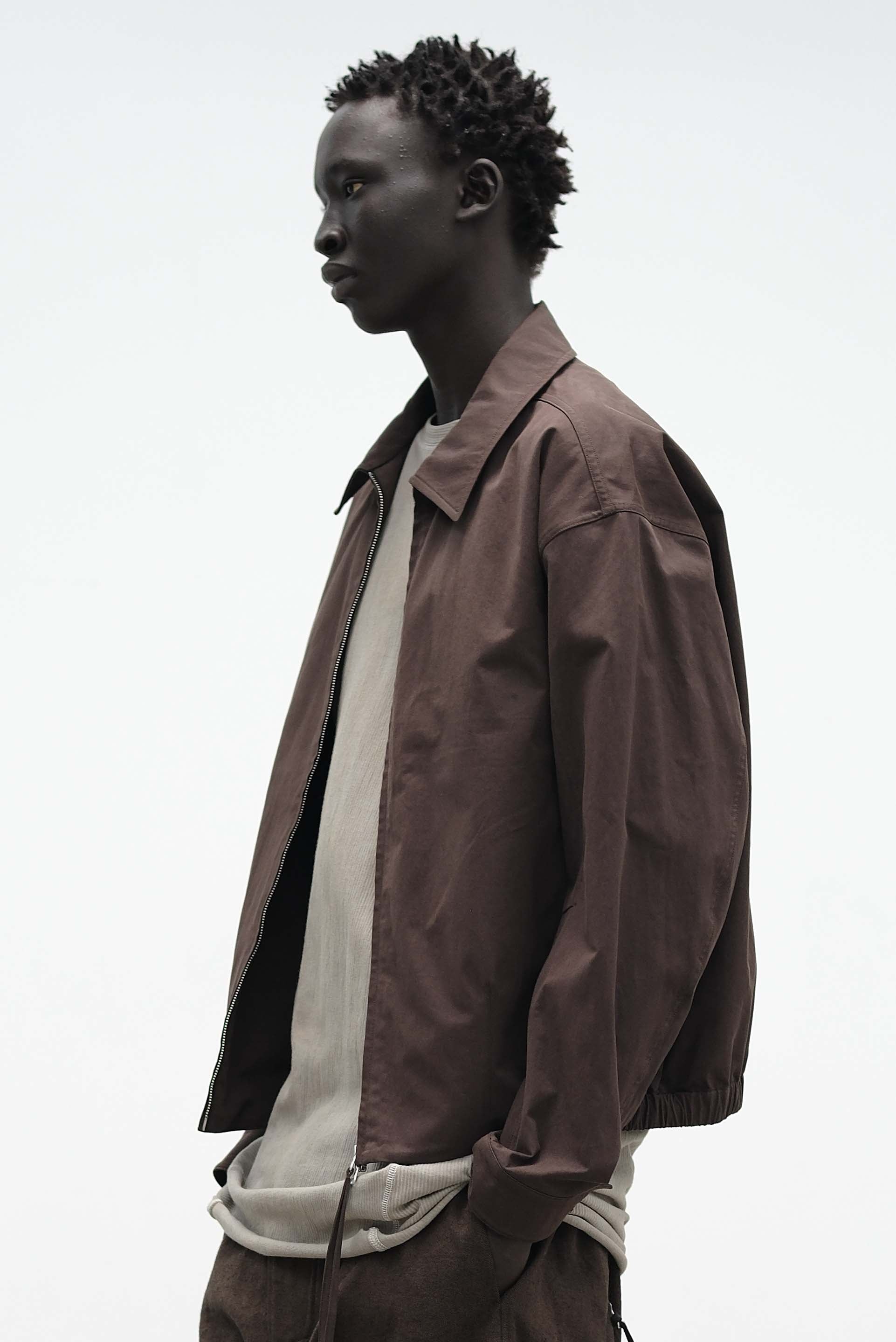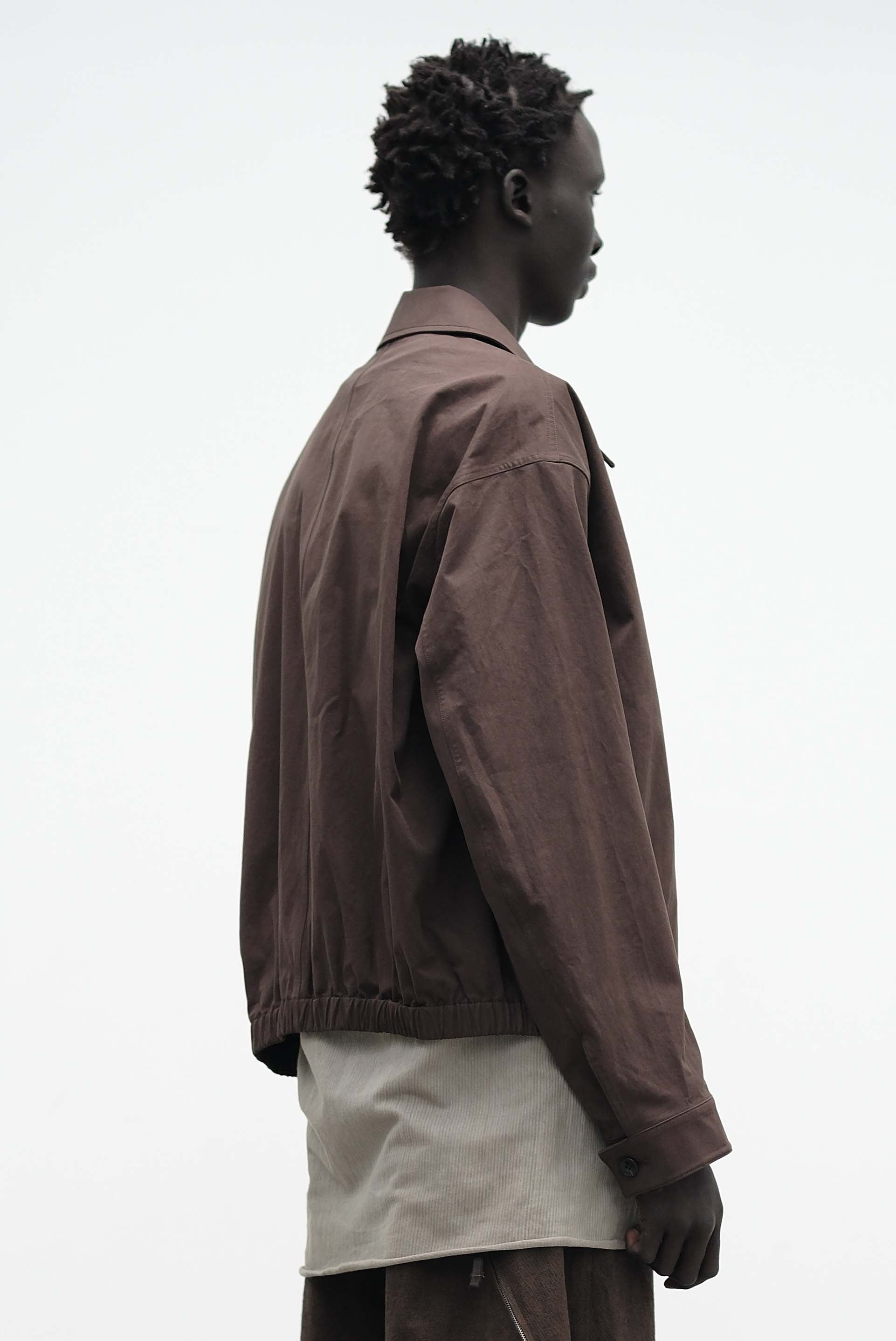 Attempt Knight Jacket Brown. Linen Coach jacket. Long sleeves. Regular collar. Two side pocket. Elasticated details at bottom. Double zip closure with long puller detail. Soft textural linen cotton fabric.