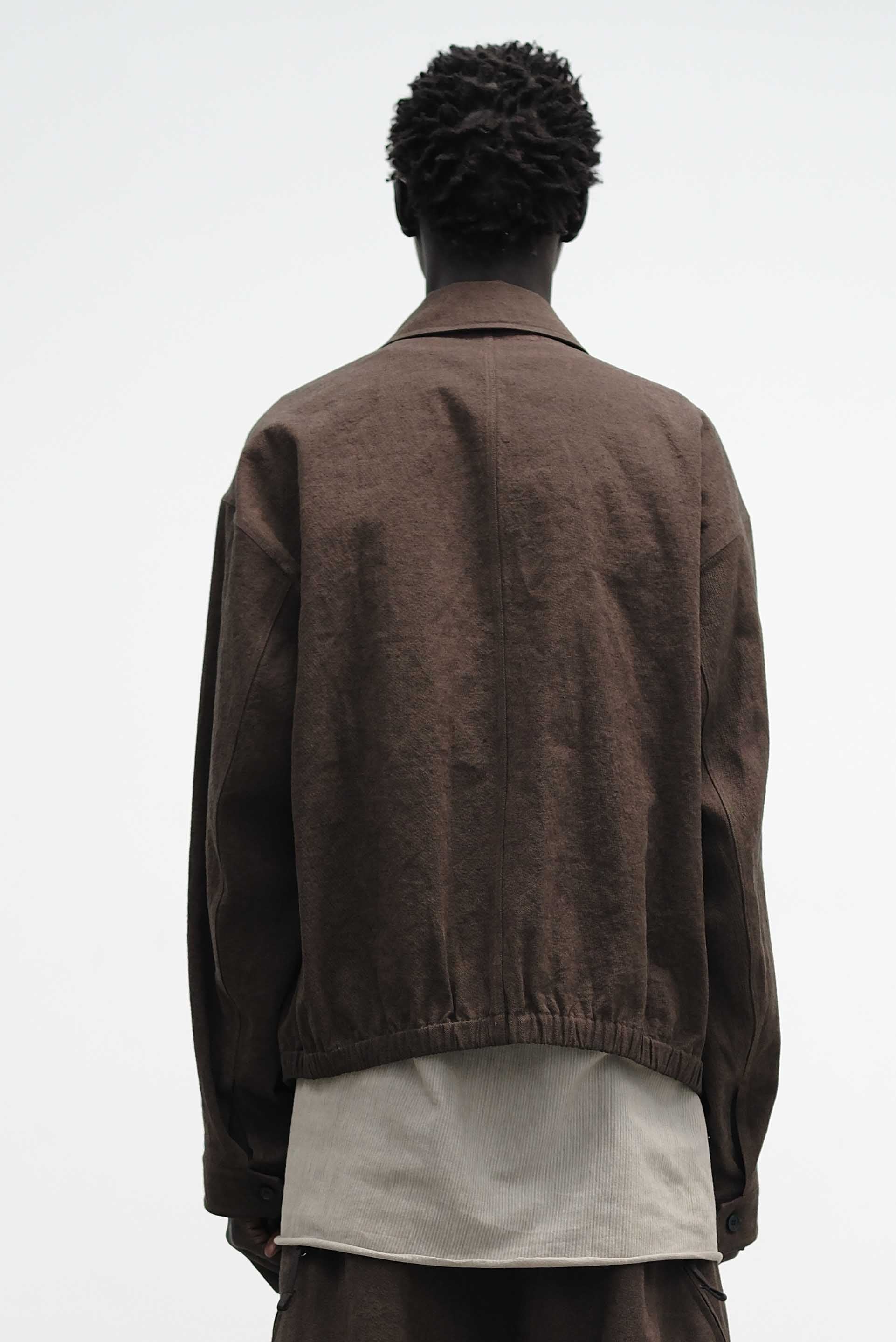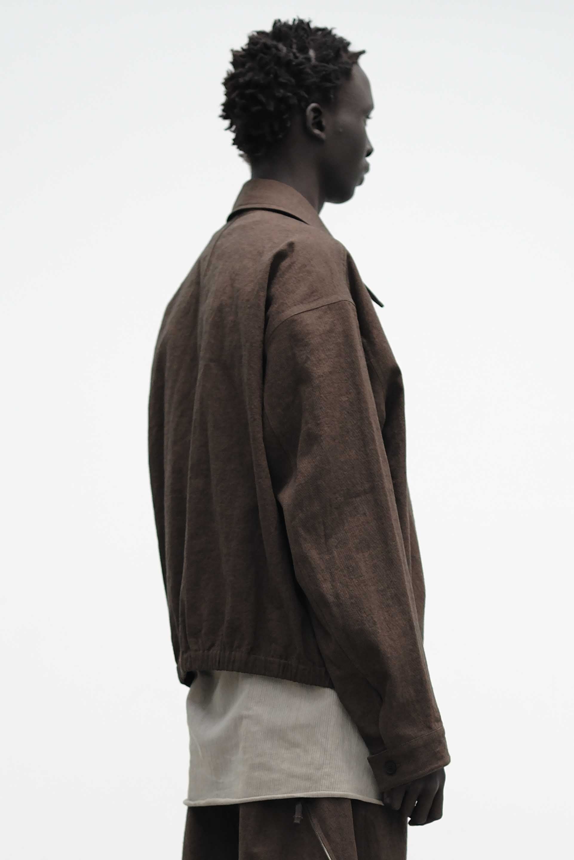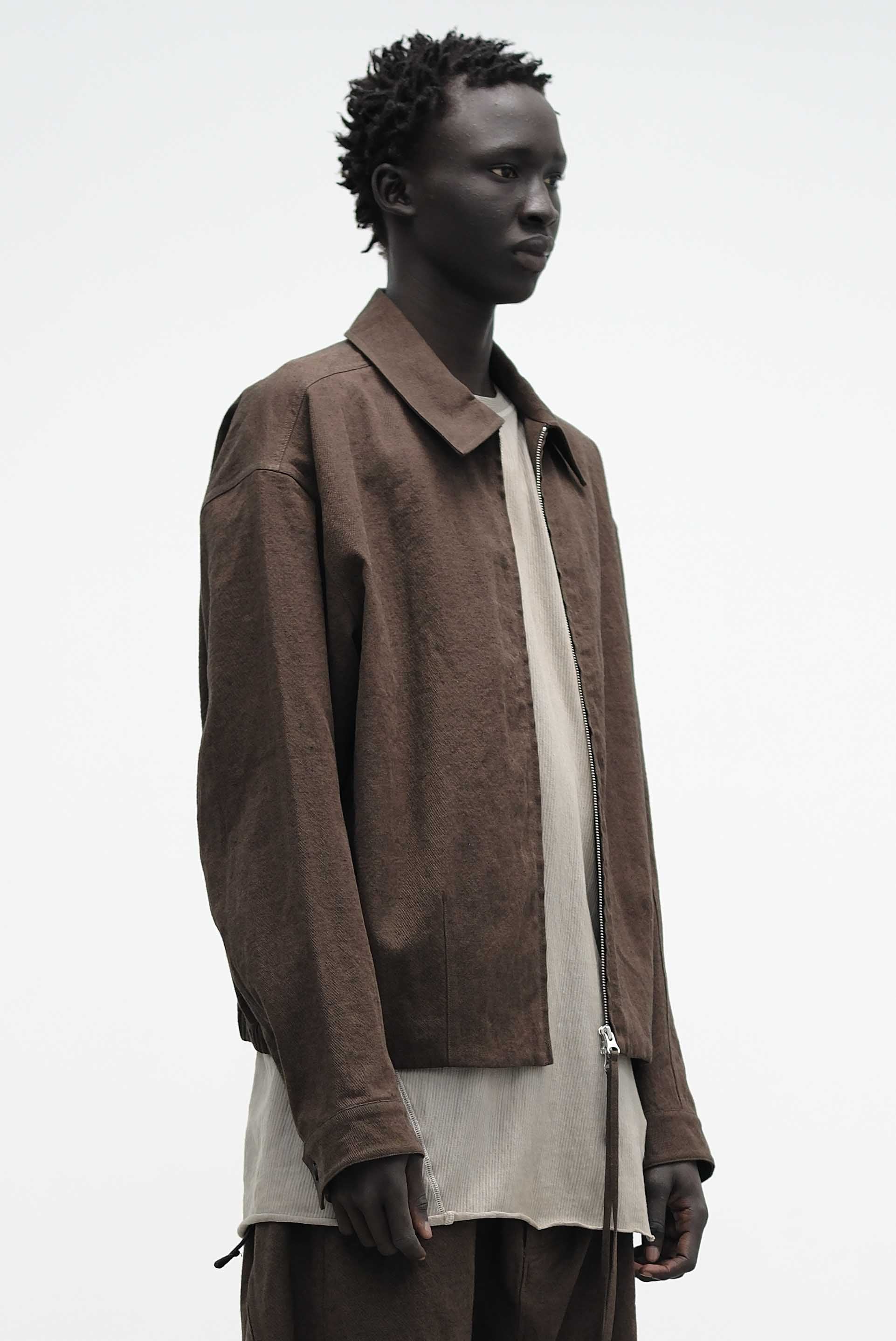 Attempt Knight Jacket Yellow Brown. Linen Coach jacket. Long sleeves. Regular collar. Two side pocket. Elasticated details at bottom. Double zip closure with long puller detail. Soft textural linen cotton fabric.
